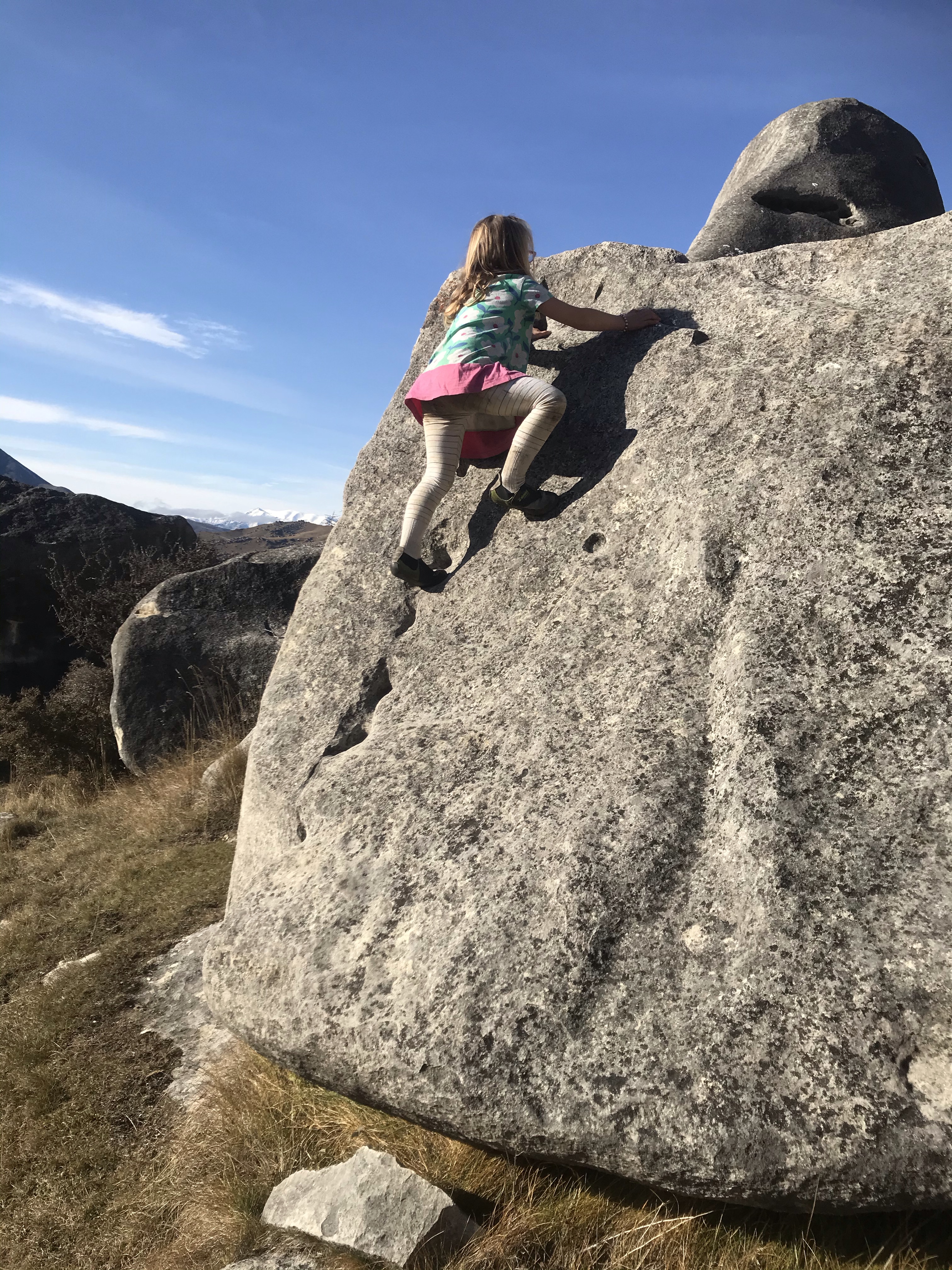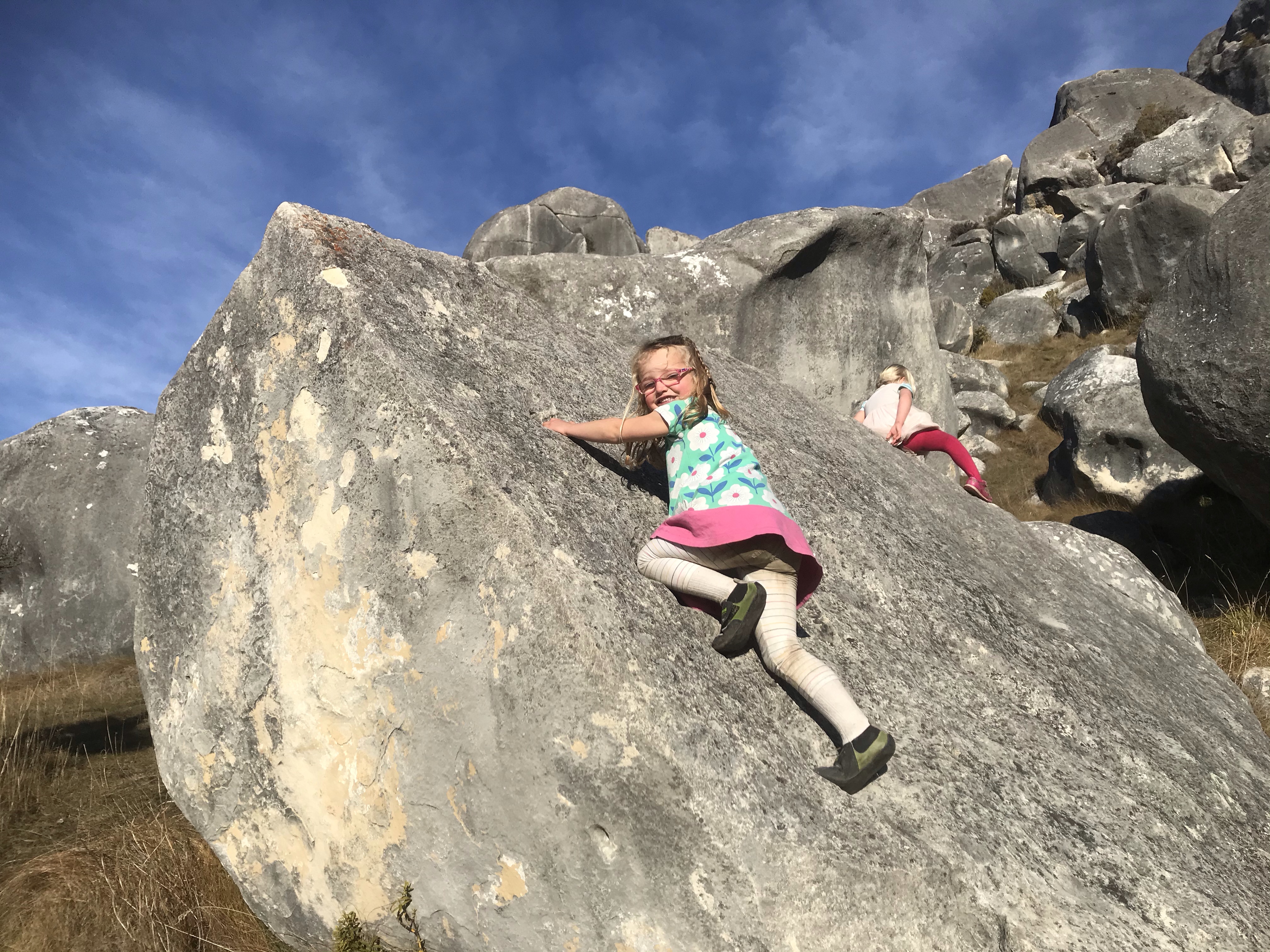 Once mummy had done her three day week it was back to the adventures and with rain forecast in Christchurch, but blue skies on the West Coast a last minute plan came together and we packed the van to bursting with bikes, boats, bouldering mats etc and headed west. First stop Castle Hill which compared to last time in the heat of summer was magical with snowy mountains all around, great friction and Spittle Hill beats Quantum Field hands down for interesting, varied bouldering plus the usual terrifying slopers to top out! Kids found an impressive amount of caves and Sara and Iona loved one route so much they did it about 30 times each!