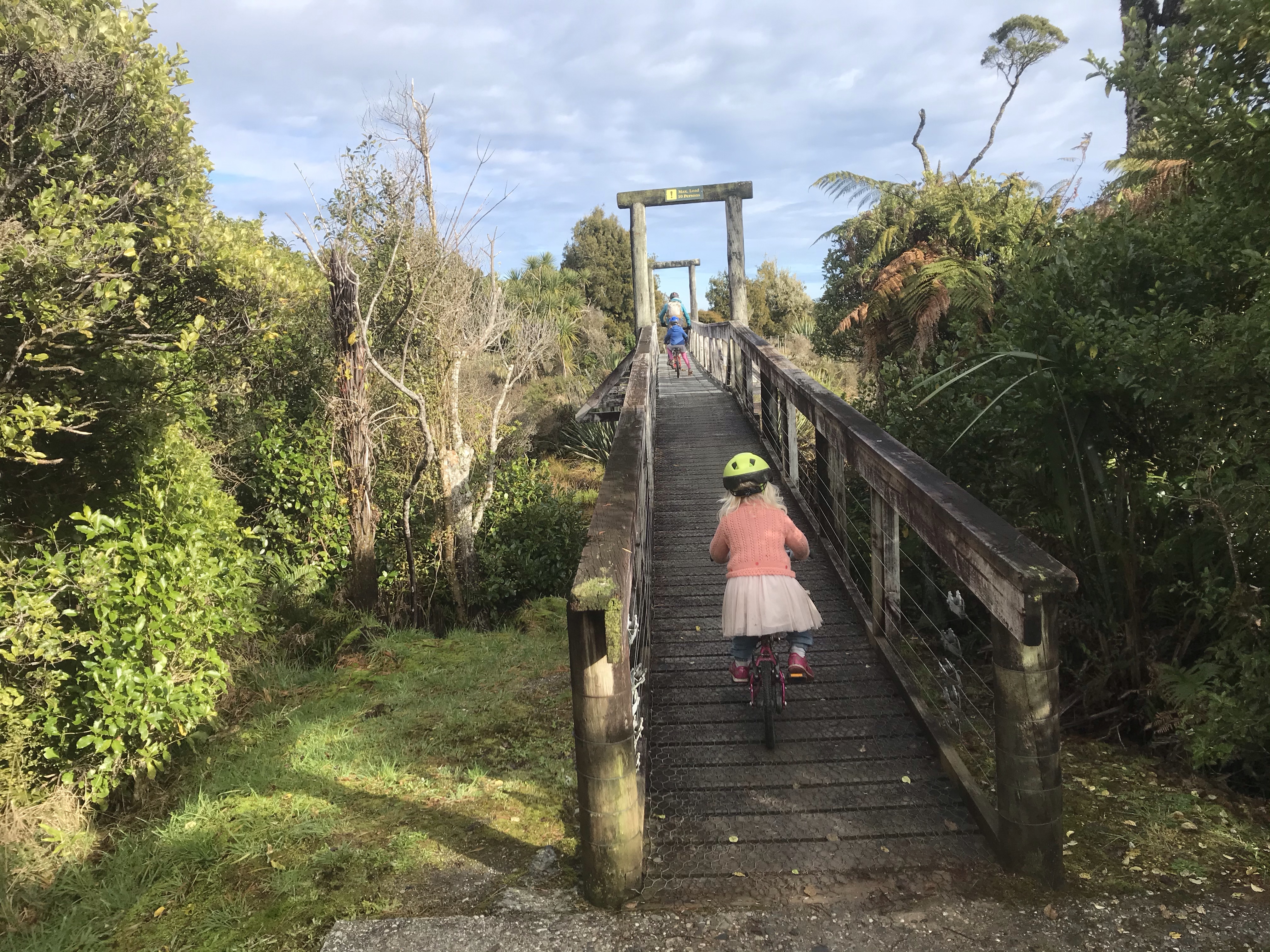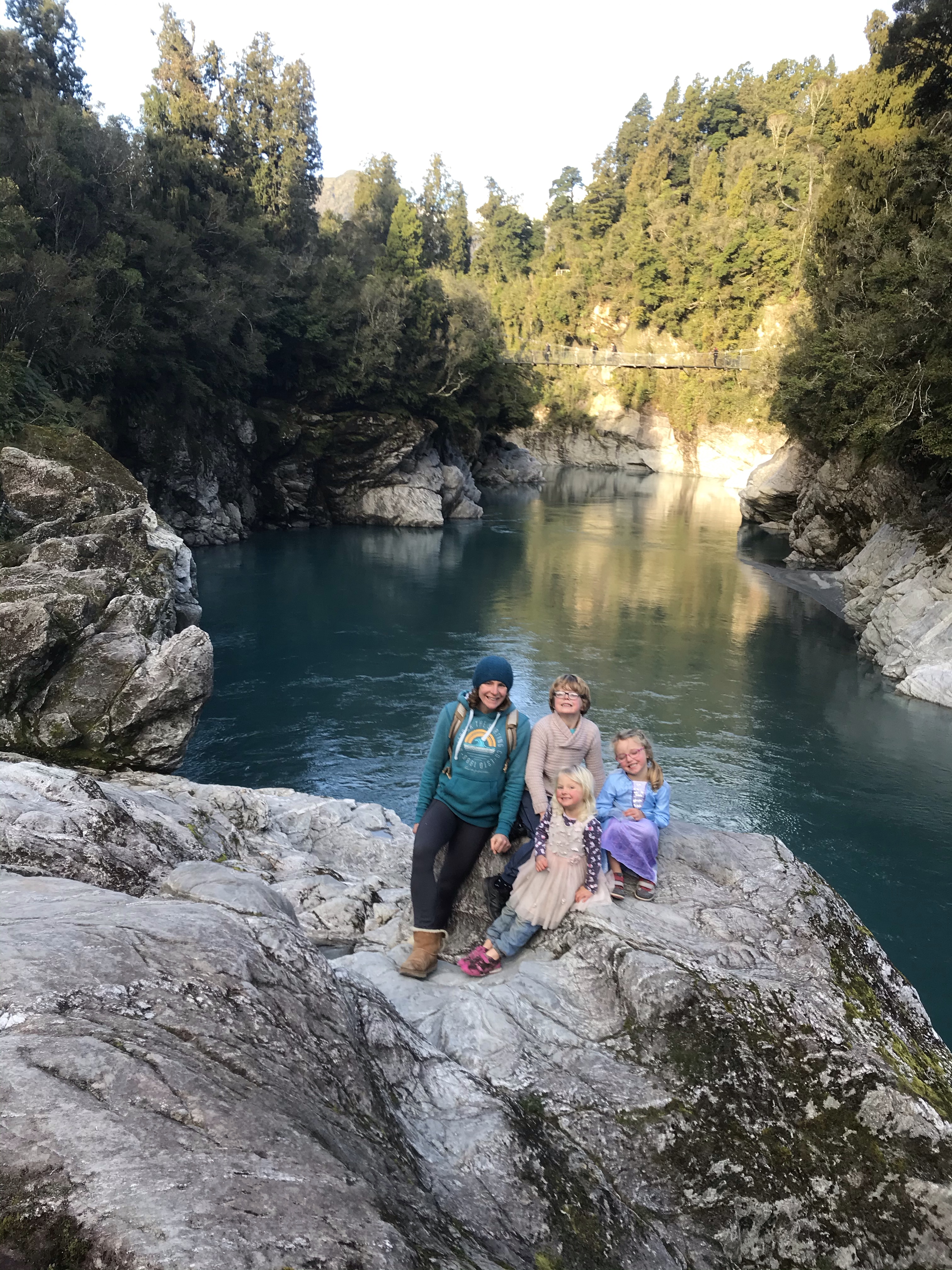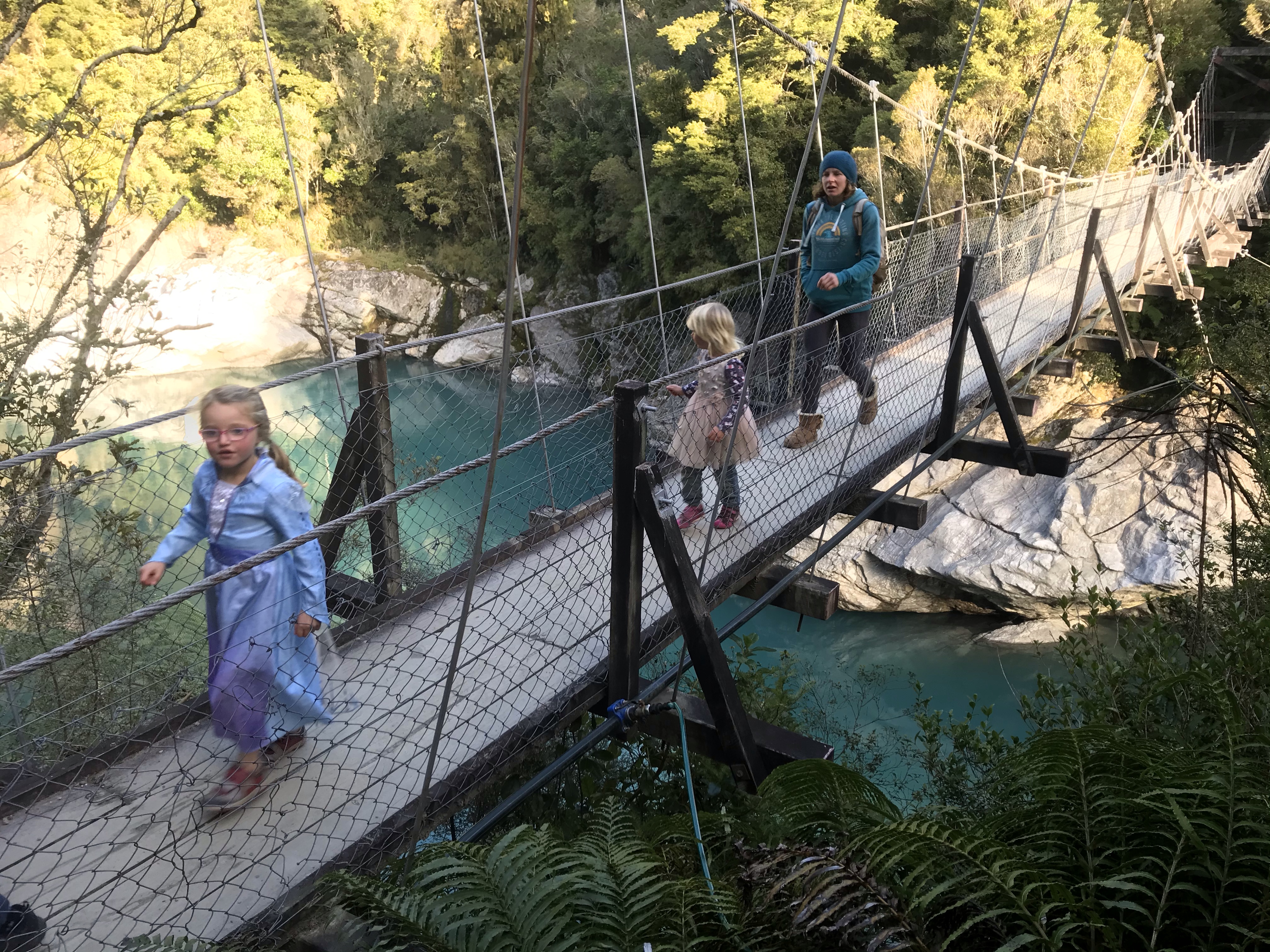 We stayed at the Hokitika Holiday park which had a nice little cabin with plenty of beds for everyone, a great kitchen and an impressive pirate ship tower and terrifying zip line. Almost no-one around too being “winter” and no tourists so we had the place to ourselves. Cold overnight temps for sure and hard frosts (Em did suggest camping in her usual style!!) but very pleasant if you were in the sun in the middle of the day for the few hours of sunshine. Next day was biking some more of the Wild West Coast Wilderness Trail, this time the 10 mile section to Lake Mahinapua and back, freezing in the thick forest out of the sun and some technical roots for daddy to test his skills on the final descent to the lake. A quick whizz down to the clear blue waters of the Hokitika gorge in the afternoon, sadly far too cold for swimming or SUP but definitely worth a visit.