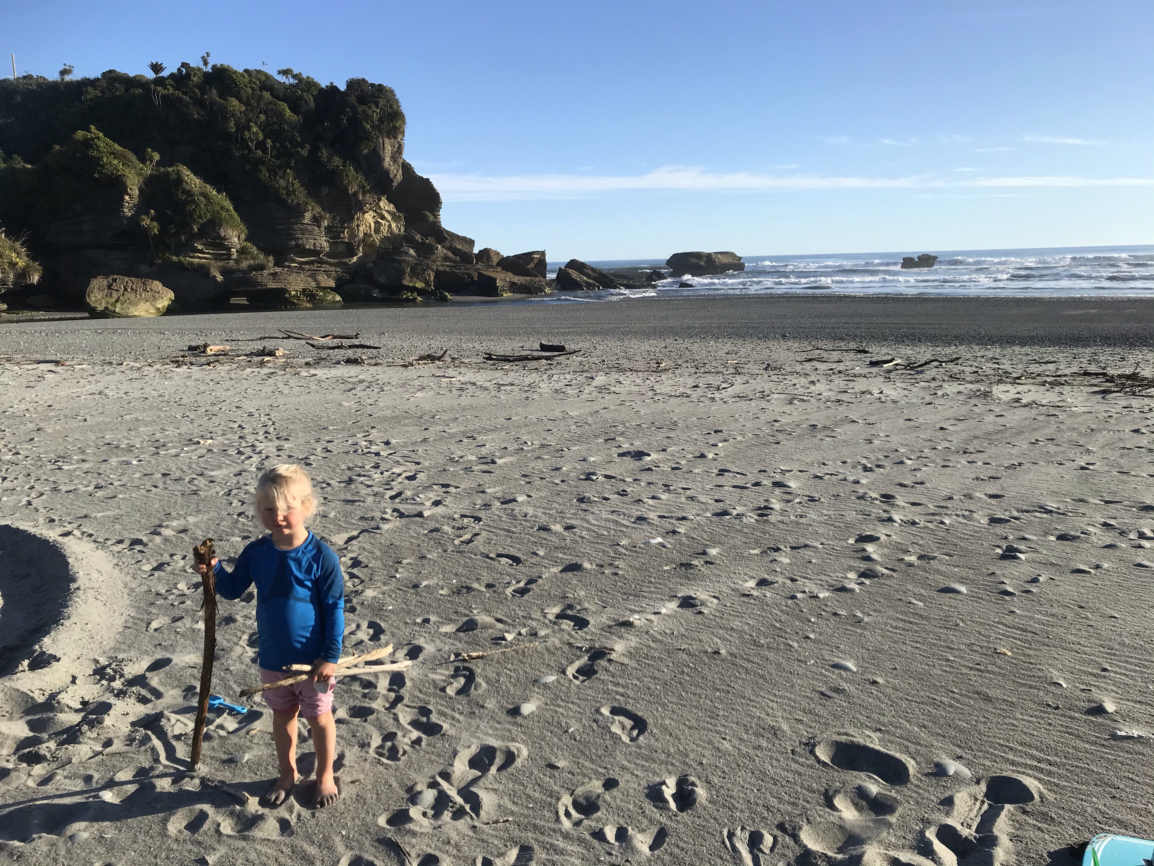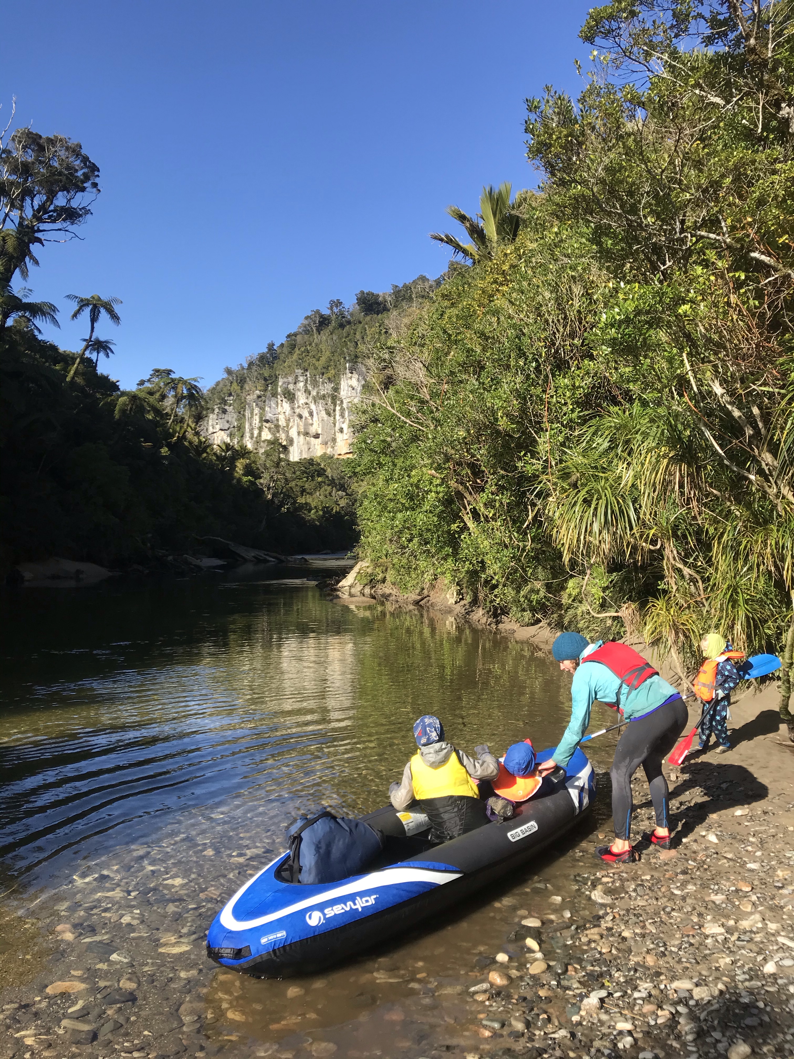 Last full day of the trip and we could resist the lure of the clear blue water no longer and drove North past Greymouth to Paparoa and opted for boating on the Pororari river near to Punakaiki, this was a bit of a gamble as the steep rock sided gorge doesn’t get much sun. We launched in sunshine but soon after went into a chilly gorge and paddling upstream against the current was hard work for me and Em and I had to get out and push the boat a few times, icy on the toes for sure. The kids hands started to turn blue(!) so after one rapid too many we turned and retreated, much more fun going downstream and in retrospect we should have walked up the valley and boated back down. After sharing a very pleasant sunny lunch with some local wildlife in the carpark we went to the nearby stunning Punakaiki beach instead for some bumpy surfing and some great caves to explore. Rounded the day off nicely with sunset fish and chips on the beach.