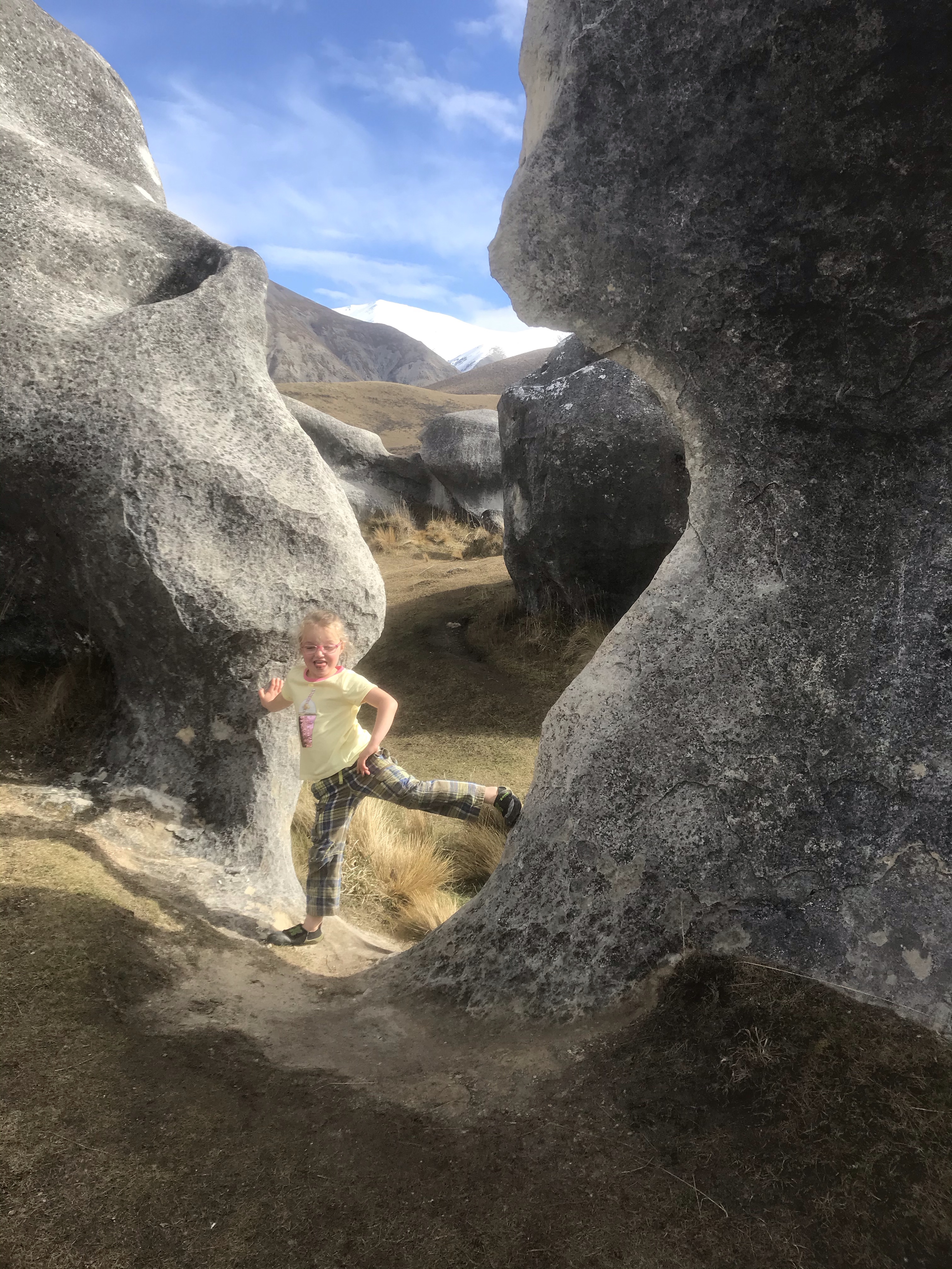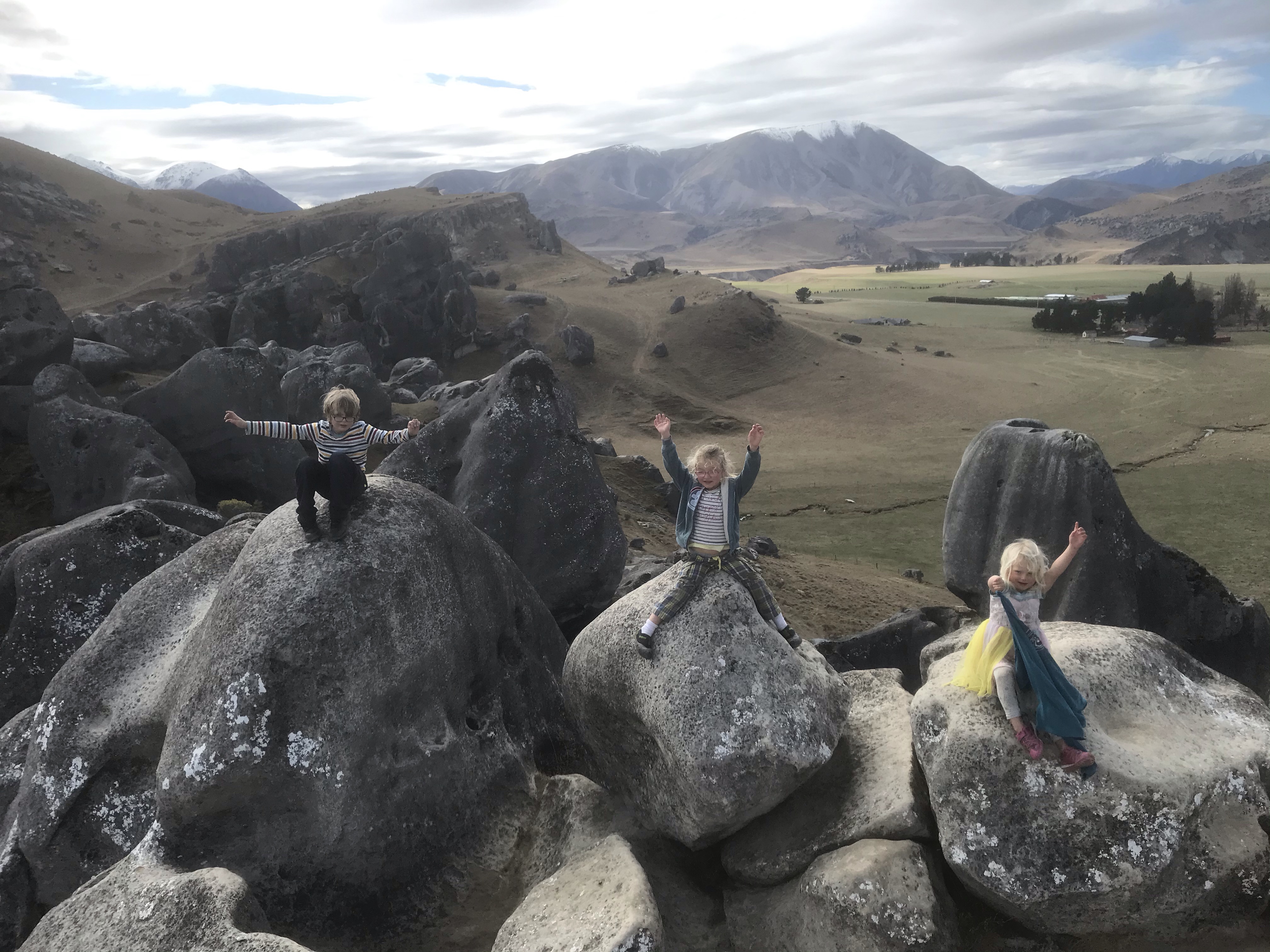After a few quieter weekends at home with day trips we all longed for a weekend away but without the long drives so opted for a night in Springfield which is one hour west of home at the foot of the Southern Alps. This meant we could ski at Porters in the sunshine yet again and also go back to Castle Hill for some more fun on the rocks the next day. Same places for sure, but still great every time! A nice touch was waking to an impressive cloud inversion with only the hills poking out and then driving through the murk right to the same sunny hills for skiing! The kids even managed to sneak a sledge or two onto the magic carpet at Porters Pass which caused much amusement! The Sheffield Hotel is a cracking place for dinner with friendly staff and great food – Seafood Chowder and Garlic Bread comes highly recommended, and Smilie’s YHA in Springfield was also a lovely place to stay (2 bed apartment for 170 dollars pretty cheap!), oozing charm and quirkiness and even had friendly pigs on site.