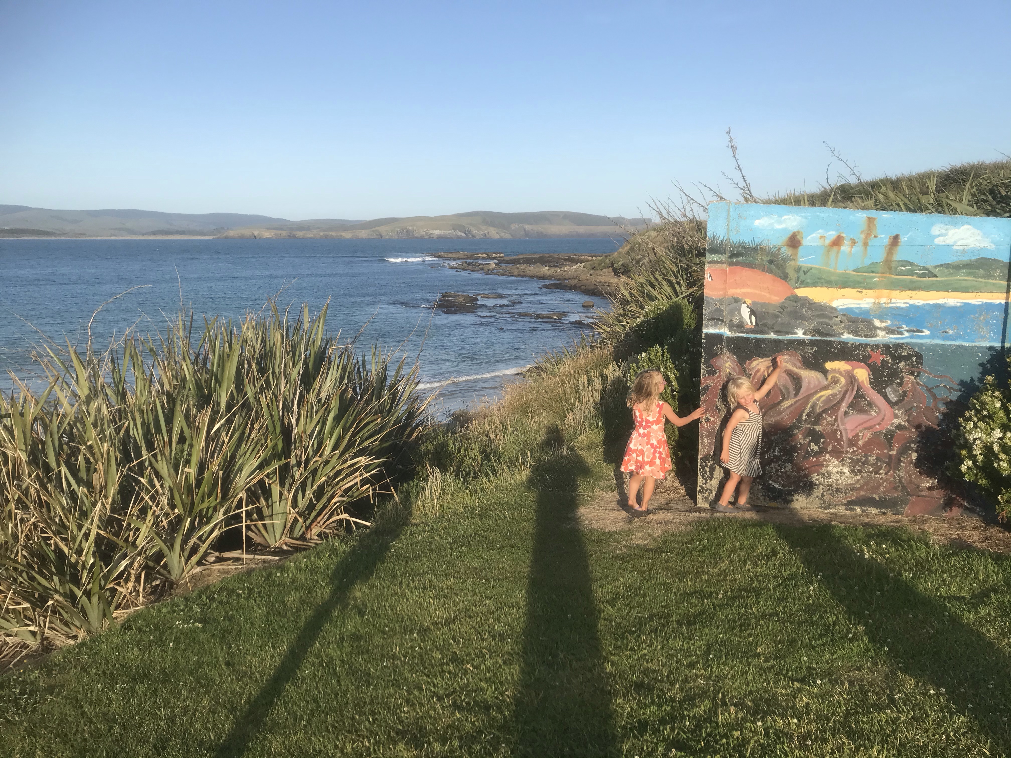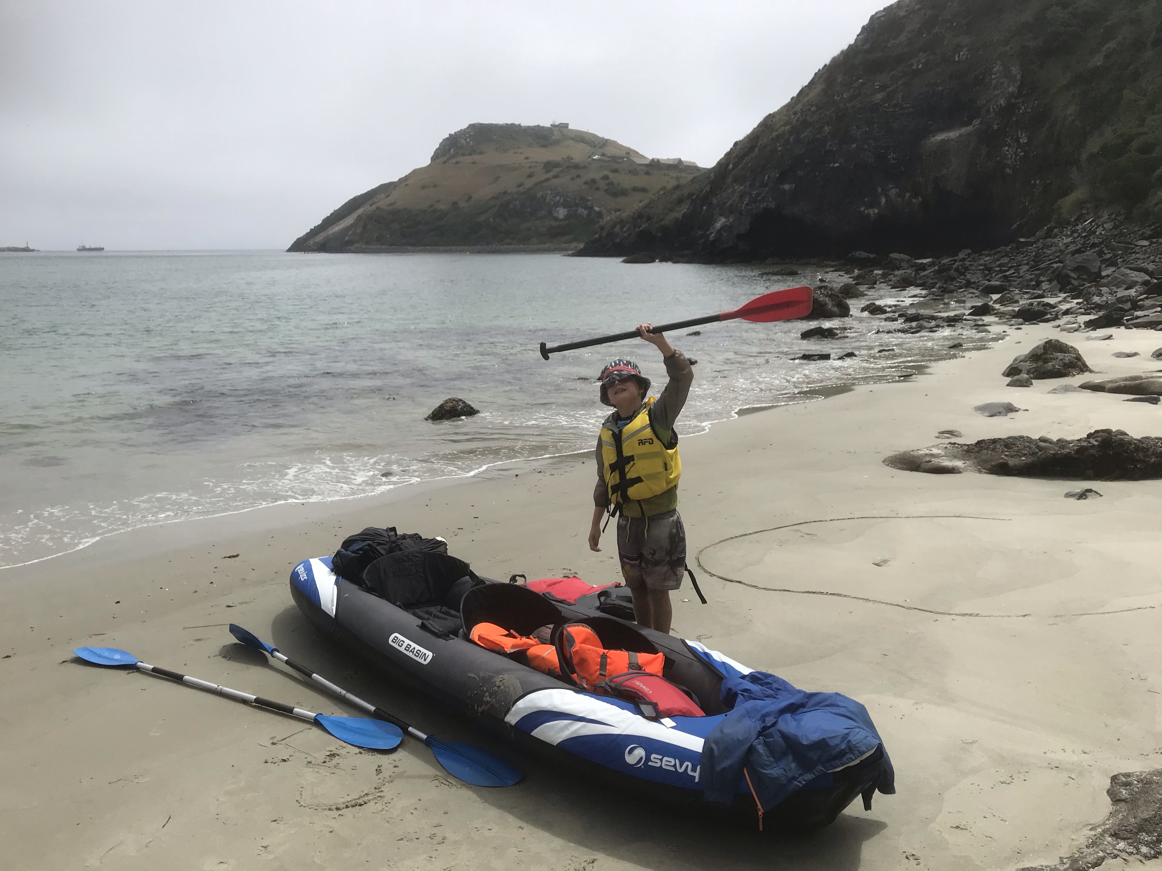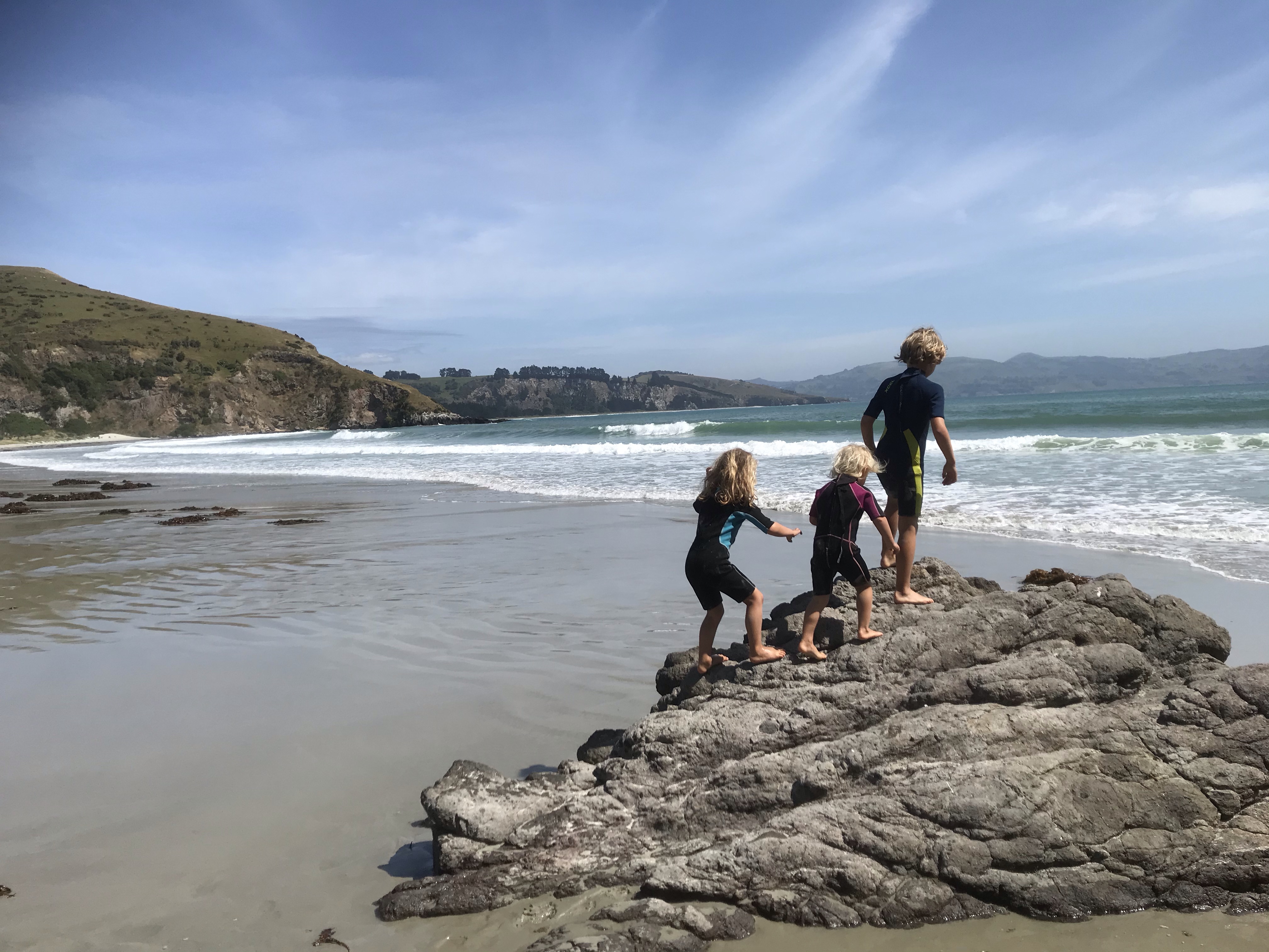 Onto our final destination for the trip Dunedin and a trip to the Otago peninsula that we planned this time last year but a broken fan-belt in the car meant we had to miss out and do city stuff instead. A quick lumpy surf en route at a windy Kaka point and we rocked up at Portobello Holiday Park (which is a famous beach in Edinburgh!) right in the middle of the peninsula, a blissfully clean and quiet campsite and everyone enjoyed their first shower in four days! The good weather continued so we set out the next day keen to use the inflatable canoe for the first time on the trip and find some wildlife which the peninsula is famous for, after a couple of false starts due to locked gates and closed beaches (selfish penguins!) we launched a few km further south than planned and whizzed round to the very tip of Taiaroa Head where we found a ridiculous amount of seals, albatrosses, oystercatchers and many other interesting birds to look at, all sheltering under dramatic cliffs under the lighthouse. We enjoyed the wind and tide pushing us back and had a great picnic lunch and swim on a remote beach, if you’re going to only have one paddle on a trip (The Te Anau planned river one was cancelled due to the weather) you might as well make it a good one. We finished the day hunting penguins at the excellent Penguin Place, an informative talk and then we met lots of Yellow Eyed penguins up close in the reserve before heading out onto another remote beach to hunt for ones in the wild. The kids loved finding tiny blue eyed penguins nesting in small manmade boxes and though we never quite saw the penguins coming in from the sea we enjoyed following the trenches (to keep you hidden from animals) and saw yet more seals and sea lions.