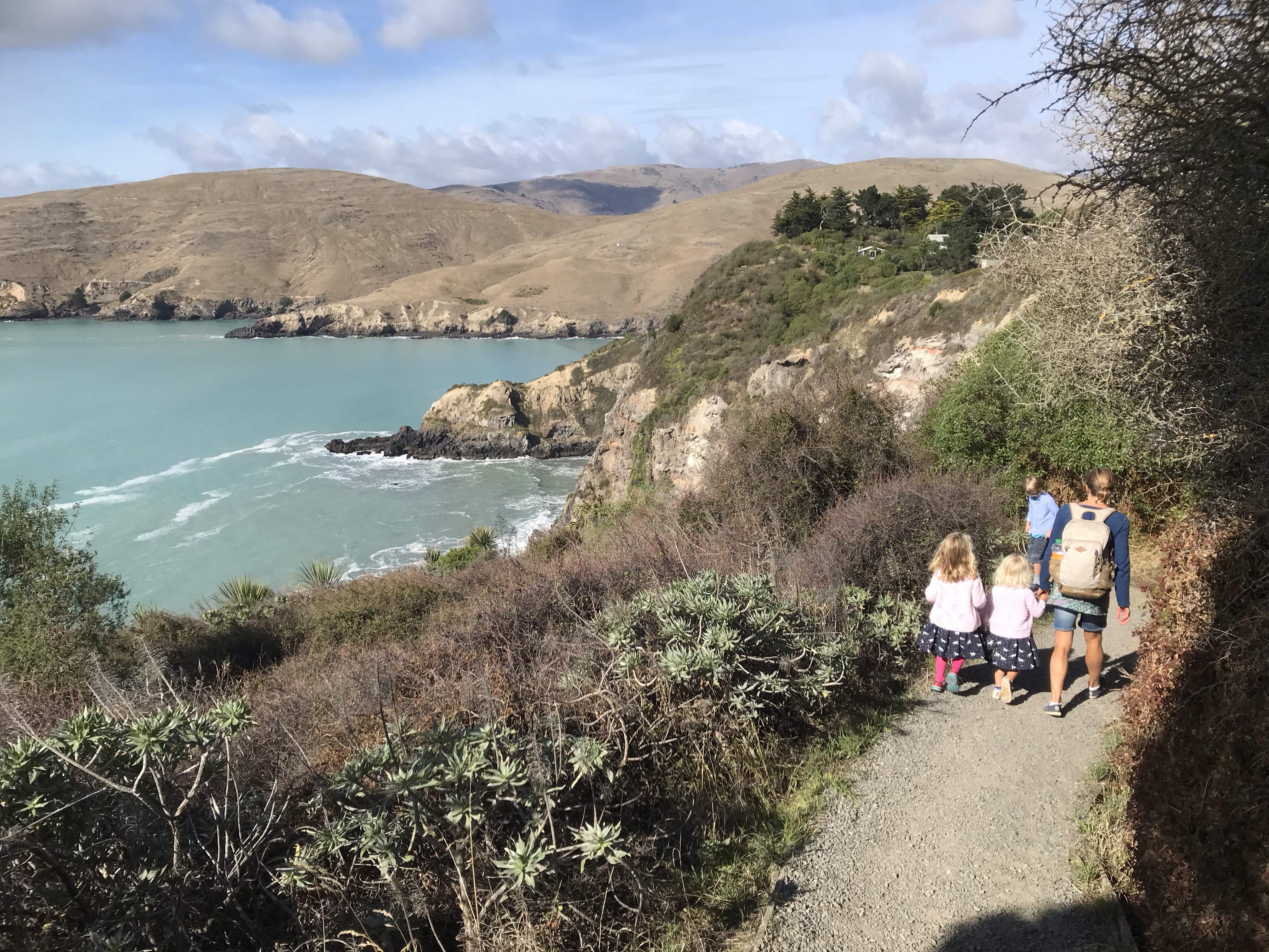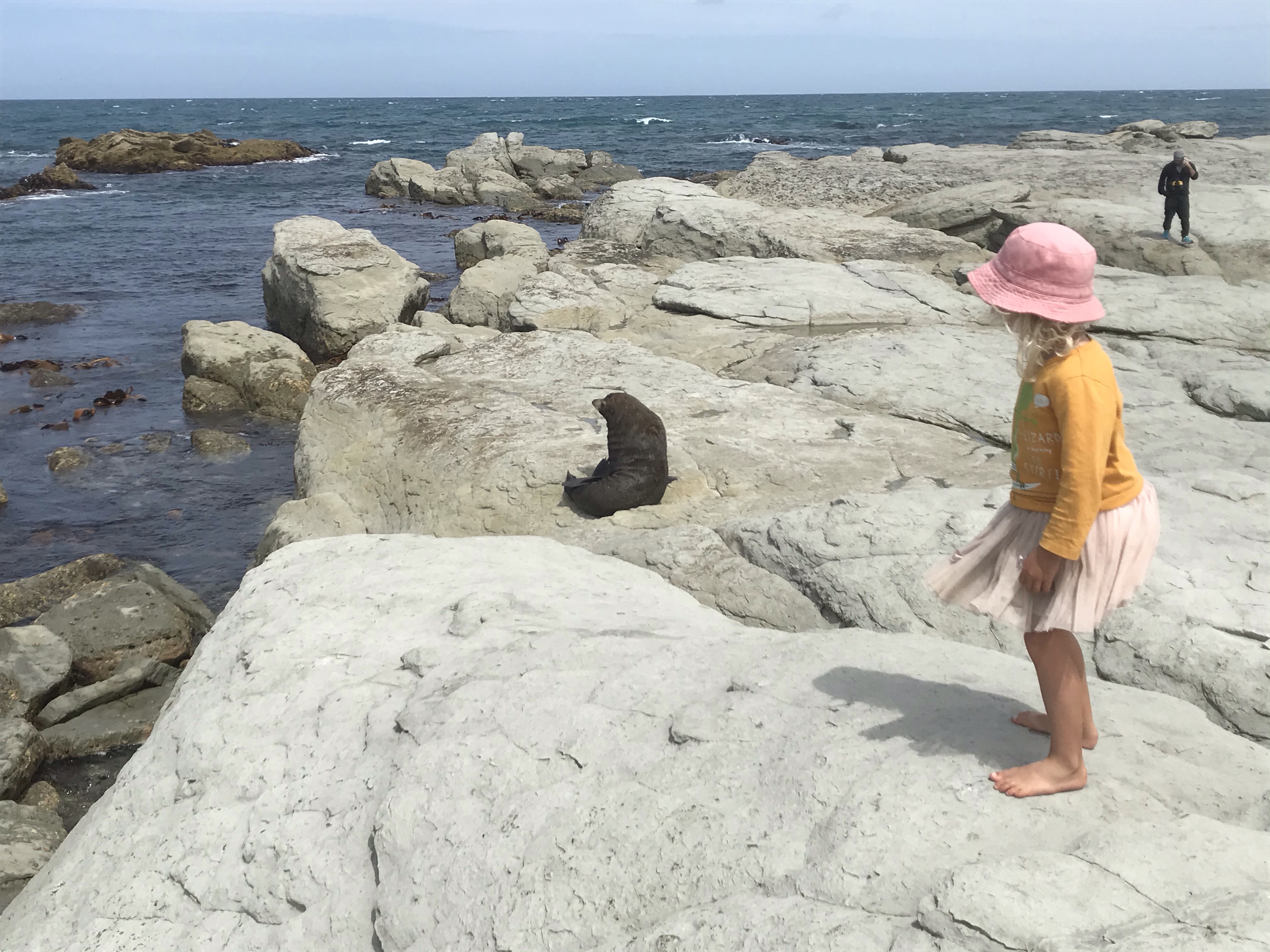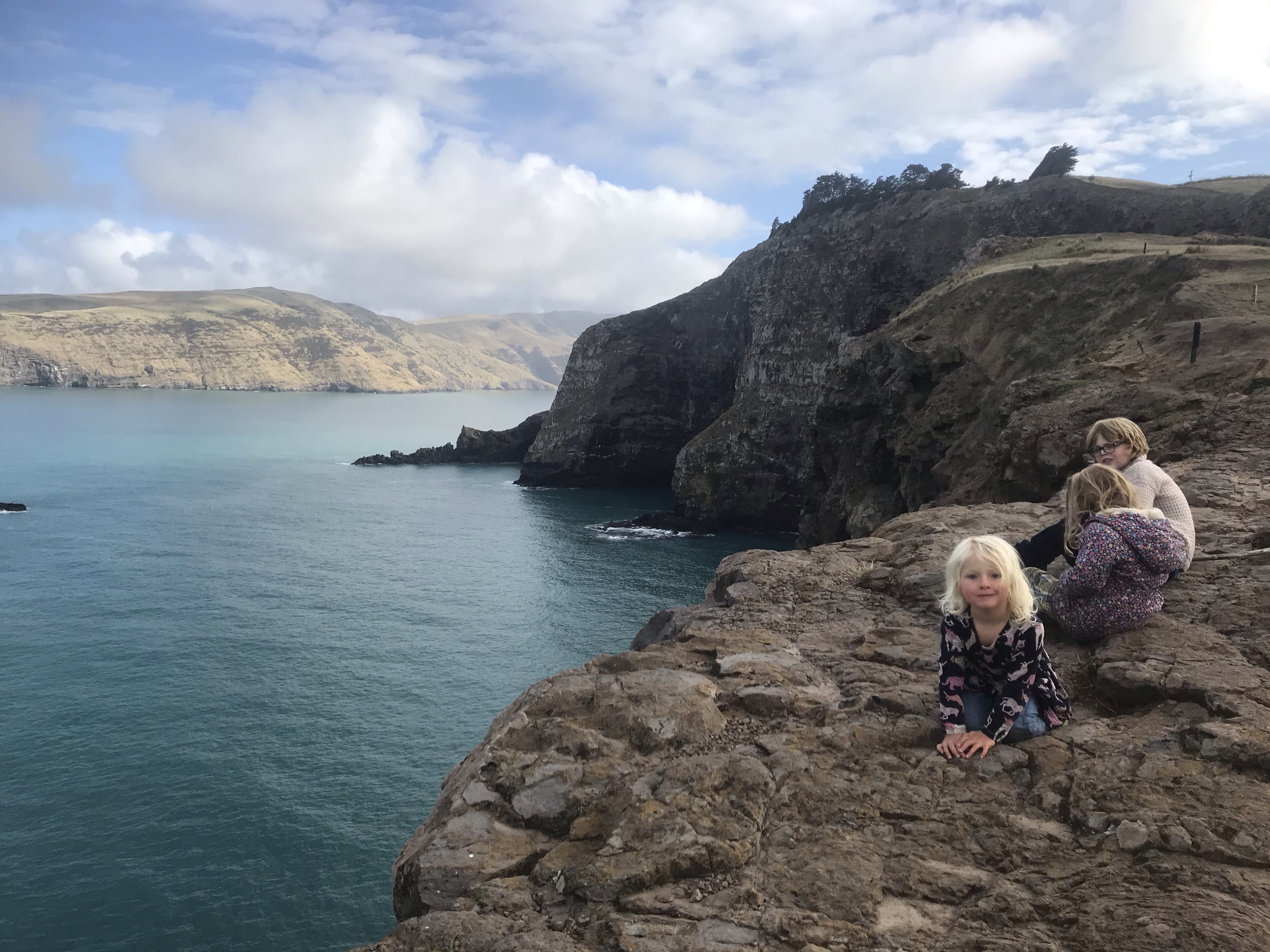 Onto our final destination for the trip Dunedin and a trip to the Otago peninsula that we planned this time last year but a broken fan-belt in the car meant we had to miss out and do city stuff instead. A quick lumpy surf en route at a windy Kaka point and we rocked up at Portobello Holiday Park (which is a famous beach in Edinburgh!) right in the middle of the peninsula, a blissfully clean and quiet campsite and everyone enjoyed their first shower in four days! The good weather continued so we set out the next day keen to use the inflatable canoe for the first time on the trip and find some wildlife which the peninsula is famous for, after a couple of false starts due to locked gates and closed beaches (selfish penguins!) we launched a few km further south than planned and whizzed round to the very tip of Taiaroa Head where we found a ridiculous amount of seals, albatrosses, oystercatchers and many other interesting birds to look at, all sheltering under dramatic cliffs under the lighthouse. We enjoyed the wind and tide pushing us back and had a great picnic lunch and swim on a remote beach, if you’re going to only have one paddle on a trip (The Te Anau planned river one was cancelled due to the weather) you might as well make it a good one. We finished the day hunting penguins at the excellent Penguin Place, an informative talk and then we met lots of Yellow Eyed penguins up close in the reserve before heading out onto another remote beach to hunt for ones in the wild. The kids loved finding tiny blue eyed penguins nesting in small manmade boxes and though we never quite saw the penguins coming in from the sea we enjoyed following the trenches (to keep you hidden from animals) and saw yet more seals and sea lions.