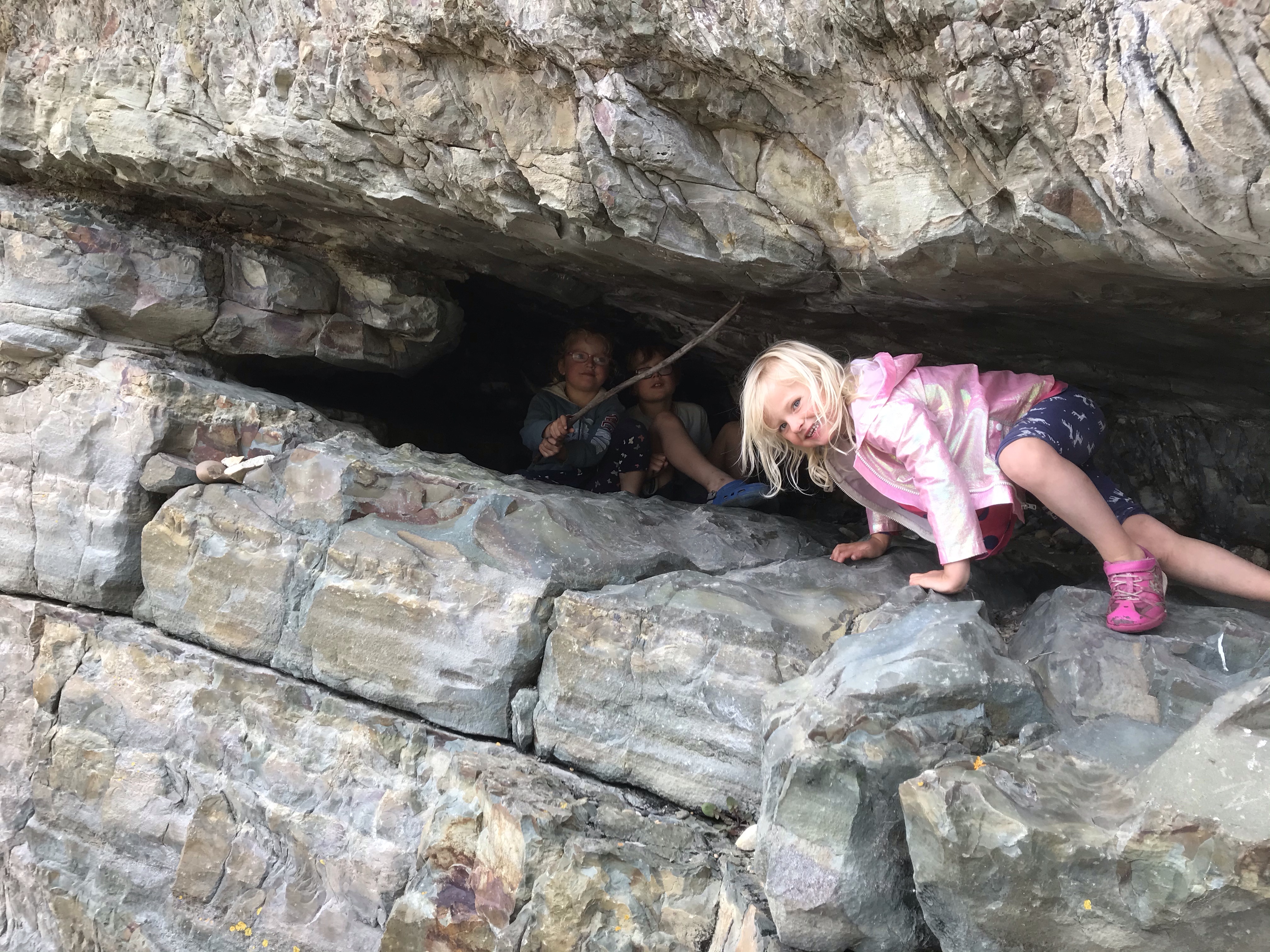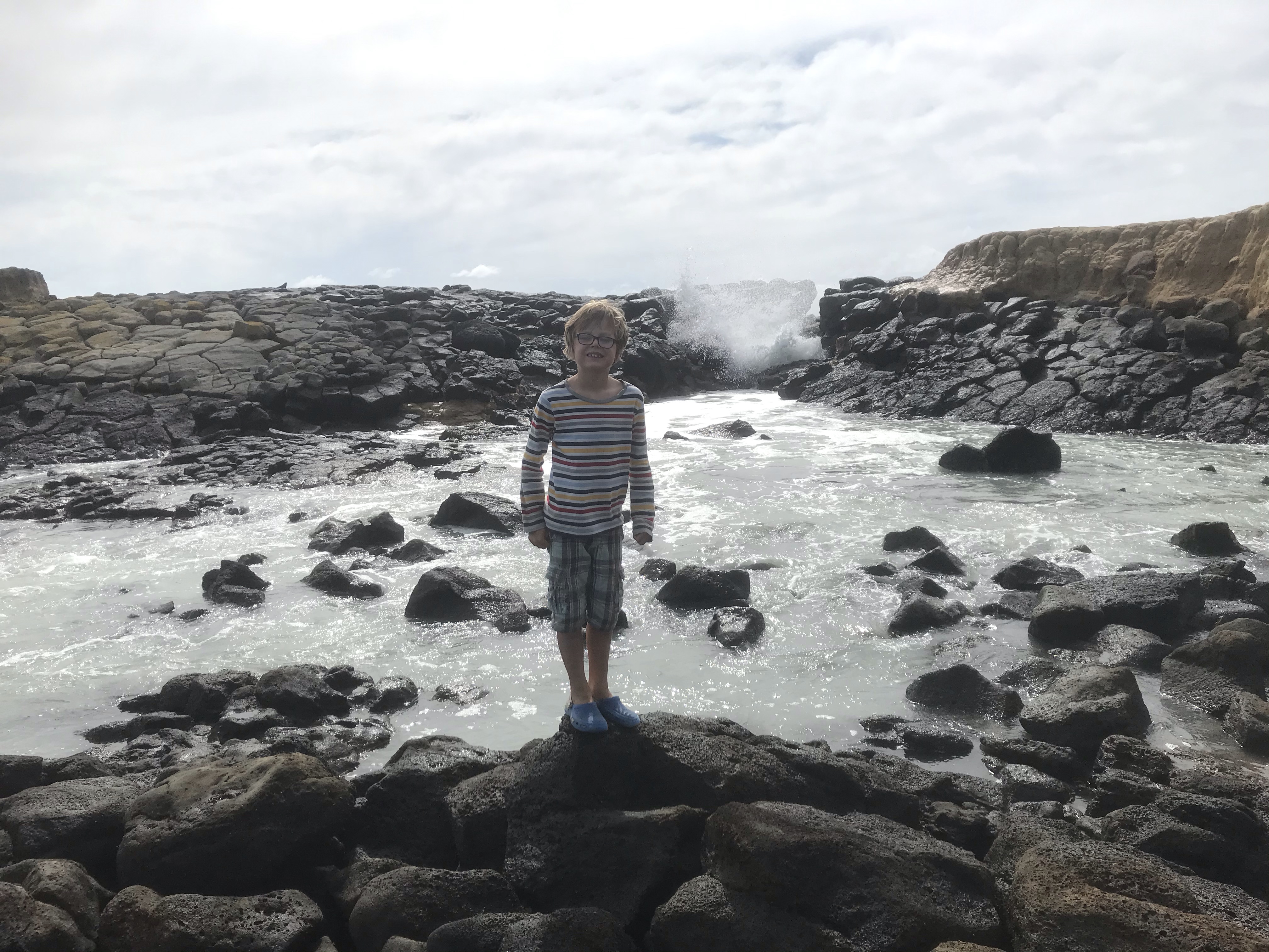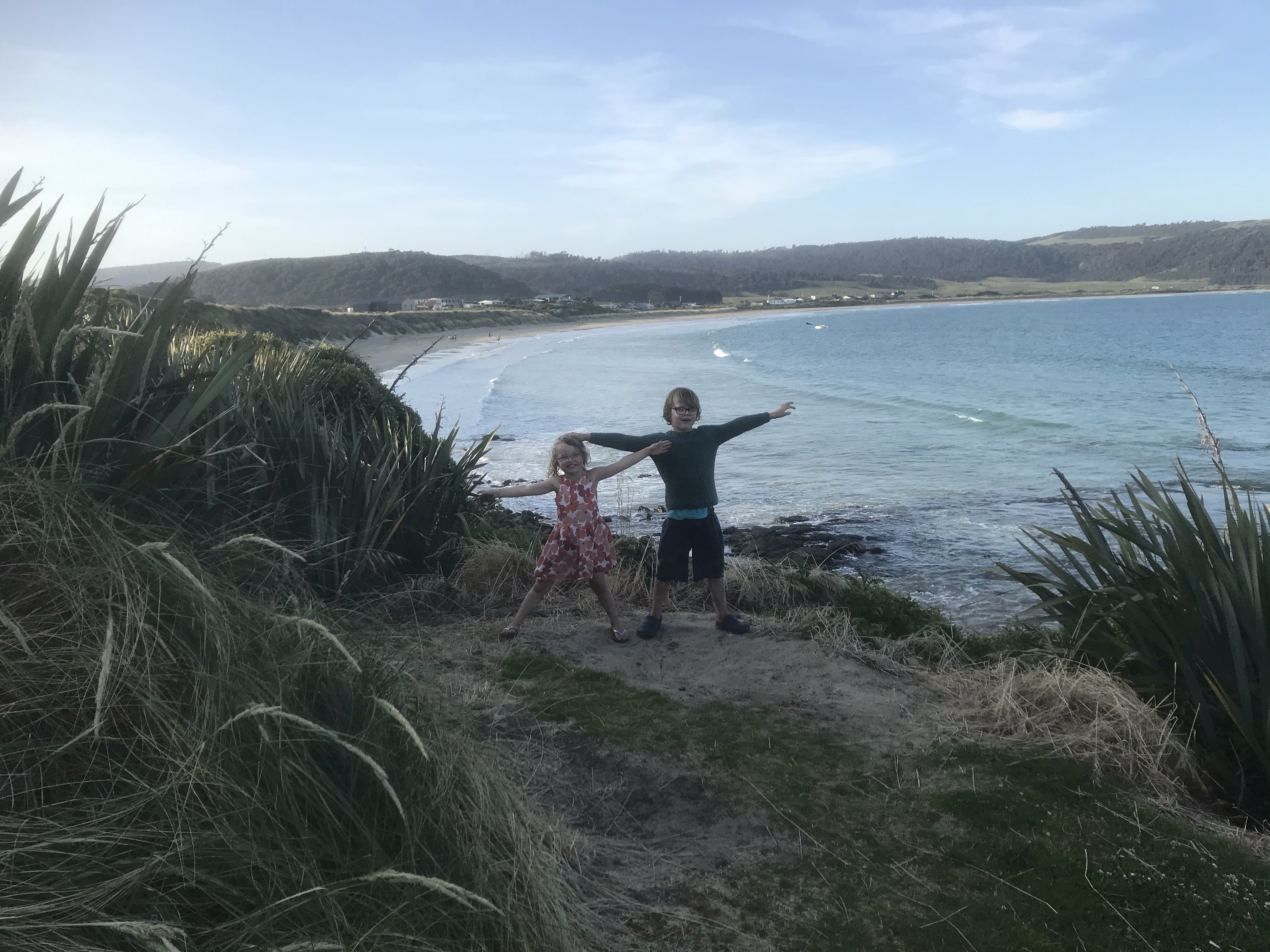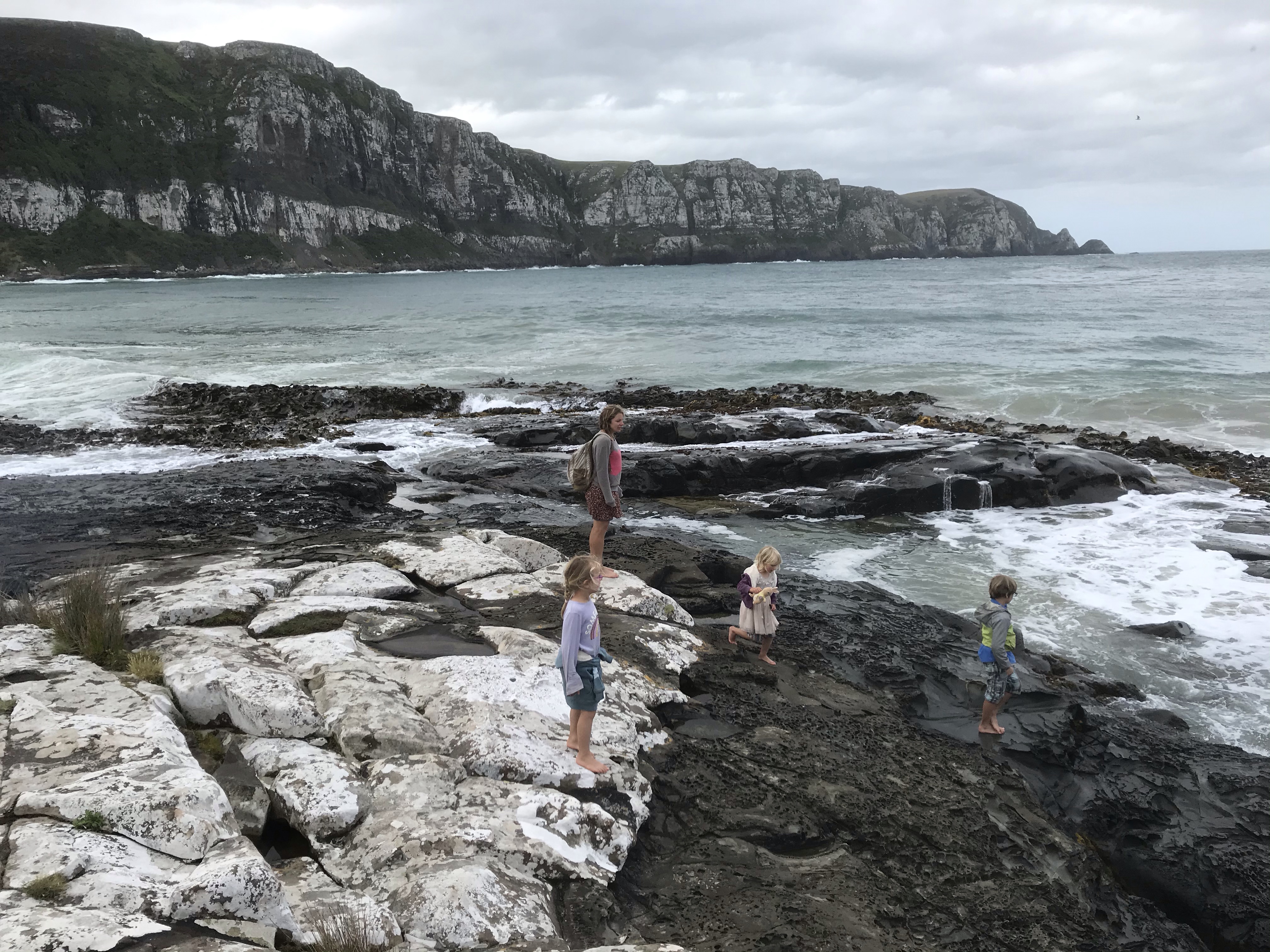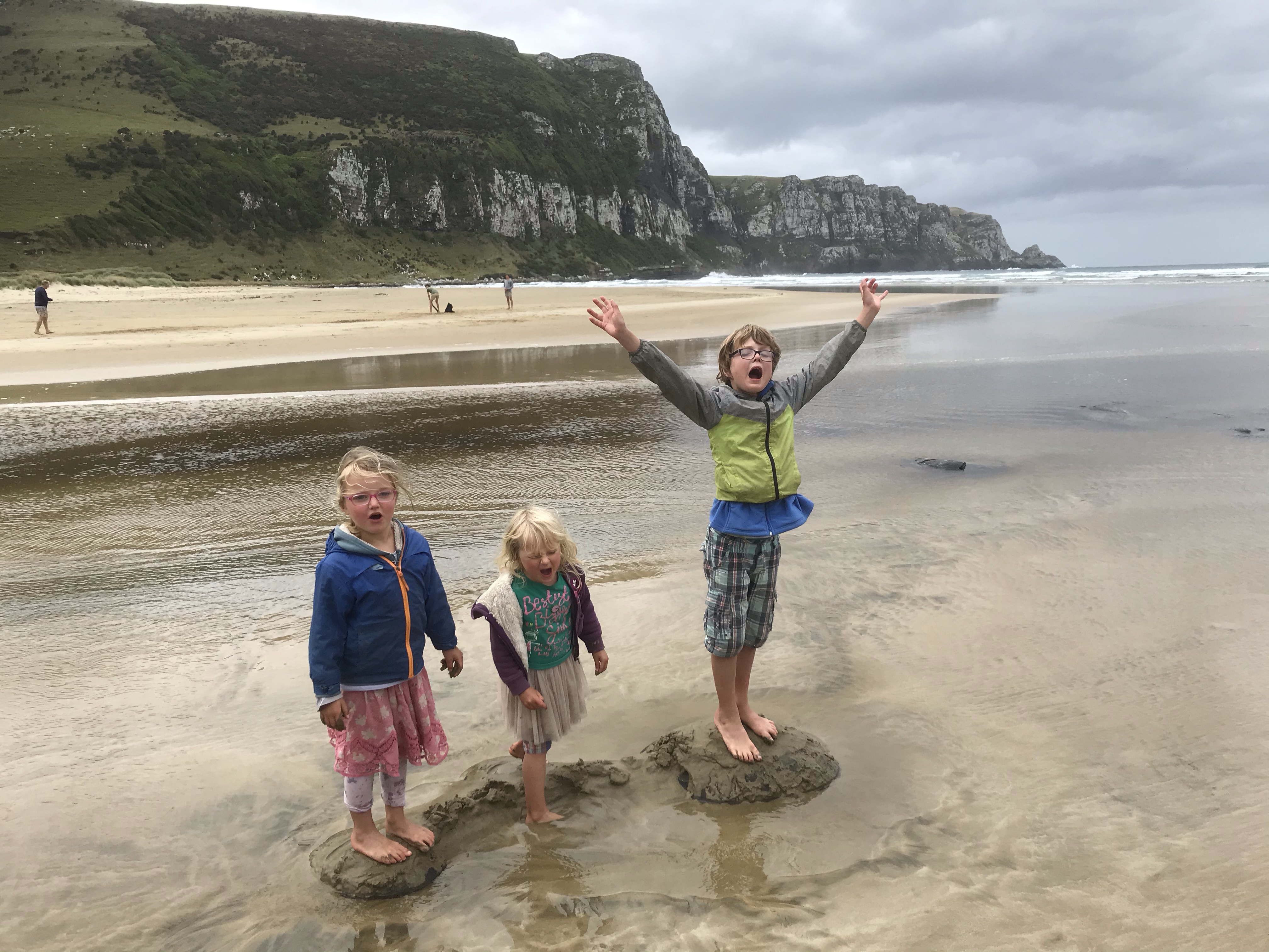 The weather continued to decline and the showers became high winds and steady rain so we opted for a rest day at Invercargill starting with the excellent transport museum where besides many cool old cars, Em especially enjoyed playing cops and robbers with Ethan! It brightened up in the afternoon so we headed down to Bluff to look for oysters and found an excellent forest and coastal walk from the very southern tip of the peninsula. A slap up dinner on the way back at the lovely Aparima restaurant at Riverton was a nice touch, enjoying mussels, more tasty chowder and great views across the estuary. Our last morning in Colac Bay we checked out nearby Cosy Nook which was a wind and wave lashed granite fishing village, but we didn’t hang around much longer than racing the tide getting on and off the rock islands with exciting big waves crashing in. A long drive east took us to the Catlins proper which is another level up of coastal scenery than Colac Bay, with rainforests spilling down over cliffs to big sandy beaches and caves. An afternoon spent on beautiful Papatowai Beach was time well spent and then we drove down to our next basic DOC campsite at Purakaunui Bay which I’d heard good things about but was still blown away by the view of remote camping by a perfect beach with massive cliffs at one end. After many days of rain we also had hints of the sun starting to return and this improved everyone’s mood immensely. Welcome to the Catlins!