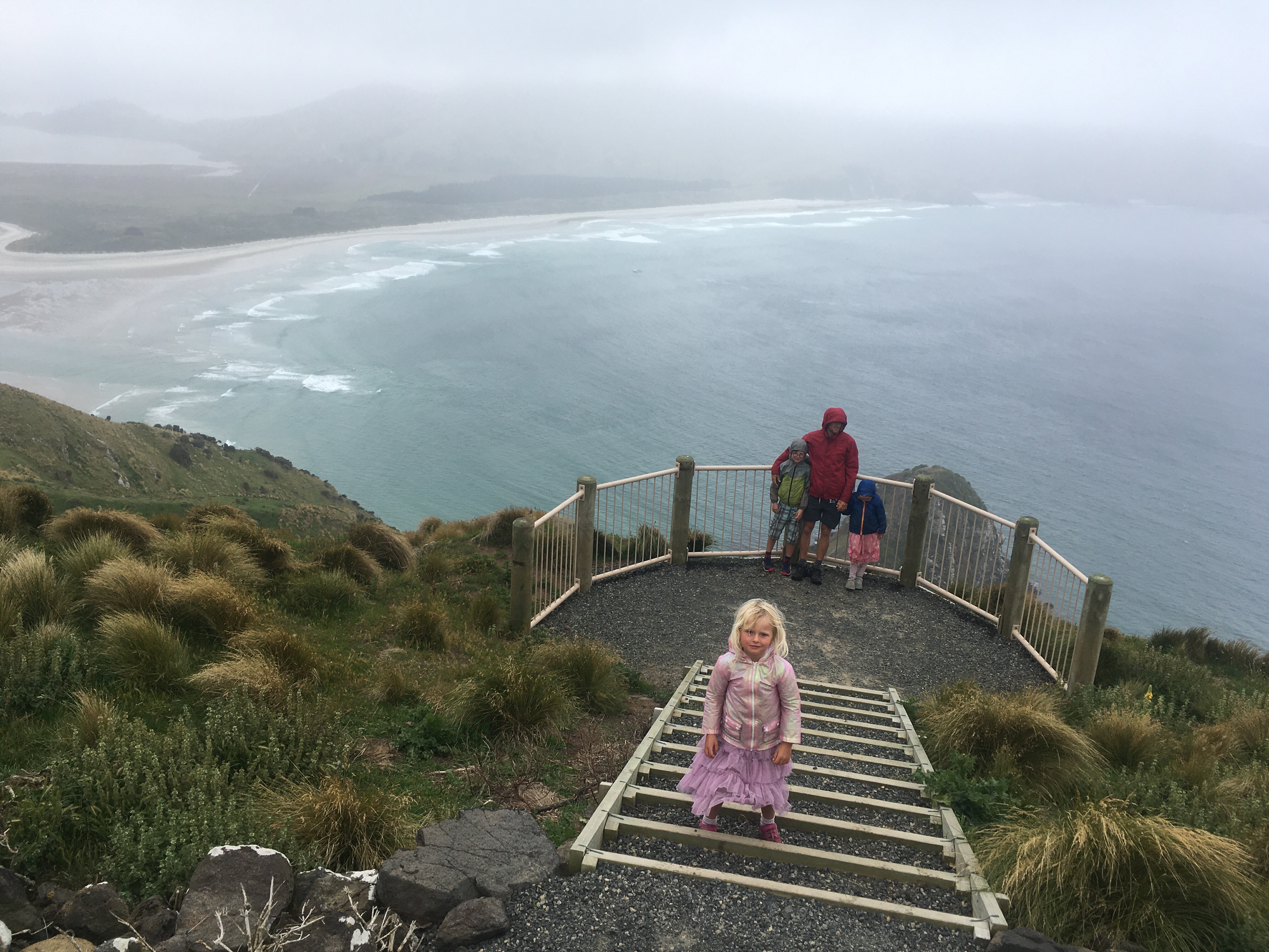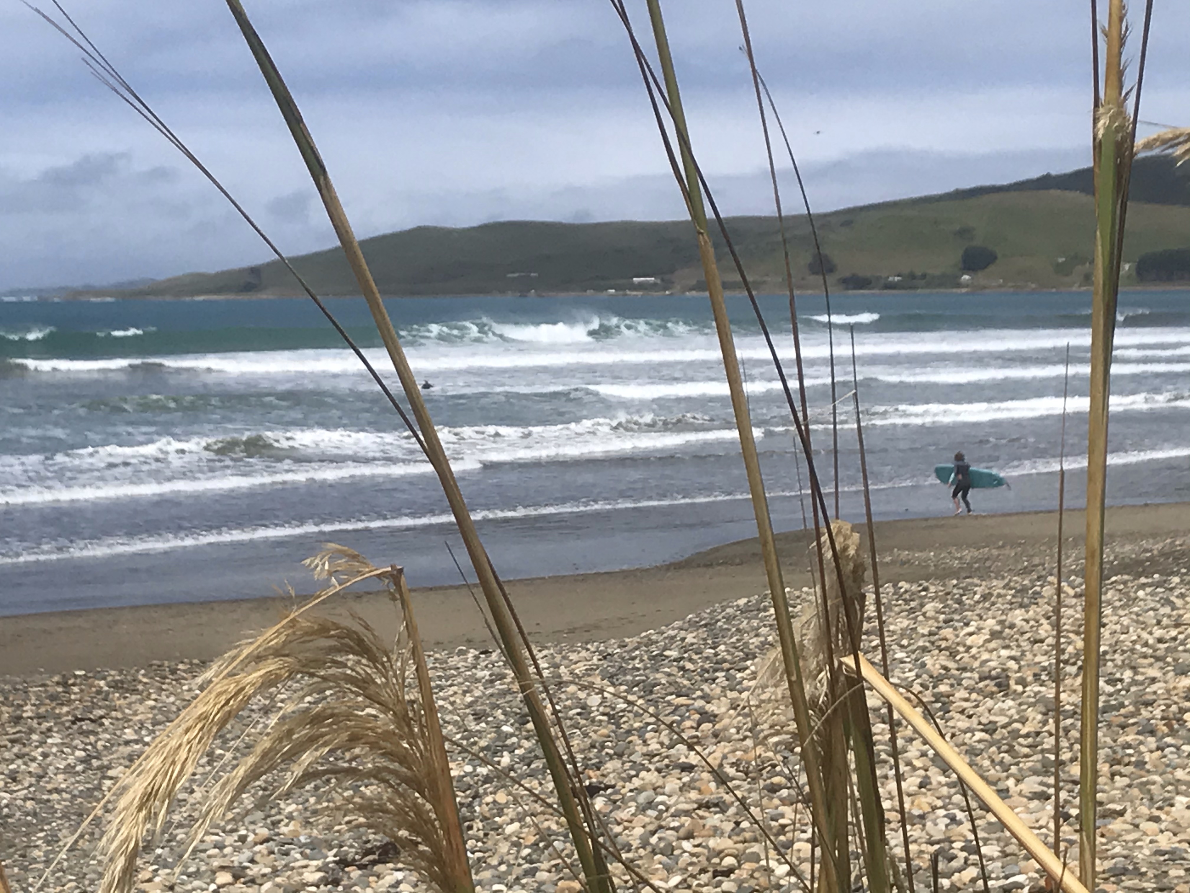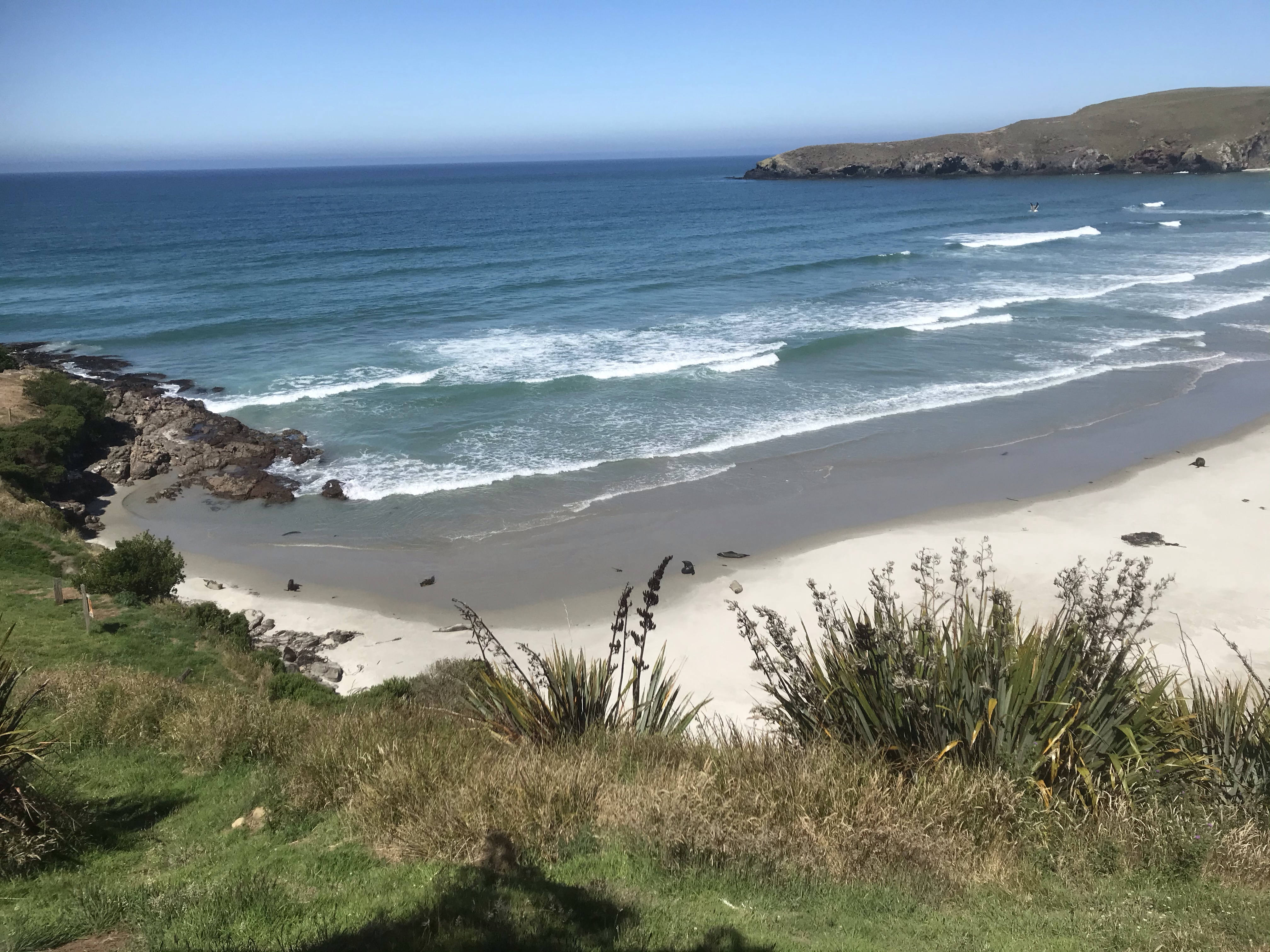 Last day in Dunedin and with the haar rolled in yet again (Edinburgh place names and Edinburgh weather!), we assumed it would burn off in an hour or so and headed up into the hills to stretch our legs. Sandymount Loop has amazing coastal views apparently but walking in the dense cloud wasn’t quite what we were after! We could see the sun shining lower down on the beaches so after a quick lap to tick the summit we drove round and dropped down the very steep sand dunes onto pretty Sandfly Bay, which is another stunning beach, the match of the ones in the Catlins, lots of sea lions again and white sand with islands and cliffs. Surf looked pretty perfect too with offshore winds and a decent swell. Em headed out first and got out the back only to be chased out of the water by an angry giant sea lion who then went after two swimmers chasing them out of the water too! Scary stuff and Em passed the board to me, I nervously headed out further right near some other surfers and luckily didn’t come face to face with any angry sea creatures but did catch some epic rides, surfing doesn’t come any better with big long right handers peeling right across the bay. Em had another go but was spooked a bit by the close encounter. The walk out up the steep sand dunes was predictably very hard work especially with a rucksack full of heavy wetsuits and a 9foot long board but we got there in the end and Ethan even ran some sections!