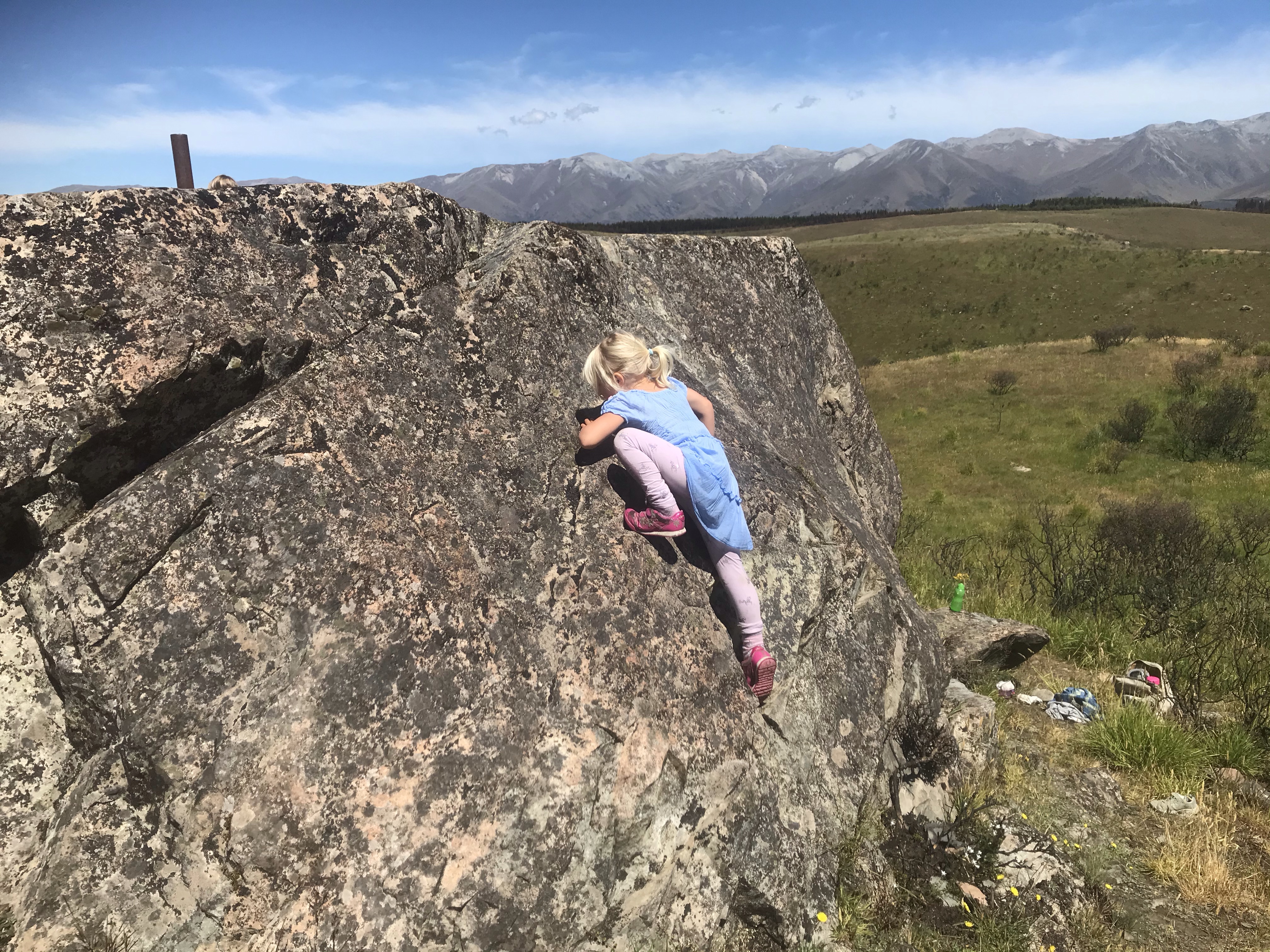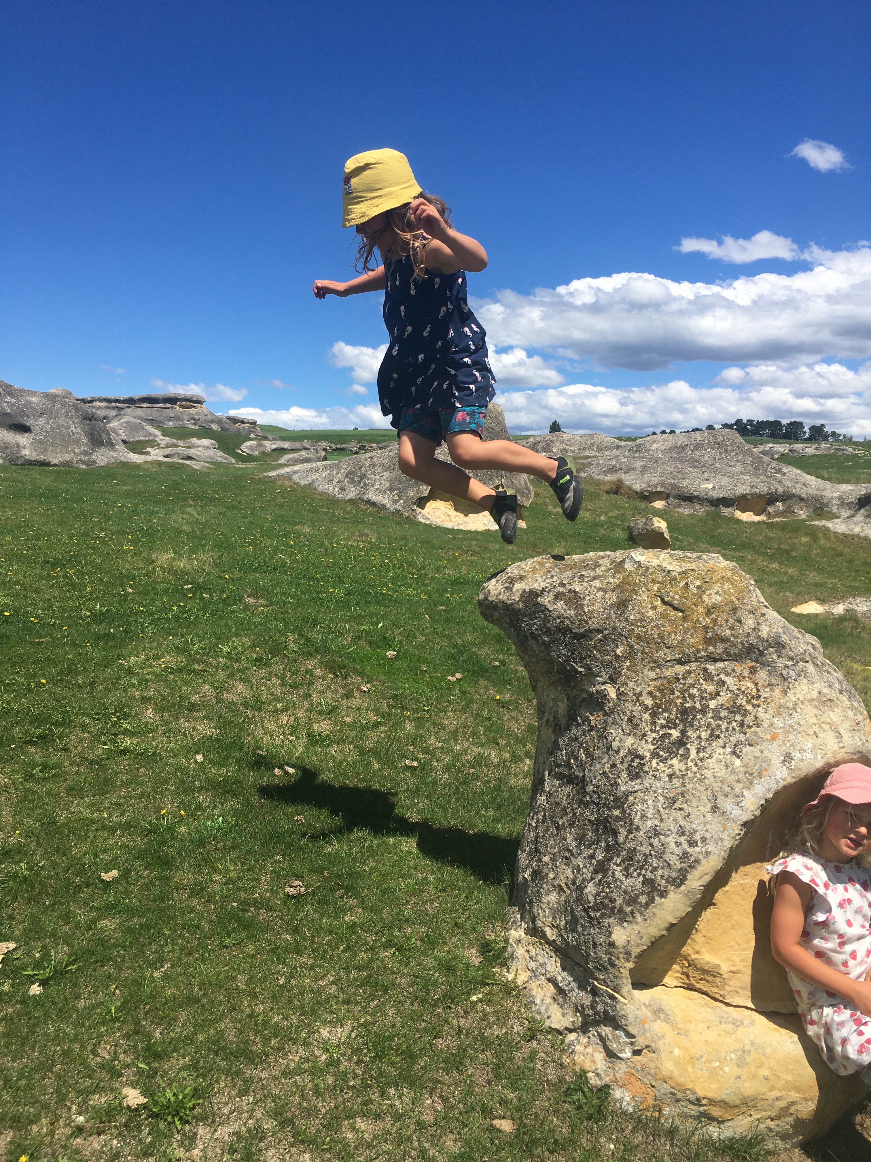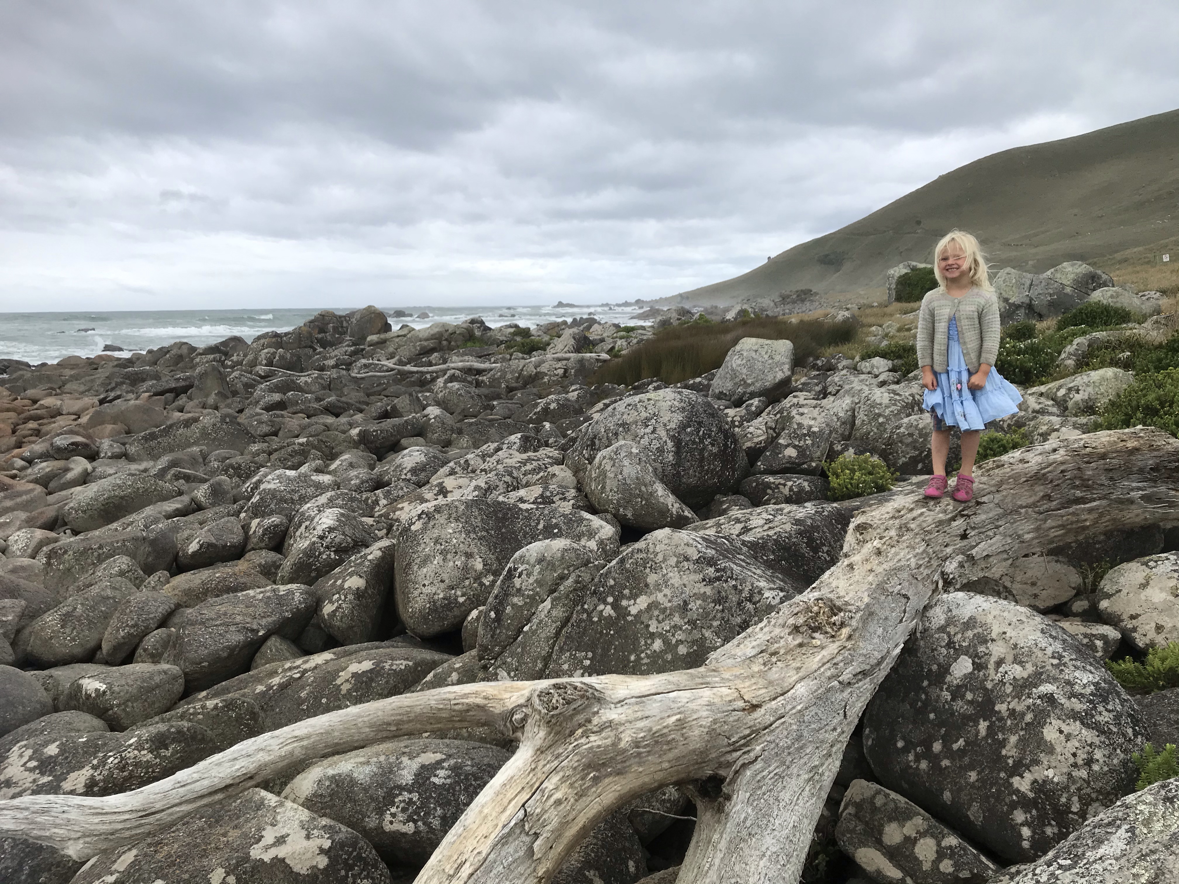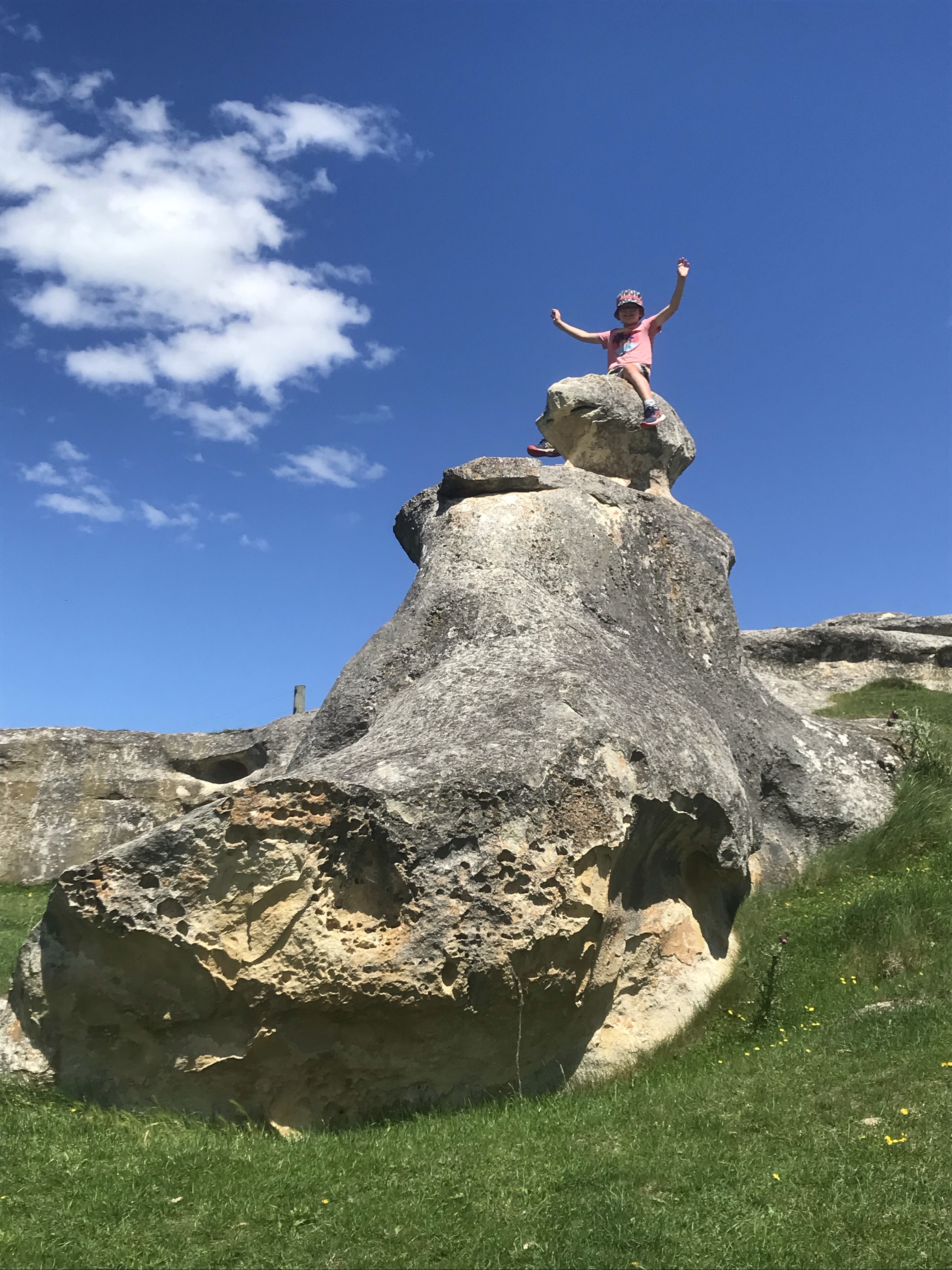 We were all very sad to leave the Otago Peninsula and head homewards but we maximised the journey home by stopping at the famous Moeraki Boulders and Elephant Rocks on the way to a night in Timaru to break the drive. The Moeraki boulders are like that waterfall in the Catlins – very, very overhyped and when you get there they are tiny, busy with tourists and hardly worth it, but they grew on us and they again do seem to look amazing in photos! Elephant Rocks was awesome bouldering though, perfect grassy landings and loads of fun problems to go at, Em and I took turns at trying to keep the children safe and enjoying the rock ourselves. Timaru seemed nice enough, we had a nice dinner out overlooking the beach and enjoyed the coastal walk round the headland to be treated to some massive waves slamming into the rocks, but overall the town reeks of massive industry and urban decay. $100 (£50) for a two bedroom cabin to enjoy the first night in a real bed in weeks is not to be sniffed at though!