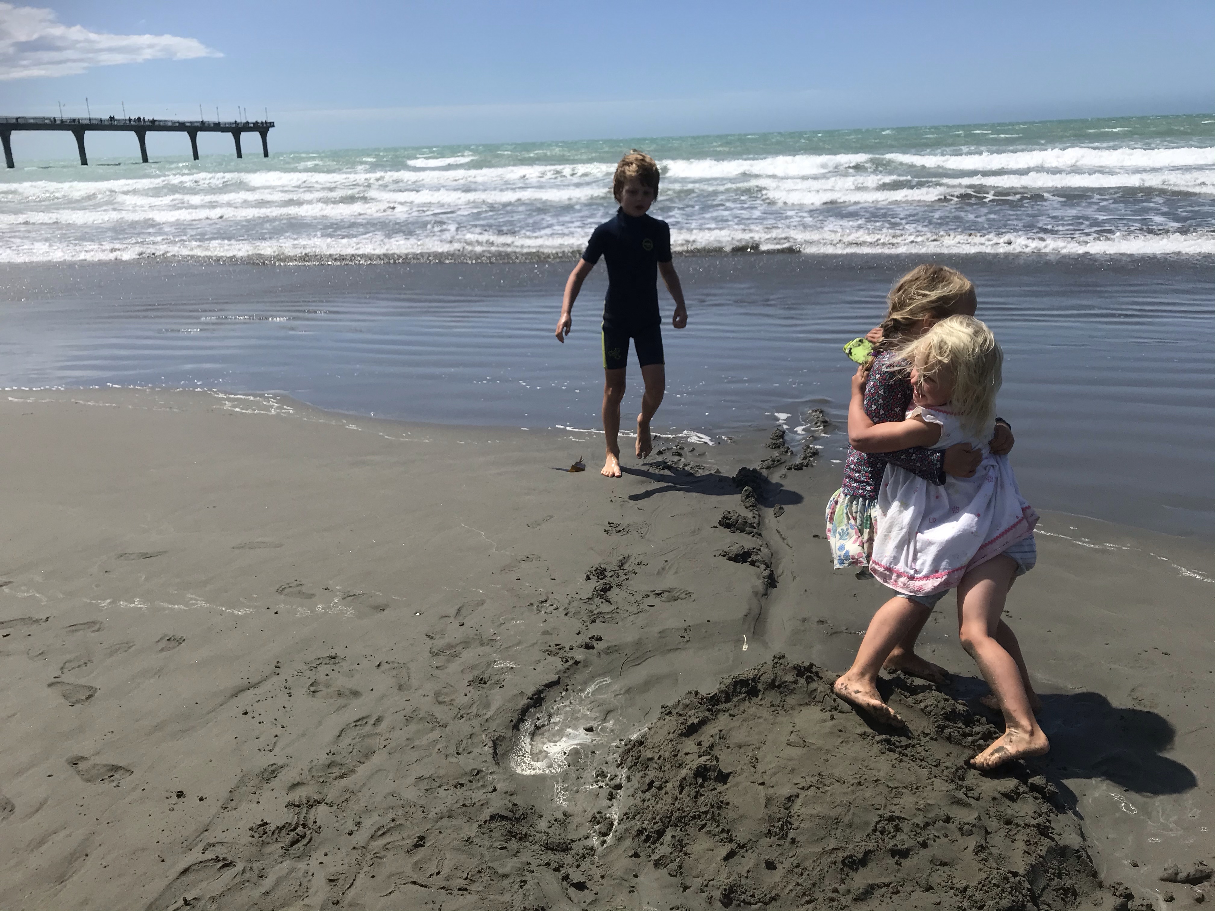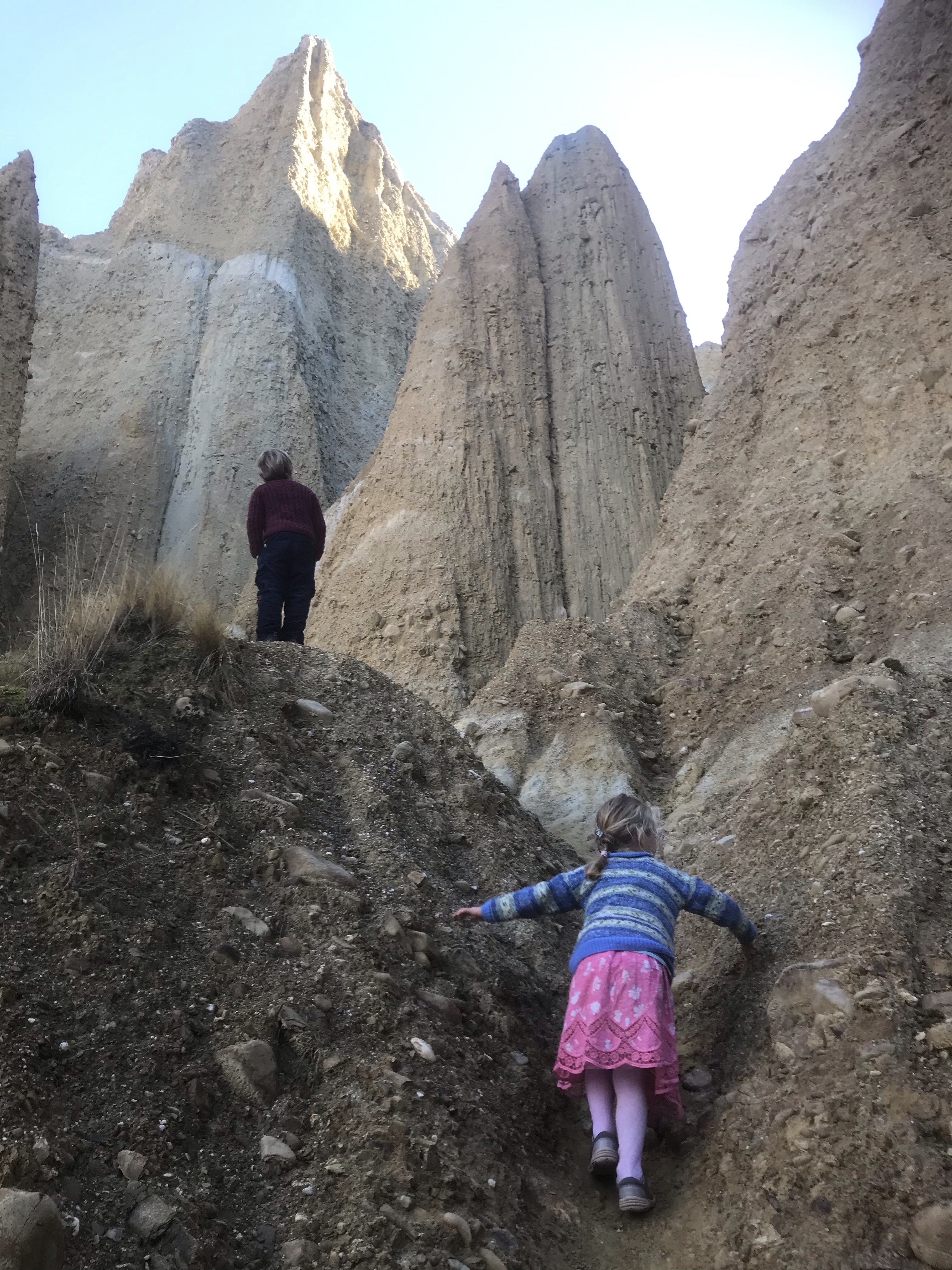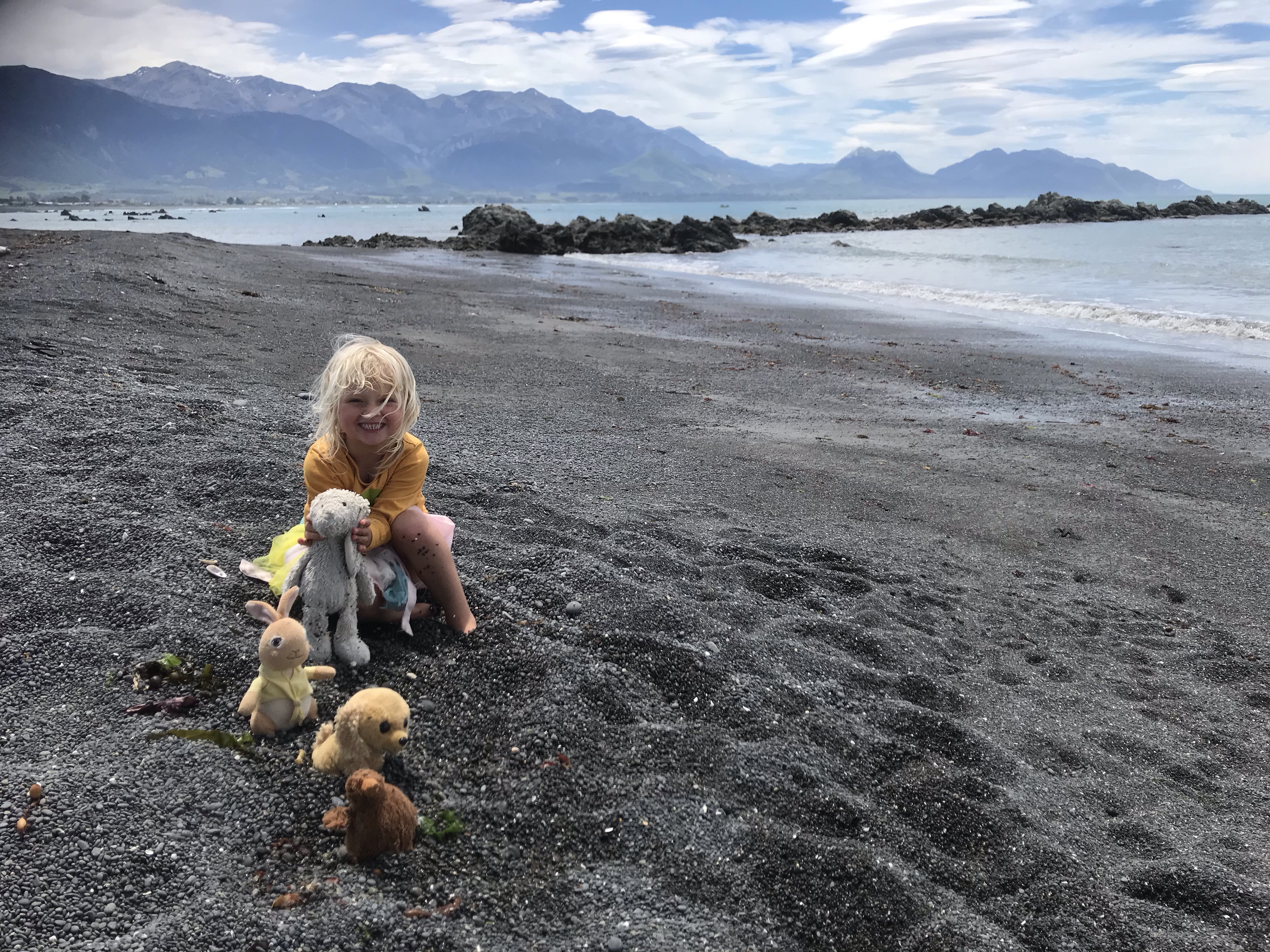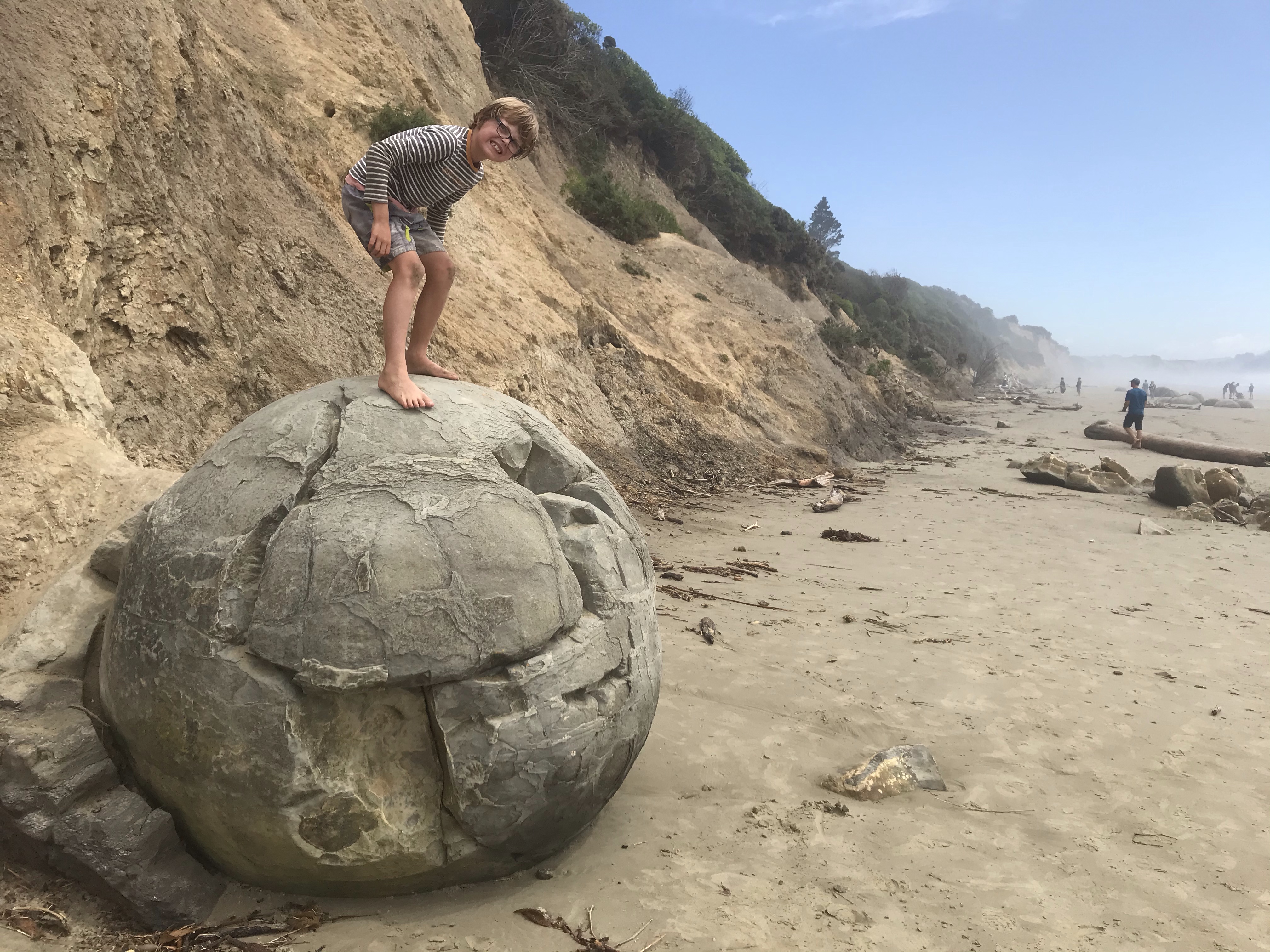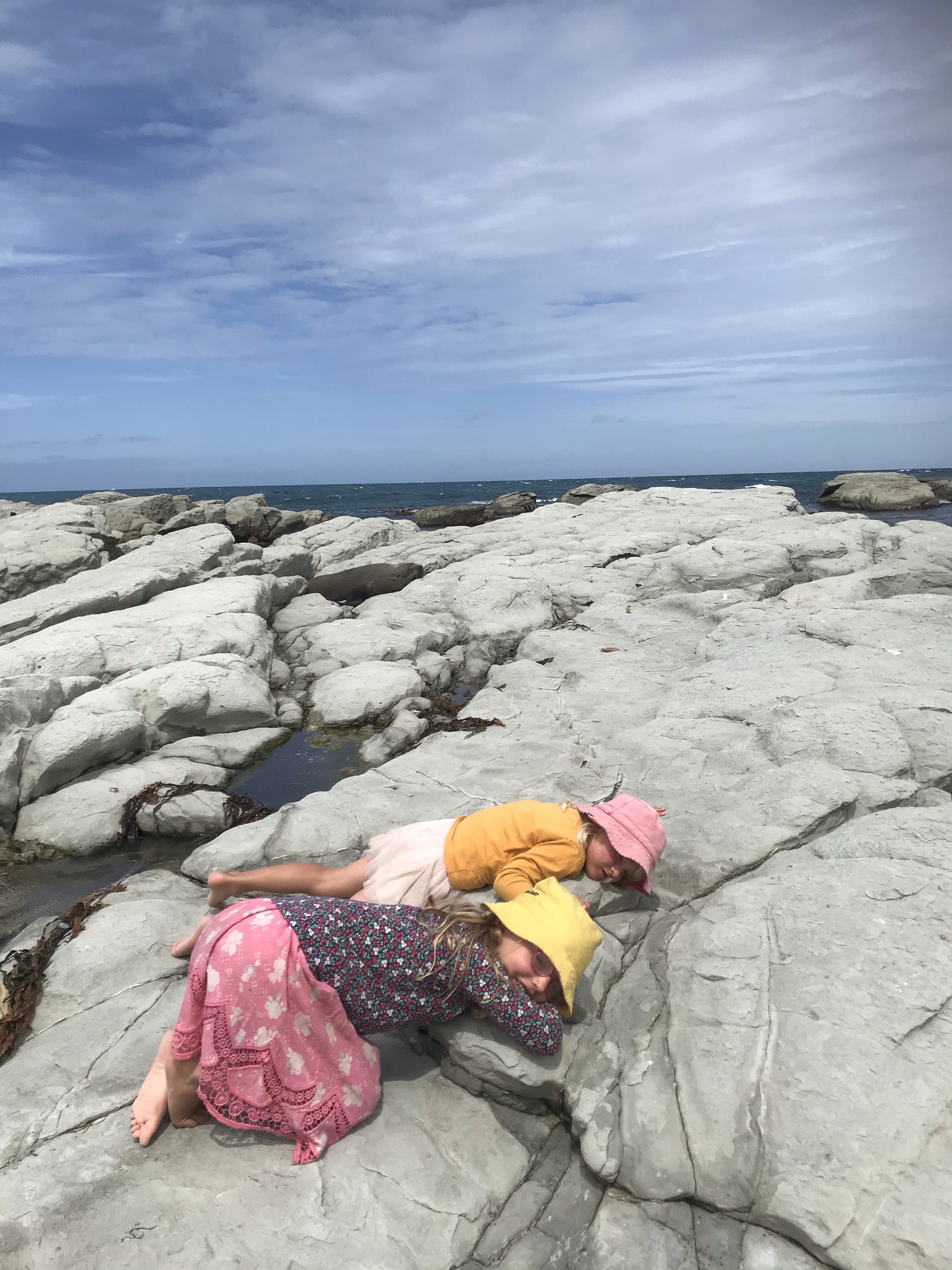 We were all very sad to leave the Otago Peninsula and head homewards but we maximised the journey home by stopping at the famous Moeraki Boulders and Elephant Rocks on the way to a night in Timaru to break the drive. The Moeraki boulders are like that waterfall in the Catlins – very, very overhyped and when you get there they are tiny, busy with tourists and hardly worth it, but they grew on us and they again do seem to look amazing in photos! Elephant Rocks was awesome bouldering though, perfect grassy landings and loads of fun problems to go at, Em and I took turns at trying to keep the children safe and enjoying the rock ourselves. Timaru seemed nice enough, we had a nice dinner out overlooking the beach and enjoyed the coastal walk round the headland to be treated to some massive waves slamming into the rocks, but overall the town reeks of massive industry and urban decay. $100 (£50) for a two bedroom cabin to enjoy the first night in a real bed in weeks is not to be sniffed at though!