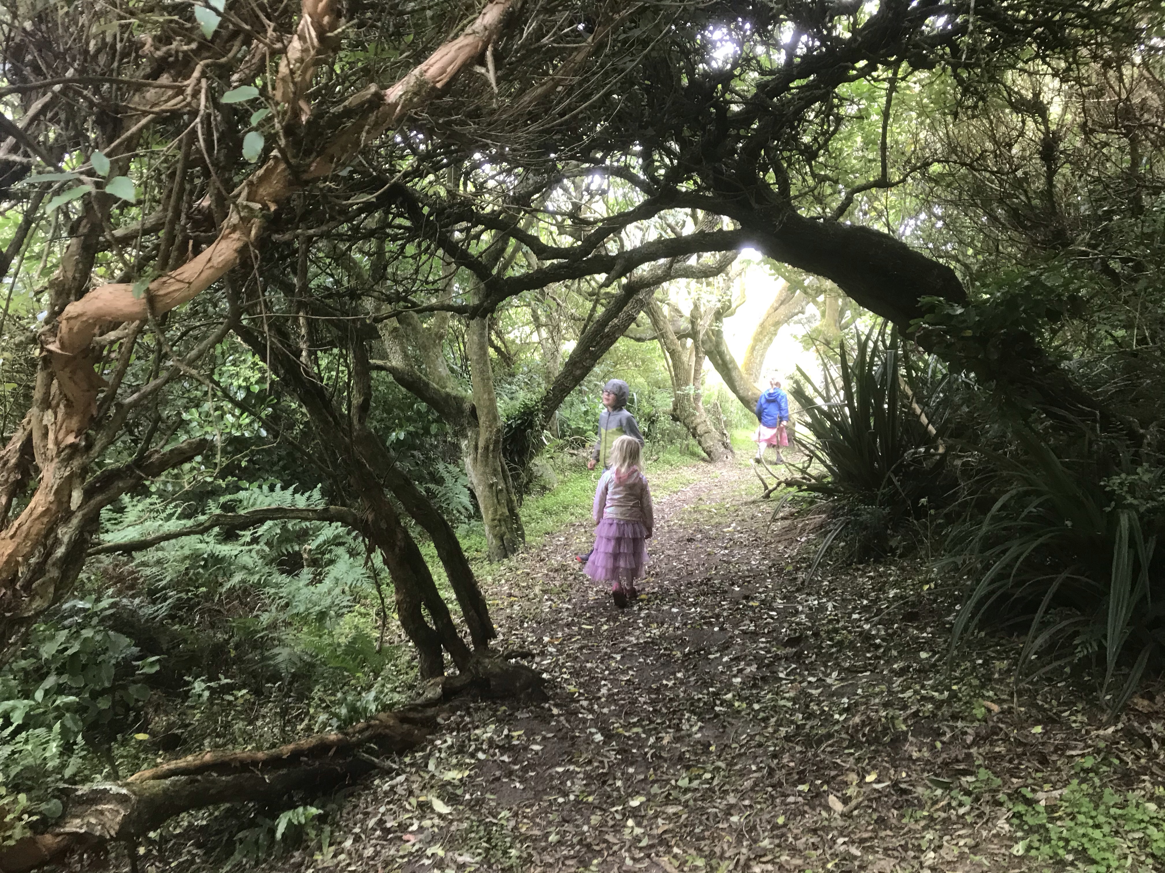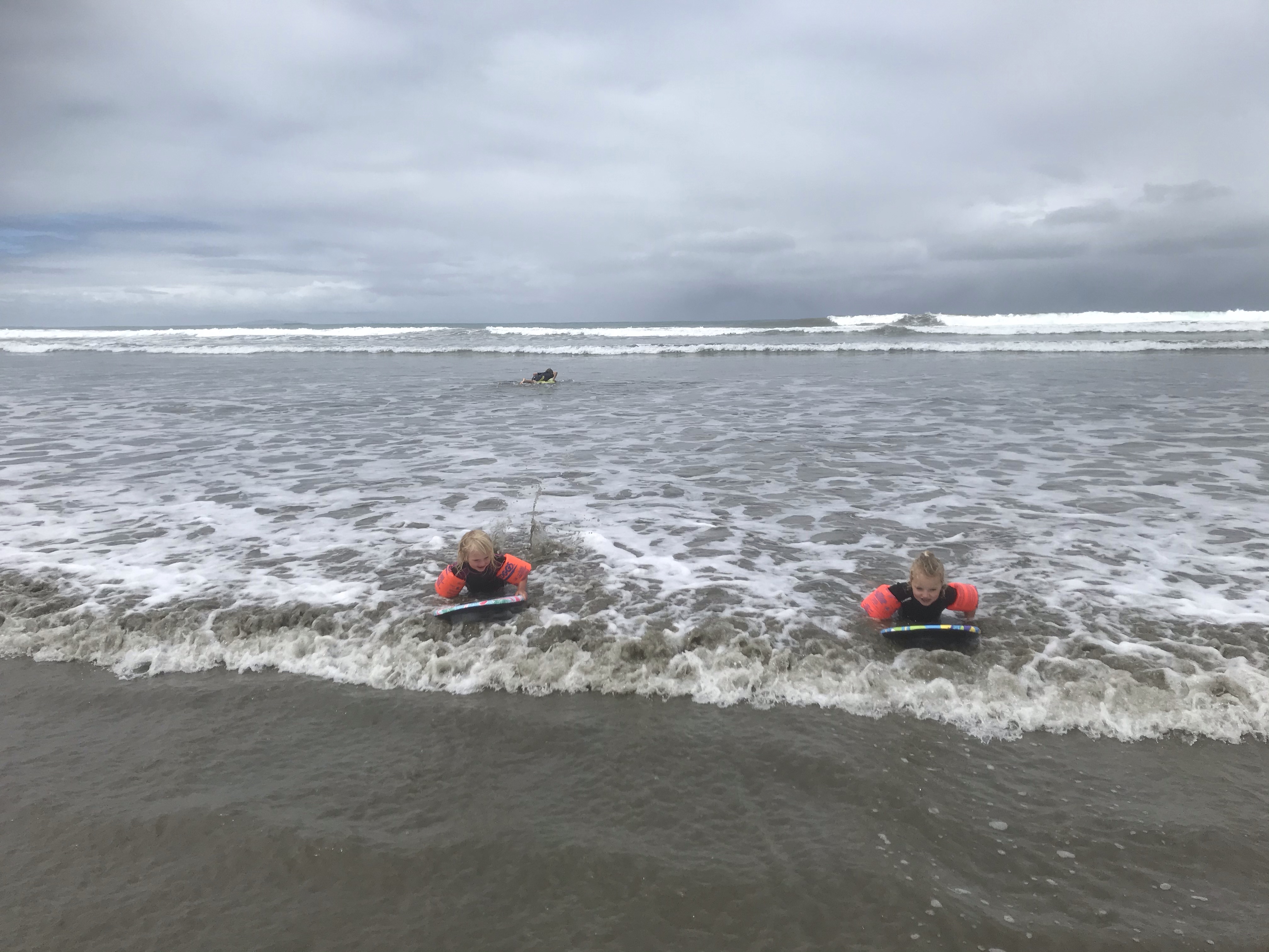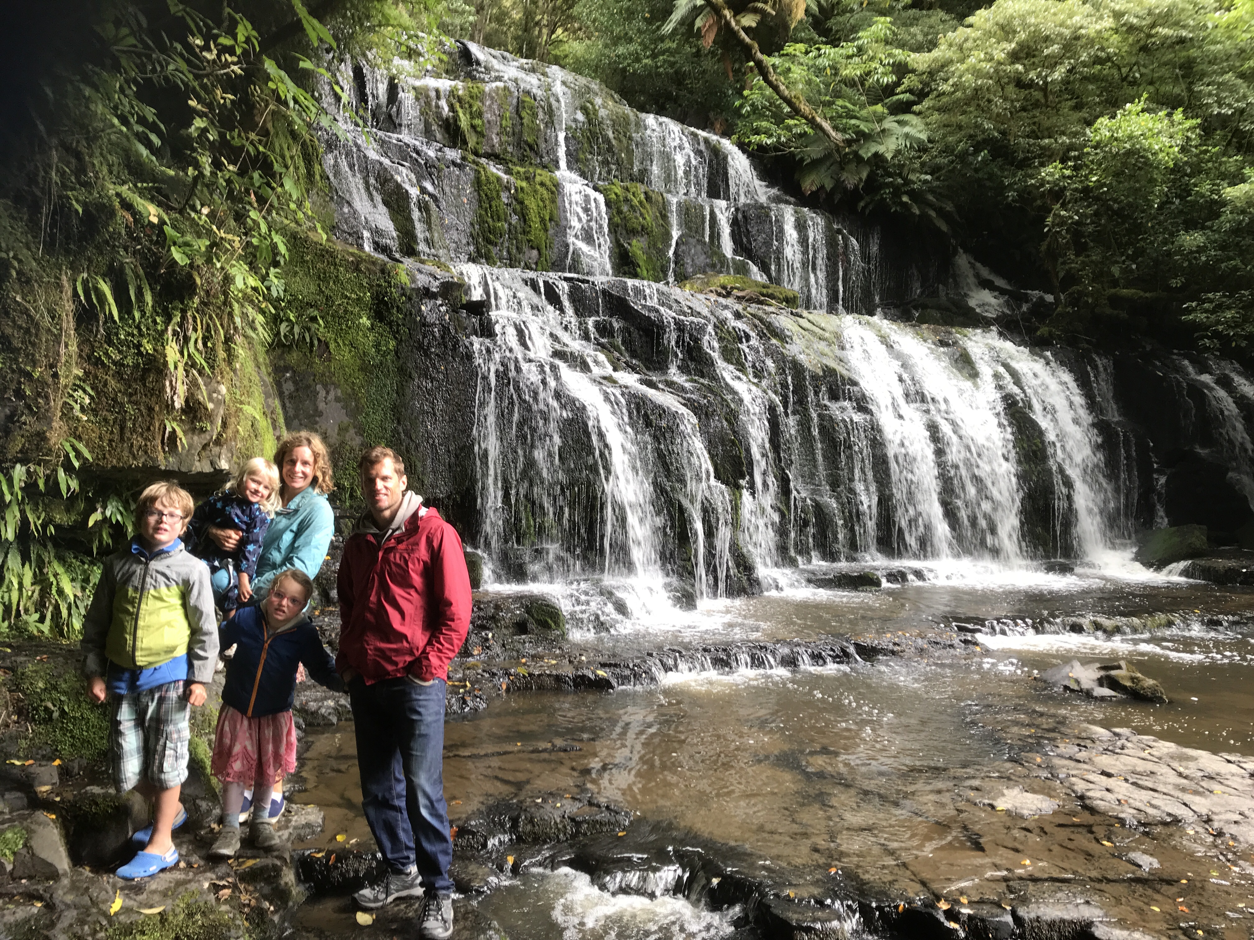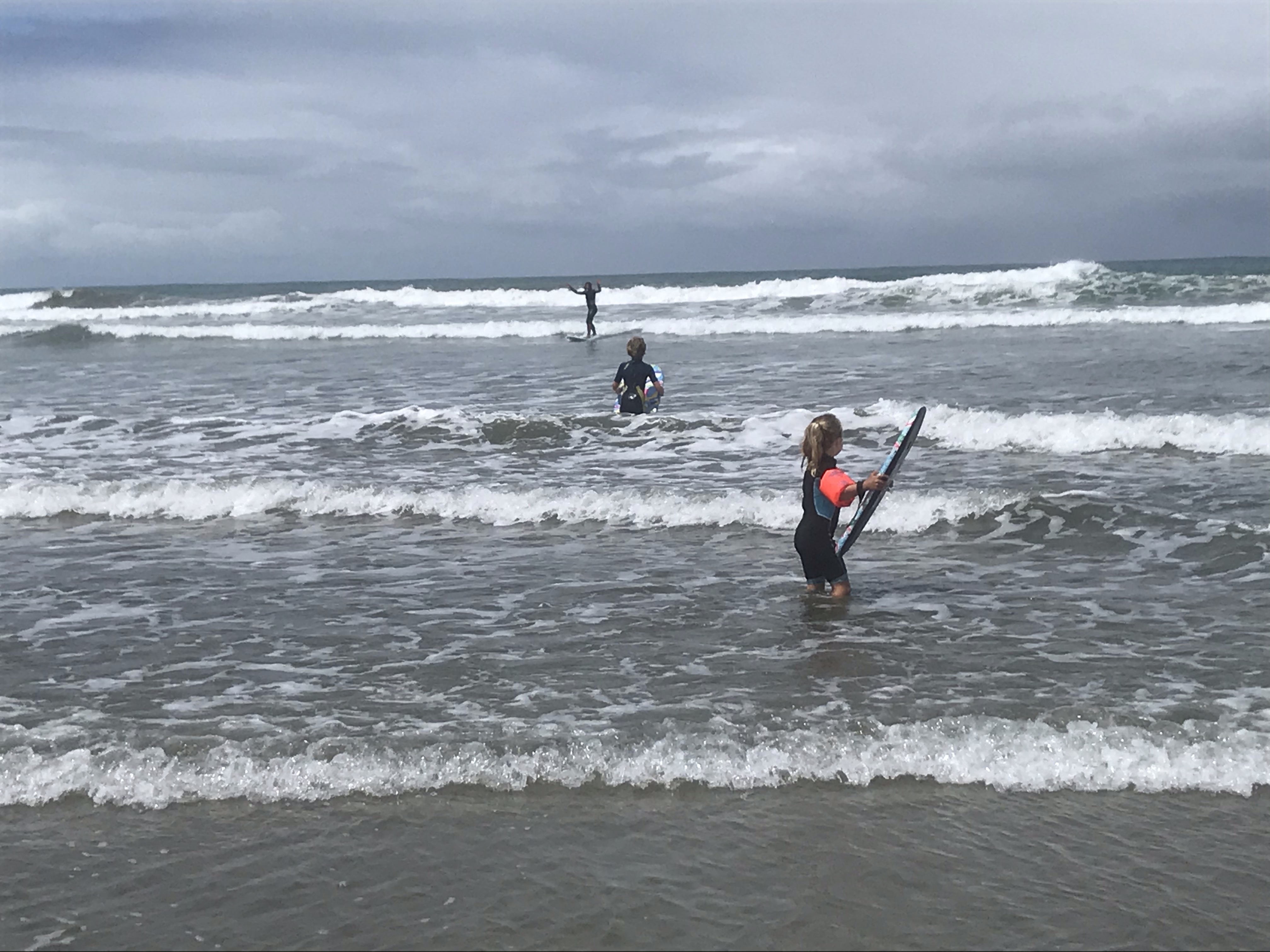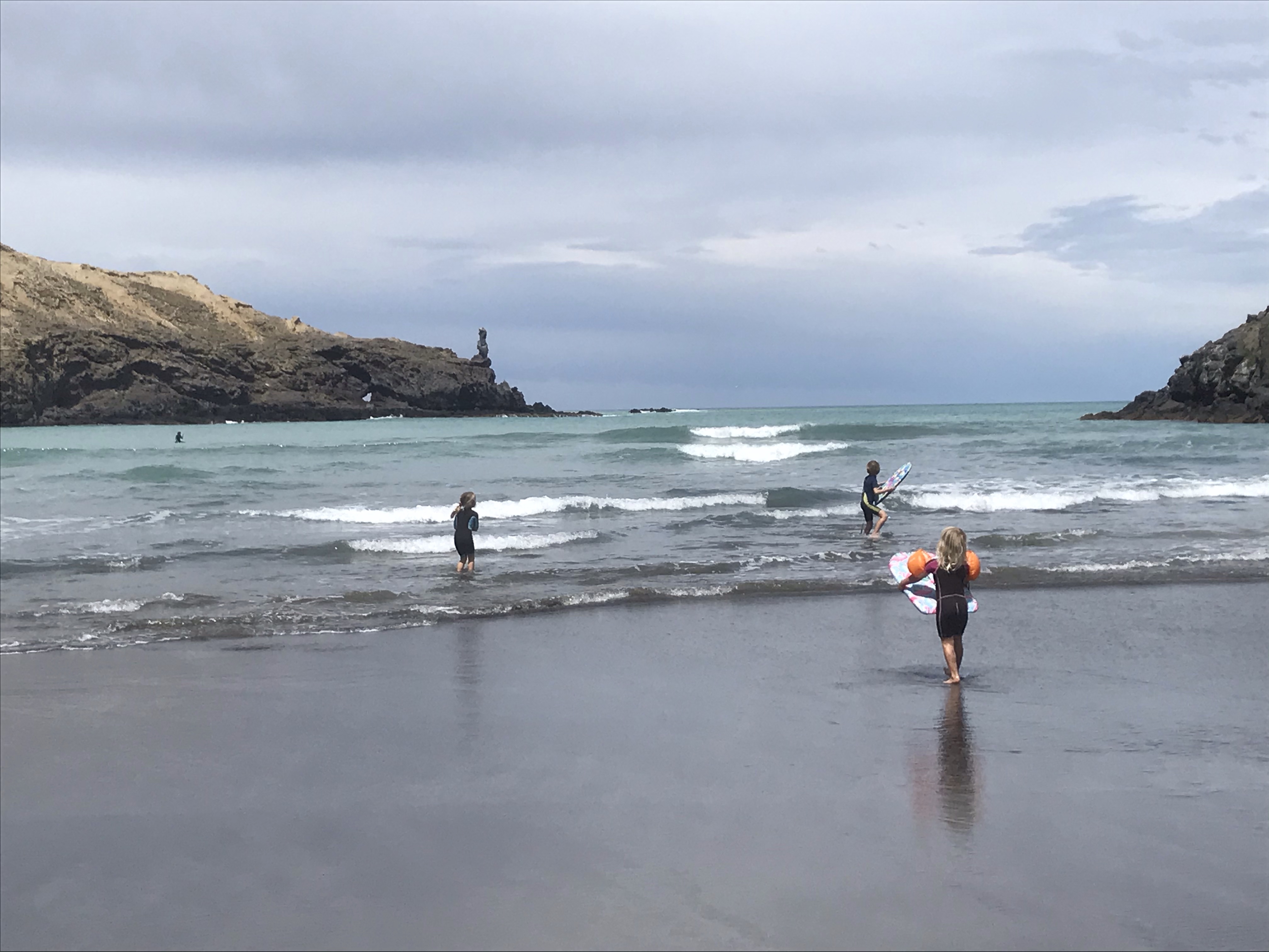 Sadly the hints of sun were short lived and the first morning was yet more rain so we did the sensible thing and left the beach to hunt out “New Zealand’s Finest Waterfall” at Purakaunui Falls – this was underwhelming to say the least being far smaller than the impressive ones at say Milford Sound or on the Routeburn Track! It does manage to look beautiful in photos though so I’ll give it that. The hollow trees on the approach path were also a hit with the children. Although grey it had stopped raining enough for some surfing in the afternoon and the waves were great fun here, big and barrelly but just about surf-able on a longboard, the kids loved riding their boards down the river onto the beach. Great to have campfires again, play a little guitar (literally, it’s Sara’s Christmas present!) and eat al fresco on a picnic blanket every meal. Who needs showers, tables and chairs and flush toilets anyway?