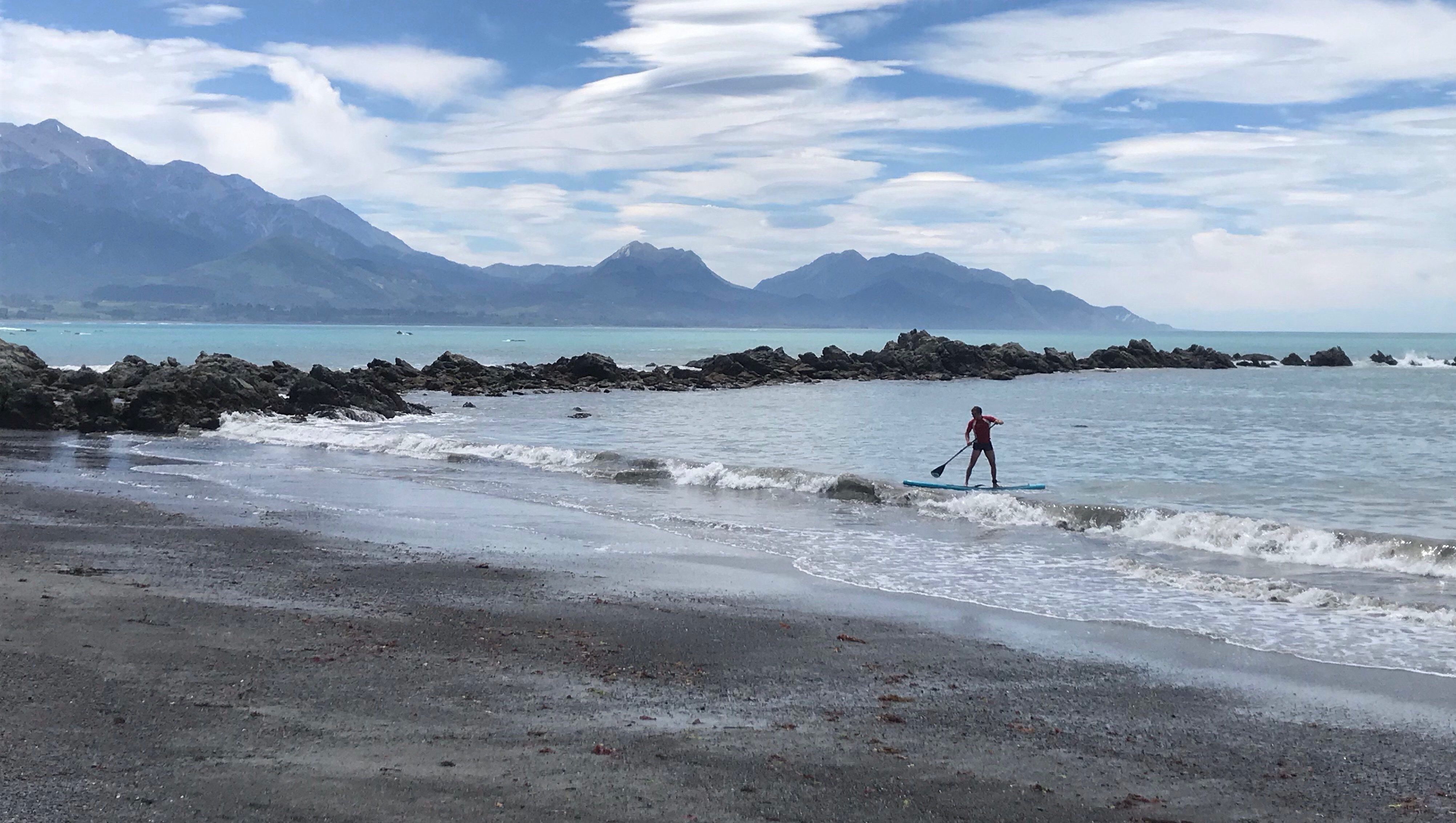 “School’s Out for Summer!” – as always I broke up for the holidays with this song bouncing around my head and a nice end to term with various staff meals out, the usual end of term sing alongs and Christmas quizzes. My proudest moment (!) was beating the Year 9s at a “Disney Princess” Kahoot! A nice touch was thinking I had a six week break but then checking the calendar I realised it was actually seven weeks off – awesome, a bonus week, time to plan some fun adventures. Em’s holidays were still up in the air but we had a five day block sorted before Christmas and lots of hot sunshine forecast so went for Kaikoura as not too far to drive. Another Top 10 Holiday Park to stay in, which though they lack any kind of scenery and are usually next to a noisy road they make up for it with special extras, such as this one had a nice swimming pool, toasty hot tub and the now essential jumping pillow. They have recently opened up some new mountain bike trails on Mount Fyffe so we thought we’d check them out the first day before the weather got too hot for biking. Turned out to be an absolute scorcher and far, far too hot for biking!!! Mount Fyffe (aka Mount Inferno) is very, very steep so after a very sweaty steep walk/bike push to Mount Fyffe Hut I bailed for the steep downhill and fun singletrack below. Em wisely opted to leave her bike at the edge of the woods and run the last bit to the hut, but she then cycled all the way back to town which looked brutal in the oppressive heat. The kids and I went for the popular swim/SUP combo which was a much more pleasant choice! The next day was even hotter so we went surfing at Mangamanau which again I loved but Em hated due to the rocky nature of the point break, she’s good enough to surf there but doubts her ability to commit to the waves and sits too far back to get any rides. Kaikoura has great surfing but not on the sandy beaches so not the most family friendly surf venue, though we did find a nice sandy beach in the afternoon closer to town for some body boarding and shallow SUP surfing, pretty much stepping onto the beach when the wave broke! After all that excitement it was time for a celebratory dinner of the local speciality of crayfish and chips. We also treated ourselves to an early Christmas present or two of wetsuits and boots. My wetsuit is over fifteen years old so nice to finally get a new one! Last day in Kaikoura and we had booked onto a whale watching trip hoping for some calm seas and plenty of large wildlife. On checking in they were very keen we all took travel sickness pills which was a worrying start and the 2m swell wasn’t great either. All seat pockets were full of vomit bags too, yikes! Kids were dosed to the max, I opted to take my chances without the pills and we set off. The staff were excellent with lots of good humour, interesting information about marine animals, and we shot across the water in our speedy boat listening for whales with a sound detector and not seeing much in truth except some large albatrosses and petrels. Ethan and Iona started to be sick and it was all going badly and then finally we found a whale and for ten minutes everything was great, enormous whale next to the boat and that special moment where it dives deep and shows of it’s gigantic tail. Sadly two hours in a boat and lots of ill children isn’t quite worth the ten minutes with the whale but it was a memorable experience whichever way you look at it, just one we won’t repeat in a hurry!
