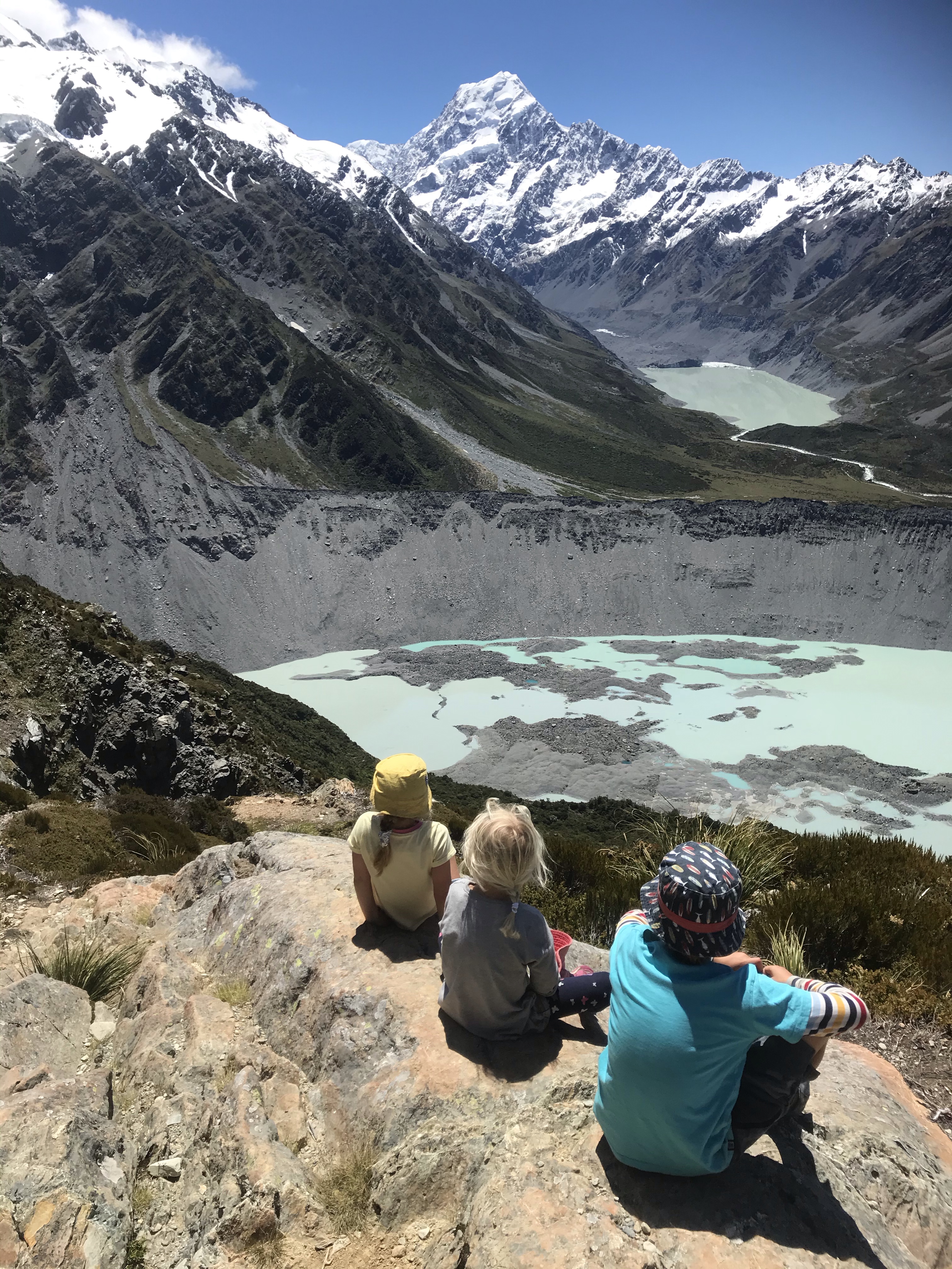Great news came through that Em’s work had too many people on the following week so she was offered an extra week of annual leave which meant three weeks holiday instead of two, we’ll take that! This did mean we had to make a plan in a hurry and set out the very next day for Mount Cook Village and the scenic Glentanner campsite, which was such a contrast with the noisy Kaikoura top 10 campsite, being quiet, spacious and having amazing views up the valley of Mount Cook and the Southern Alps. Having climbed Mount Cook fifteen years ago I was excited to get the mini team into the hills and we opted for the Sealy Tarns route which although short is super steep with 2000(!) steps leading you up to great views across the glacial lakes of the Hooker valley and the mighty Mount Sefton looming above you covered in hanging seracs which like to fall off occasionally. Em continued on up to Mueller Hut and Mount Ollivier and got even better views but we were both very proud of the little people for an ambitious expedition into the hills. I squeezed in some bouldering at Zurbriggens boulder and then we all had a well deserved scenic ice cream at the Hermitage Hotel to finish. What a start to the trip! We finished our Mount Cook mini trip with some excellent bouldering at the Pukaki boulders and a swim/SUP in our old friend Lake Wanaka on the way to Queenstown.