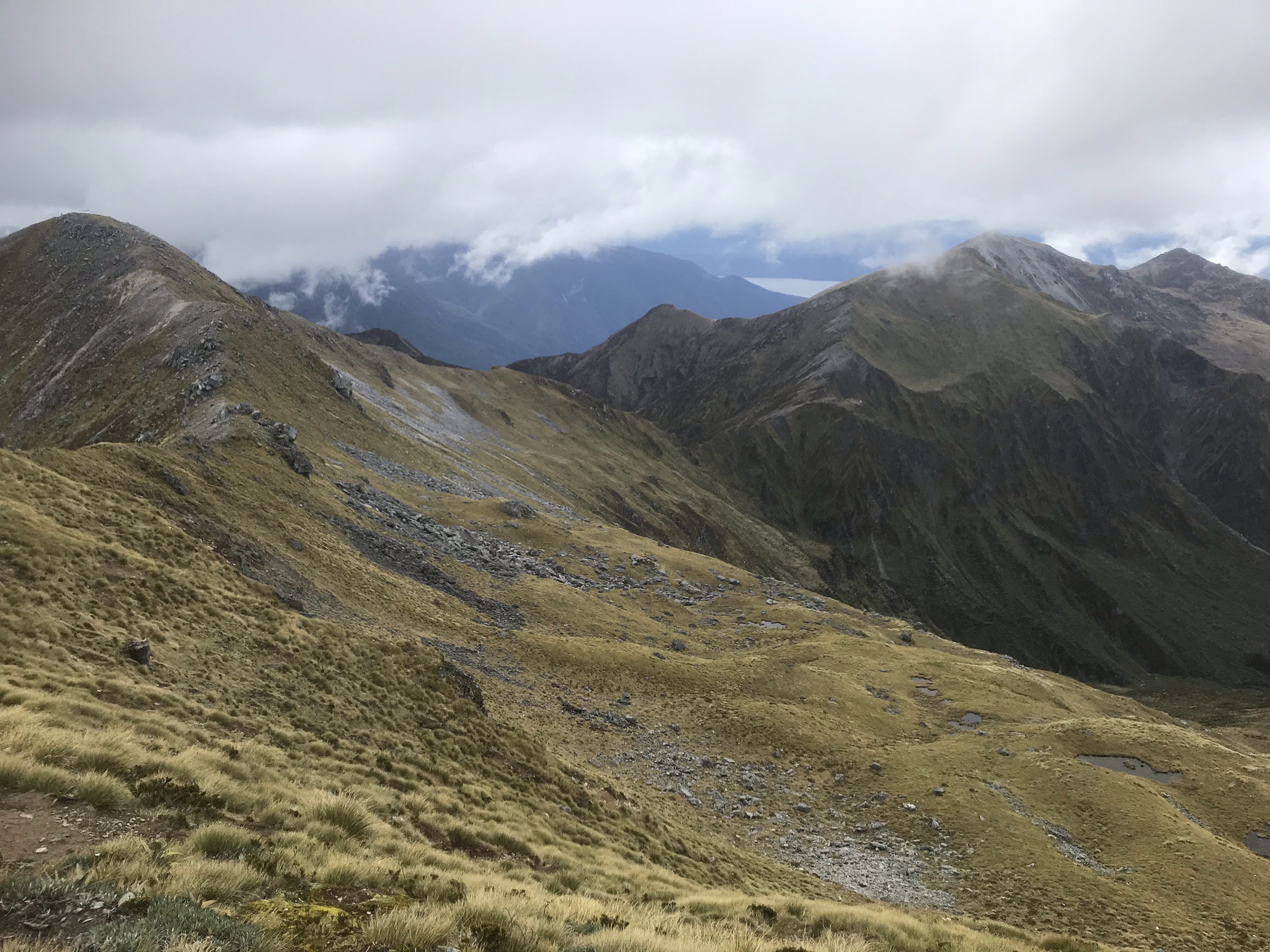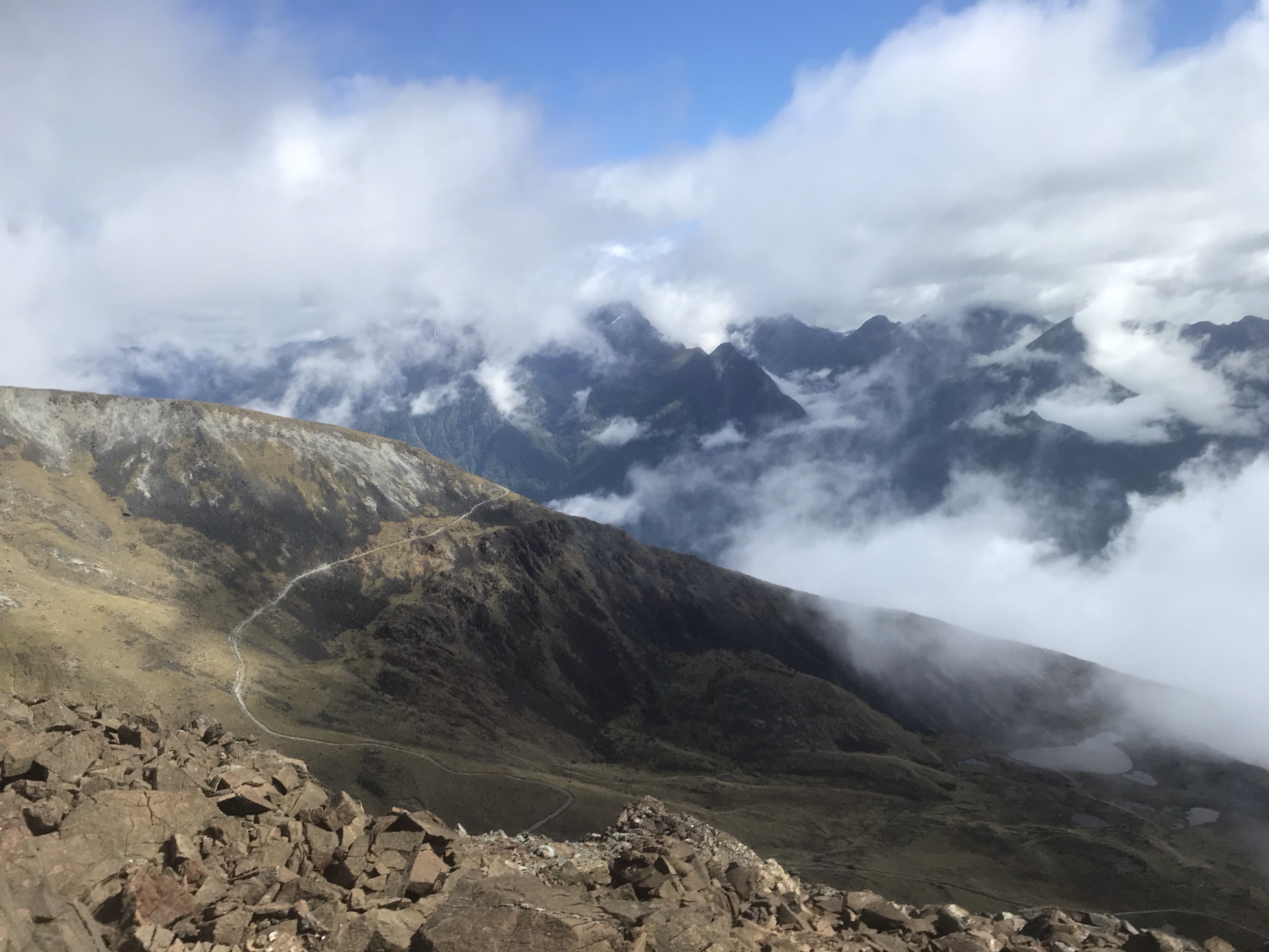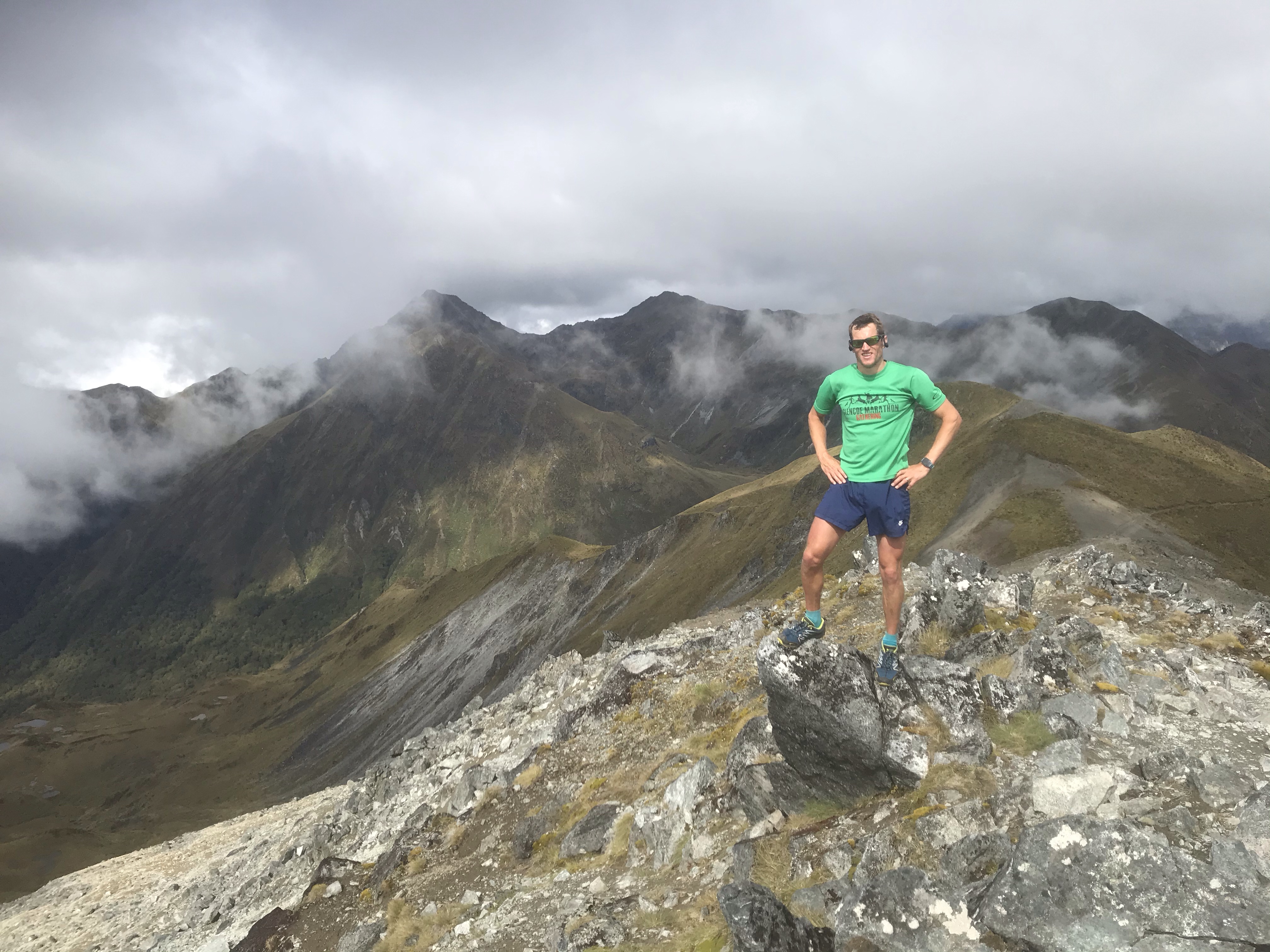 Onto Te Anau again and with half the road open it was only a short delay to get us back on track and through to another Top 10 campsite in the heart of town, a stroll on the lake front and another hot tub and some planning for Em and I to run the famous Kepler Track over the next few days. Weather forecast slightly improved but far from perfect so I set out the following morning taking the 8.30am ferry across the lake to Brod Bay. The Kepler varies from 45km to 70km depending on whether you take advantage of water taxis and shuttles to the start and end so we wisely opted for the shortest option as the extra bit is running in the woods next to the lake for 25km. The ten minute ferry (five minute jog from the campsite) is a great start to a day in the hills as the lake is calm and gives you a brief moment of serenity before a big day ahead. The first hour is a slog uphill through the trees and then all of a sudden you pop out in the high alpine country and first reach Luxmore Hut which looks a great place to stay, will have to bring Ethan back up here sometime and stay the night. Onward and upward, and I opted to leave the super highway trail and go off-piste taking a fun scrambly ridge over a few peaks and up to the highest point on the regular trail, Mount Luxmore where I had a few jolly chats with various hikers. The weather was just about playing ball with mostly good views and clouds rolling in and out. Over to the left was a great view of the Jackson Peaks, an attractive looking horseshoe ridge which begged to be climbed. It looked grassy, how bad could it be? After the Forest Burn Shelter I reached a col where I did some scree running and an airy, loose traverse across unstable ground and I started wondering if this was a sensible move leaving such a well formed and well travelled route. The next kilometre was though waist deep tussocks and bushes with the occasional Spaniard Speargrass that you’ll know quickly if you brush against! I finally reached the horseshoe I’d been looking at to find the vegetation much thicker than it looked but pushed on anyhow as I’d got this far. The ridge got easier and more scenic as I gained height and though broken rock, it was a fun scramble with three peaks to pass along the way and I just beat the worsening weather back to the main track two hours later. I then passed all the walkers I’d met earlier who were surprised to see me again! The best bit of the normal track followed, a picture perfect ridge descent down to the Iris Burn Hut which sadly meant the end of the high alpine stuff and lots of wooded valley running to come. I took a “20 minute” diversion up to the impressive Iris Burn Falls and had a long swim and rest. This was a bad choice as my legs seized up from the cold water and I found running the 2km back to the hut very tough and had another long rest and feed at the hut. Although I’d done the hardest bit of the day the next 20km (mostly downhill!) was very, very tough and I shuffled along slowly down the valley, getting slower and slower and longing for the end. Finally I reached Lake Manapouri which is a beautiful spot for a second swim and soon after I reached the well positioned Moturau Hut and had a final feed, a chat to a bemused walker and psyched up for the last 5km to the car at Rainbow Bridge. I’d managed to charge my phone in the last hut so was saved by 80s disco tunes which made the last 5km surprisingly pleasant! Great feeling to cross Rainbow bridge after 10.5 hours of running, 50km (30 miles) and lots of hills and in retrospect the energy sapping vegetation, extra ridge and waterfall diversion were all foolish options but I definitely got my money’s worth! I’d missed dinnertime but Em had thoughtfully saved me some and she set about packing the bag for her go at the route….