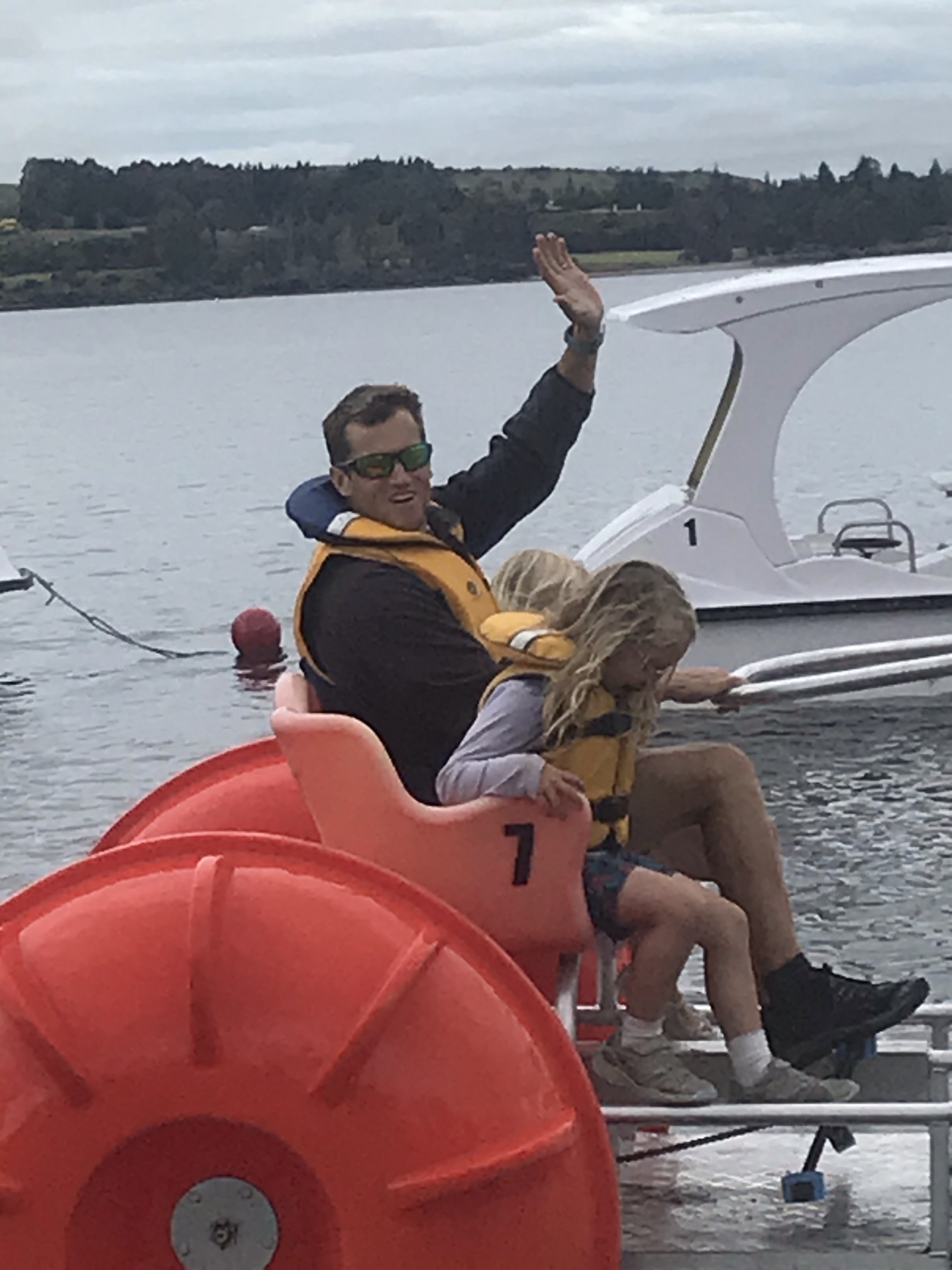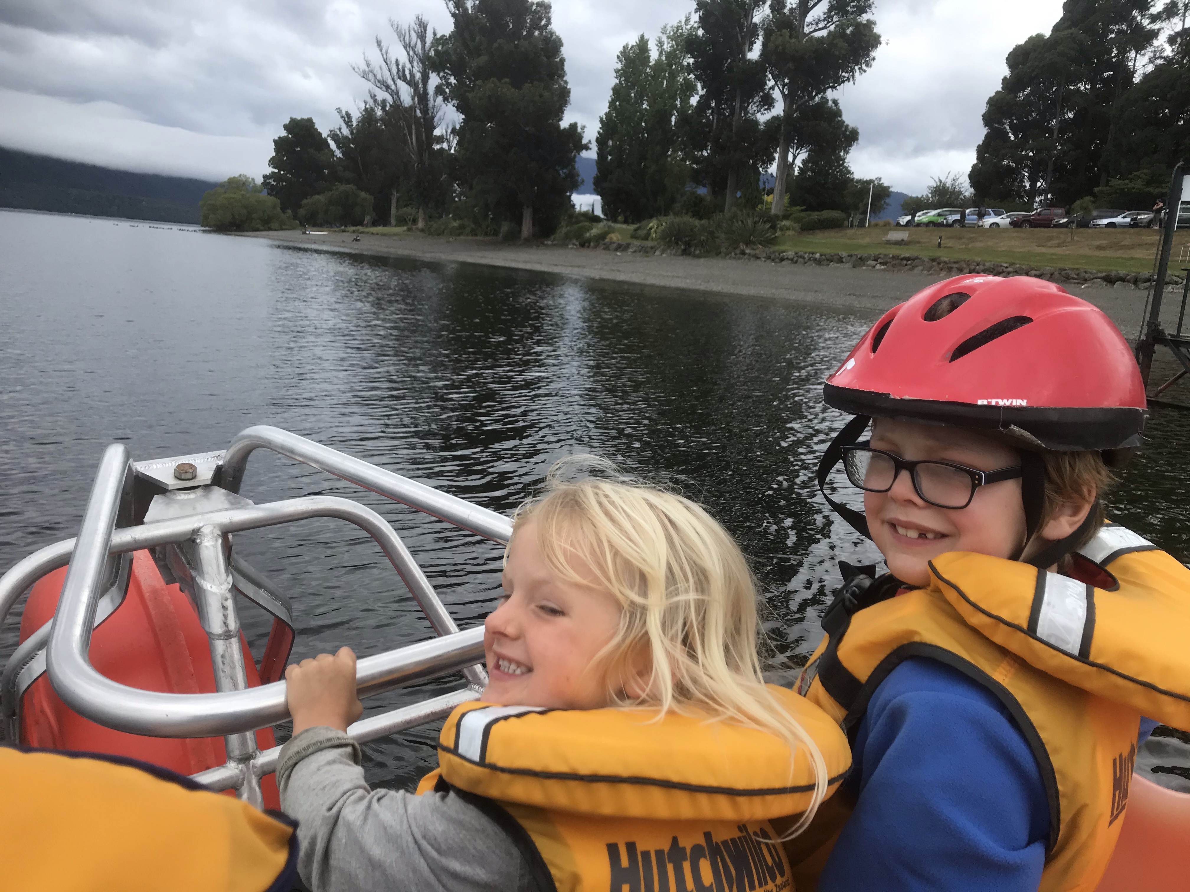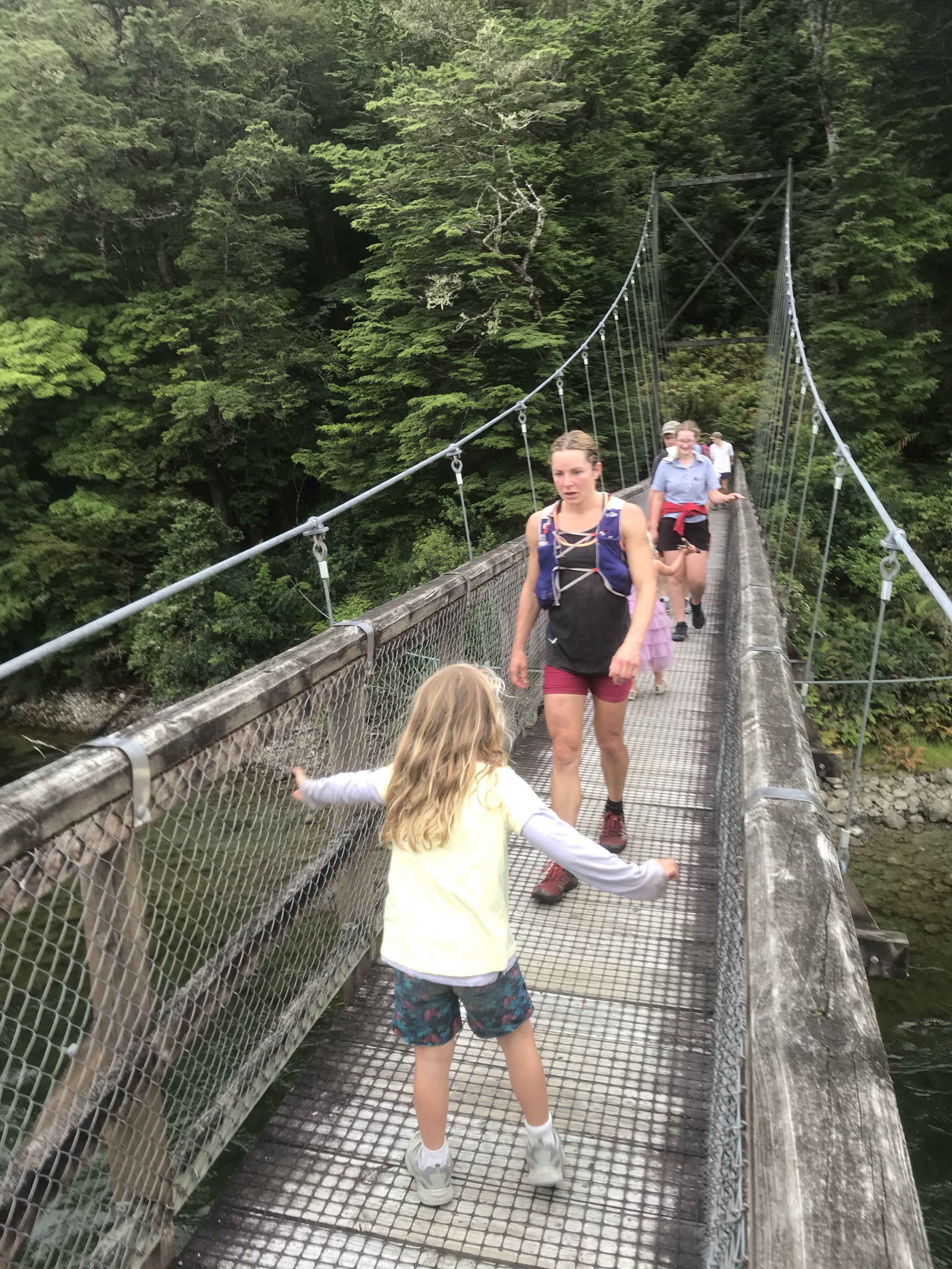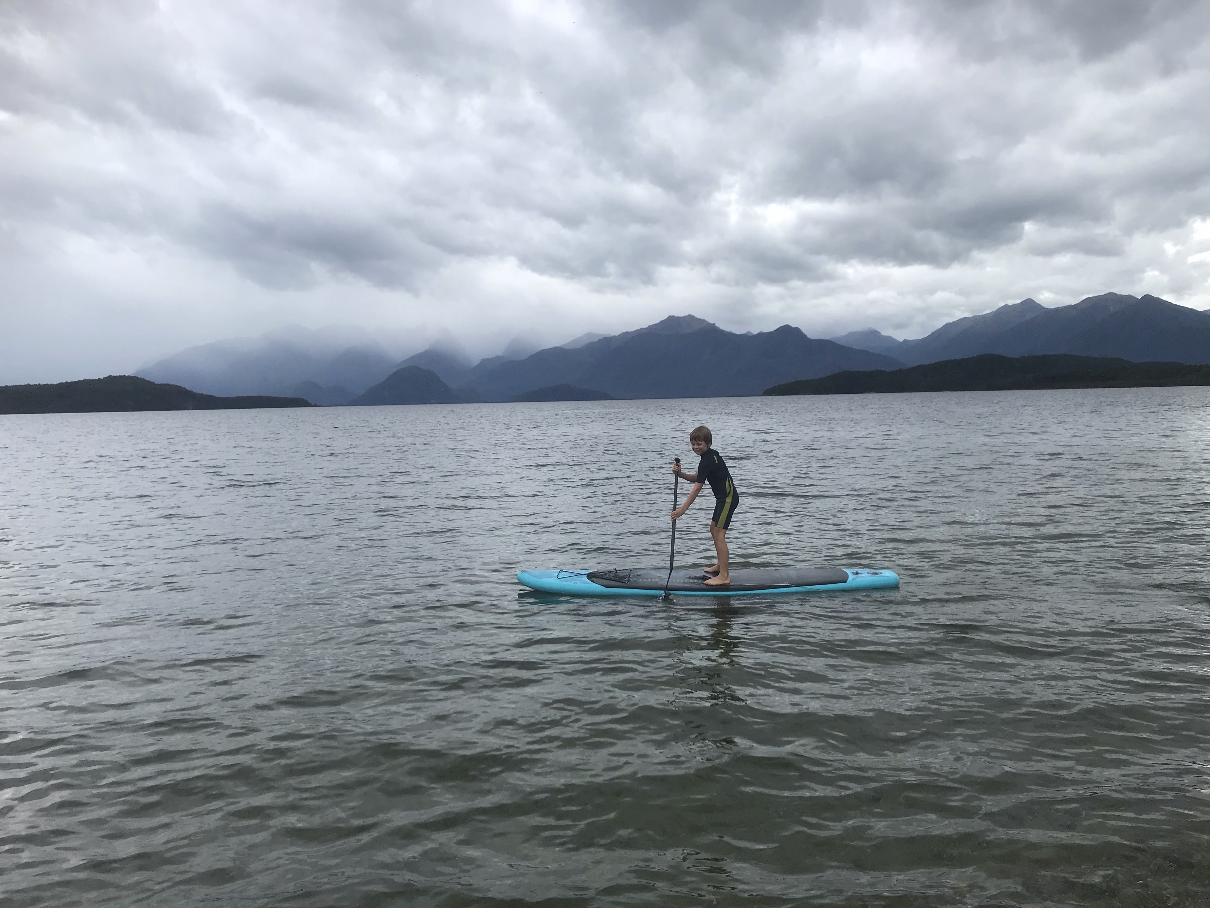 More dead legs followed (I really should train more for running these things, cycling doesn’t quite work!) and we got some decent weather finally and Em set off into the hills for her big day out. The mini team and I had planned to do a boat trip to the famous Te Anau glow worm caves and after a leisurely breakfast I figured we had plenty of time to squeeze in a bike loop round town and along the lake to catch our 10.15am ferry, about a third of the way round I started to panic as it looked very tight to make the ferry despite me pushing the kids frantically and getting Ethan to race ahead. I had the company on the phone holding the boat for us and we raced on, a shortcut through a long grass field backfired, we went to the wrong harbour and then we got there pouring with sweat 30s late to see our boat pulling out in front of us! Doh! A quick change of plan and we savoured the tourist delights of Te Anau instead starting with a water bike ride, moving onto the excellent mini golf and play park and finishing with a top quality scenic swim and SUP in nearby Lake Manapouri which is framed well by mountains. We then went to the end of the Kepler track and hung out on the amazing Rainbow Reach suspension bridge while waiting for Em to finish her big day out. 5pm came and went which was the planned go back to the campsite for dinner time, and I was remembering how trashed I was two days ago and how she’d appreciate the lift home rather than a hitch, so we waited a bit longer and sure enough at 5.20pm a very tired but relieved looking Emily appeared. Like me she’d loved the mountains but found the long 20km forestry section to finish pretty taxing. A first ultramarathon and a famous one at that surely deserves a slap up dinner so we found a great restaurant (Fat Duck Gastropub) opposite our campsite which was fully booked but we persuaded them to let us sit outside despite the imminent rain and we had a feast of seafood chowder, burgers and fish and chips and even beat the rain back to the tent.