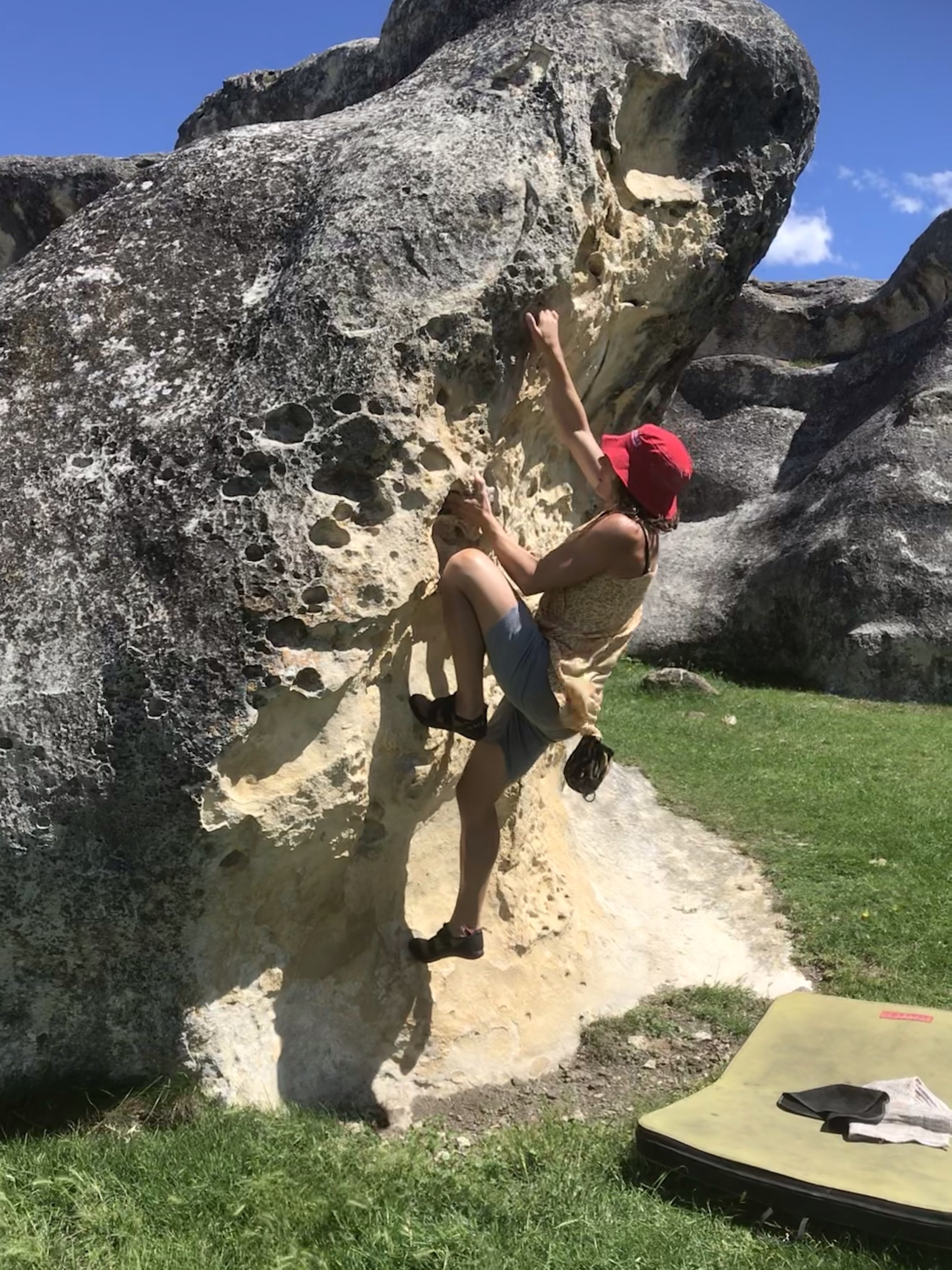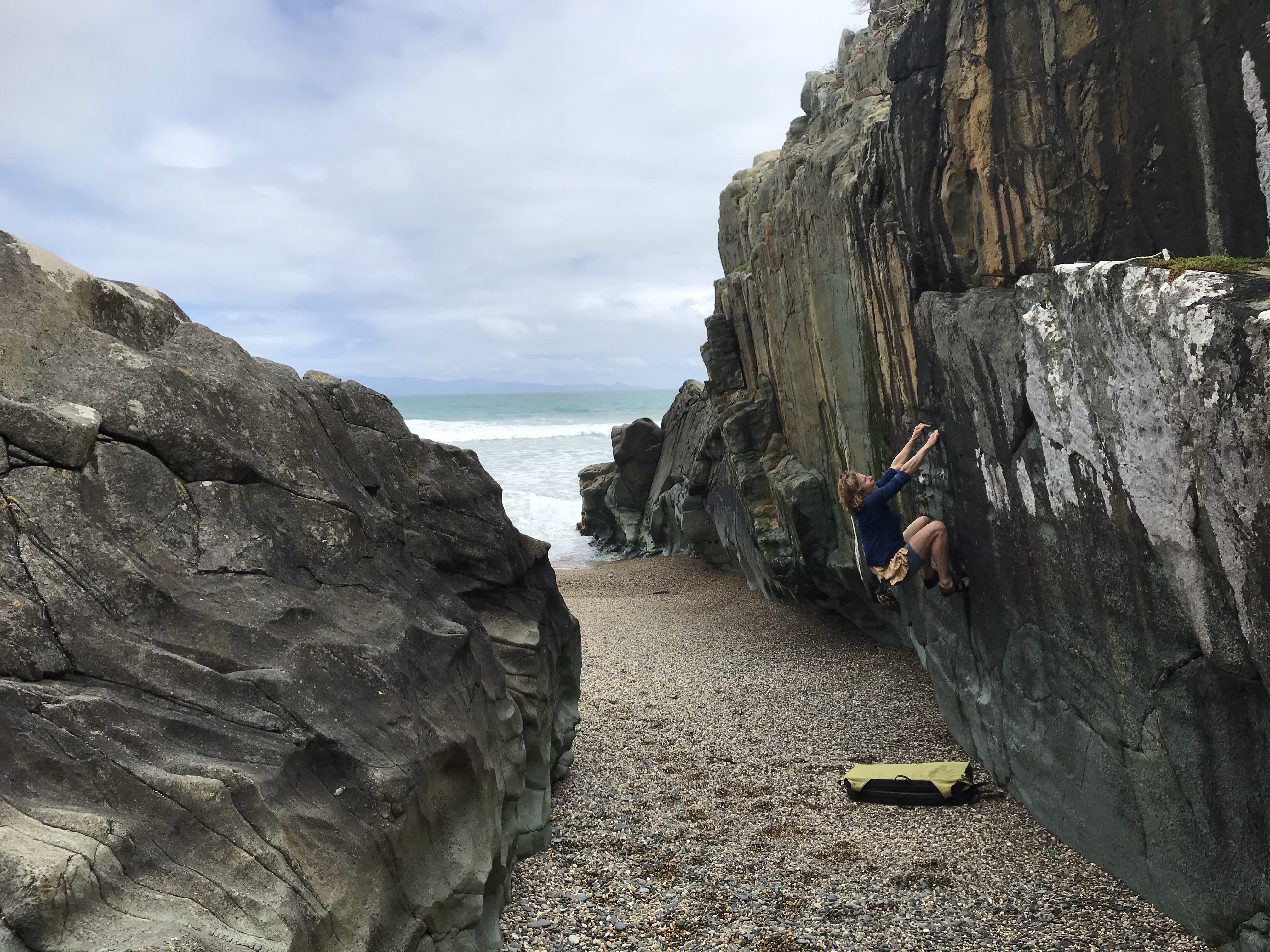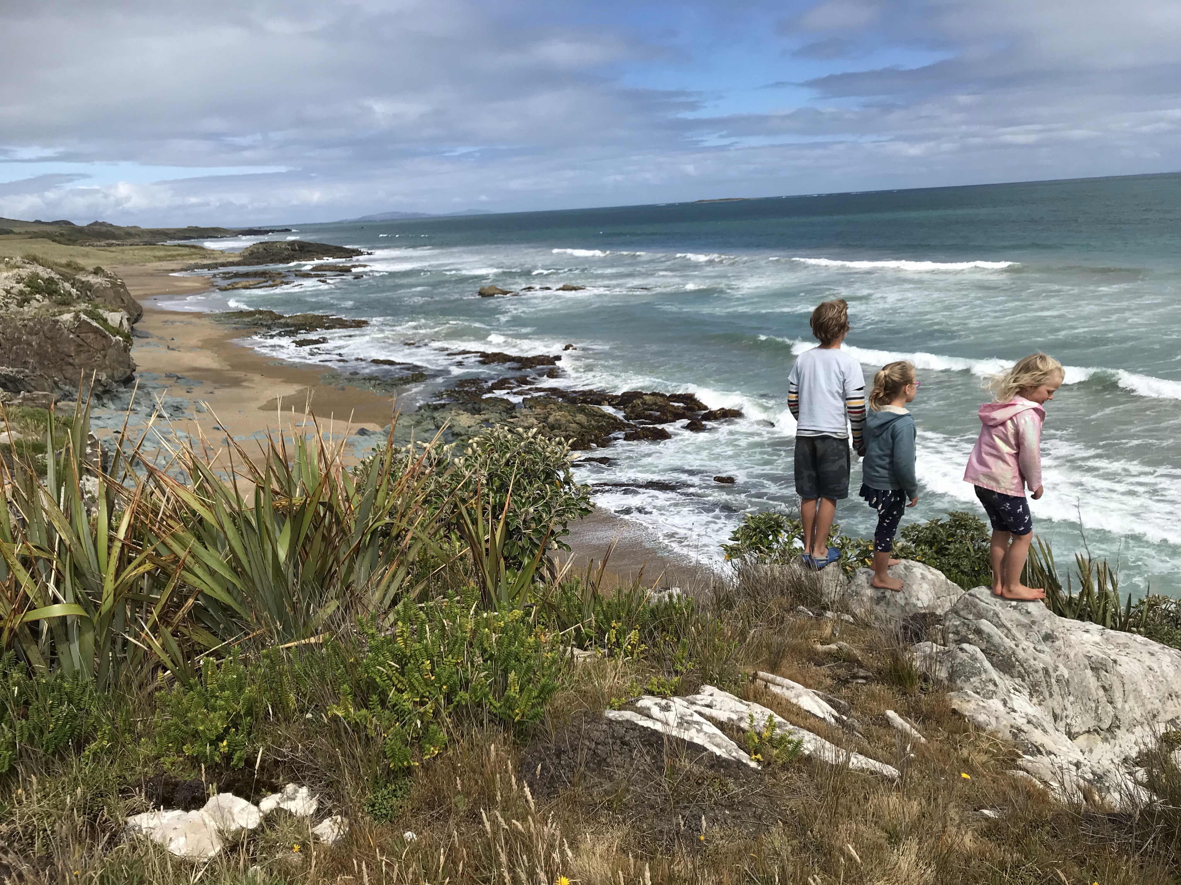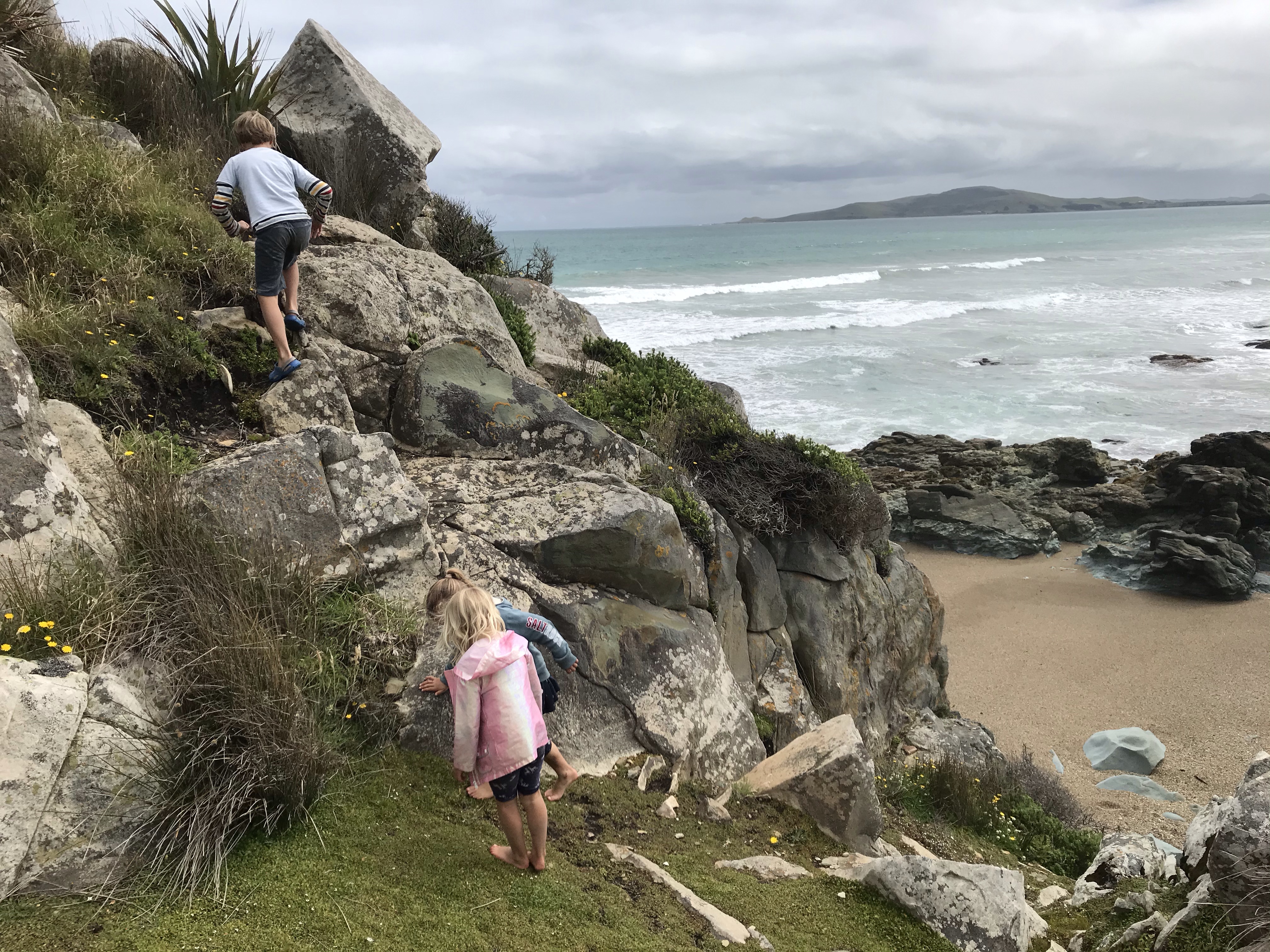 One lucky bonus of missing the unrefundable glow worm caves, was Em was now free to join us on the trip and with a short drive to the south coast ahead we did the tour in the morning before leaving. It was a really nice mix of boating across the lake and into the sounds, followed by a stunningly lit cave with walkways above waterfalls and a glow worm cave boat ride to finish, bit touristy for sure but worth doing all the same. We headed on south eager to see some nice beaches and get some surfing done after all this biking and running. A quick stop between showers at the historic Waiau suspension bridge which had an excellent (if a tad scary) long rope swing out over the river to entertain us all. Our first campsite on the south coast was at a rustic little place called Colac Bay and the campsite next to the pub is a relic from the 60s, run down, ramshackle and super old school, but in a great location near the beach. The first day was yet more sunshine and showers so we had a quick surf in the centre of the beach and then enjoyed the excellent bouldering in hidden rocky coves tucked away at the east end of the beach. A superb selection of boulder problems for all ages, with great views from the cliff tops, very reminiscent of the west coast of Scotland, which is just what we’ve been missing living in New Zealand….