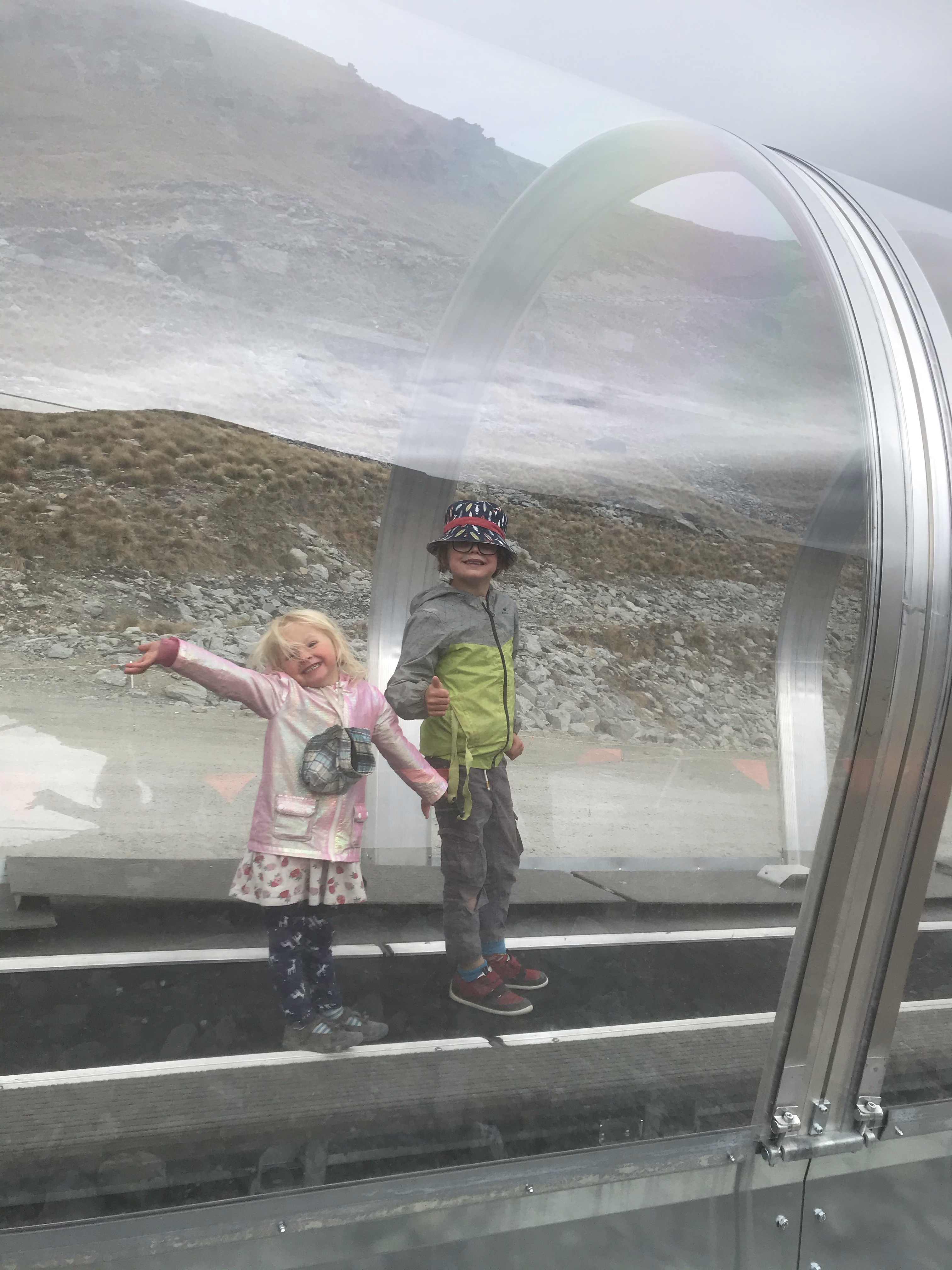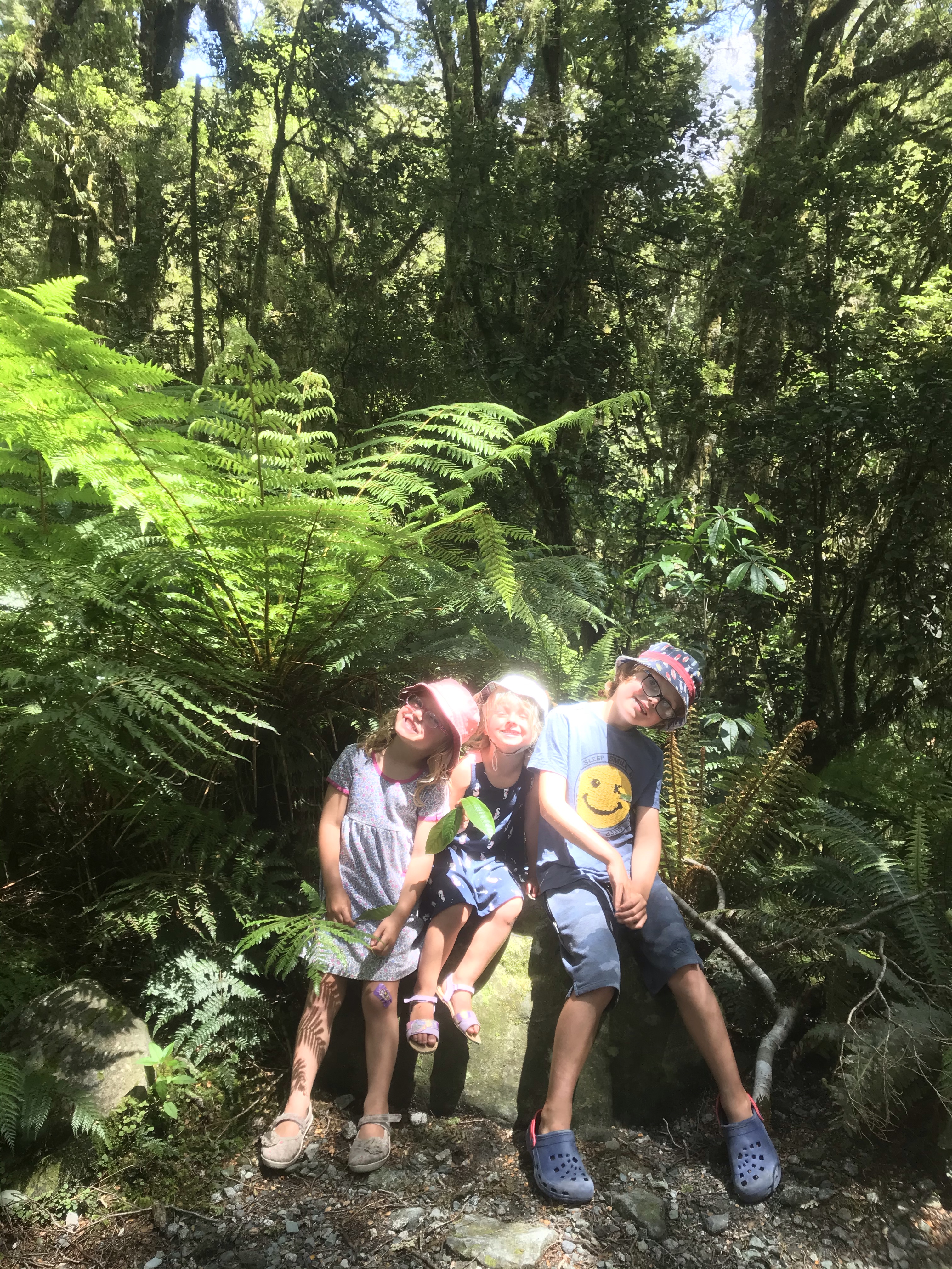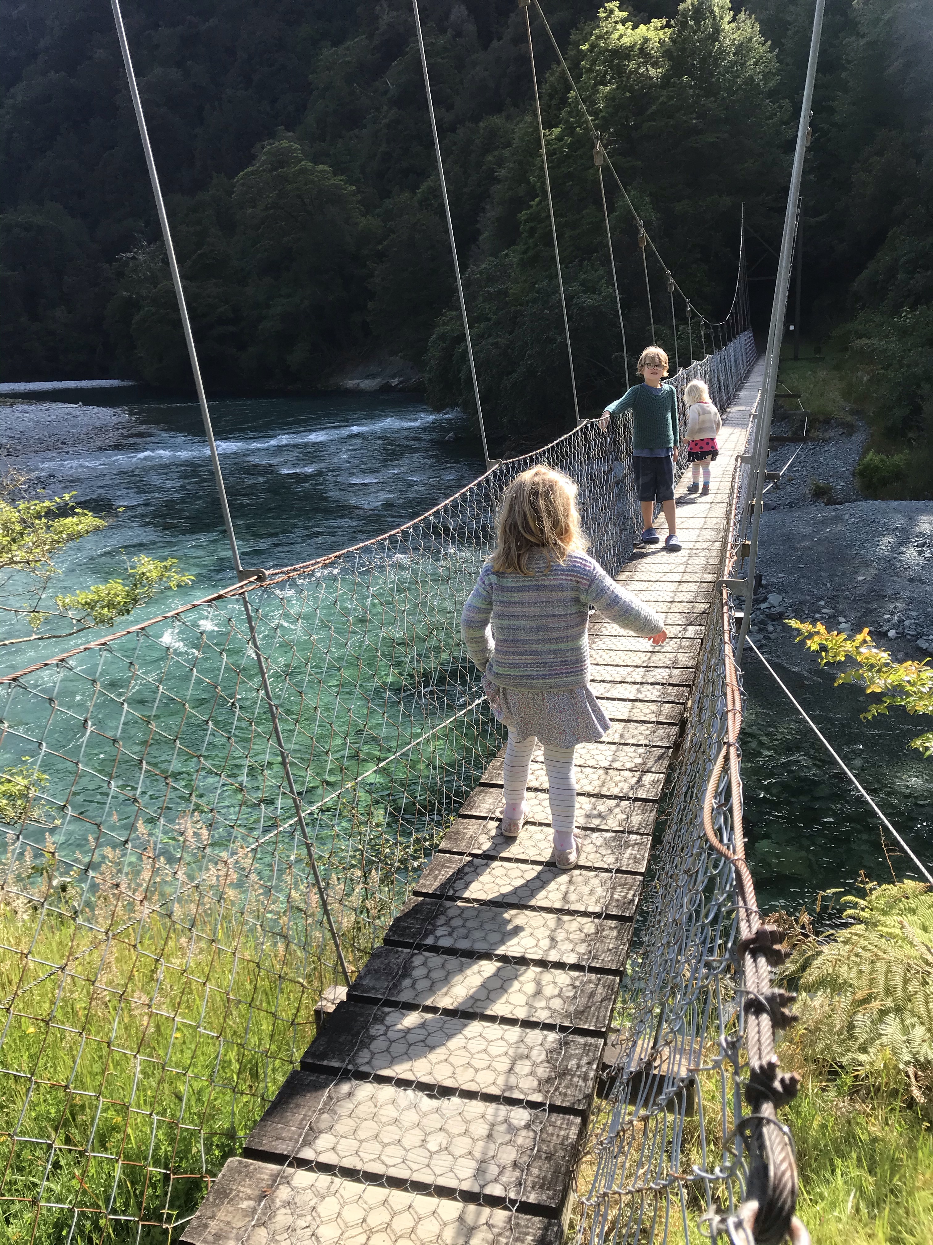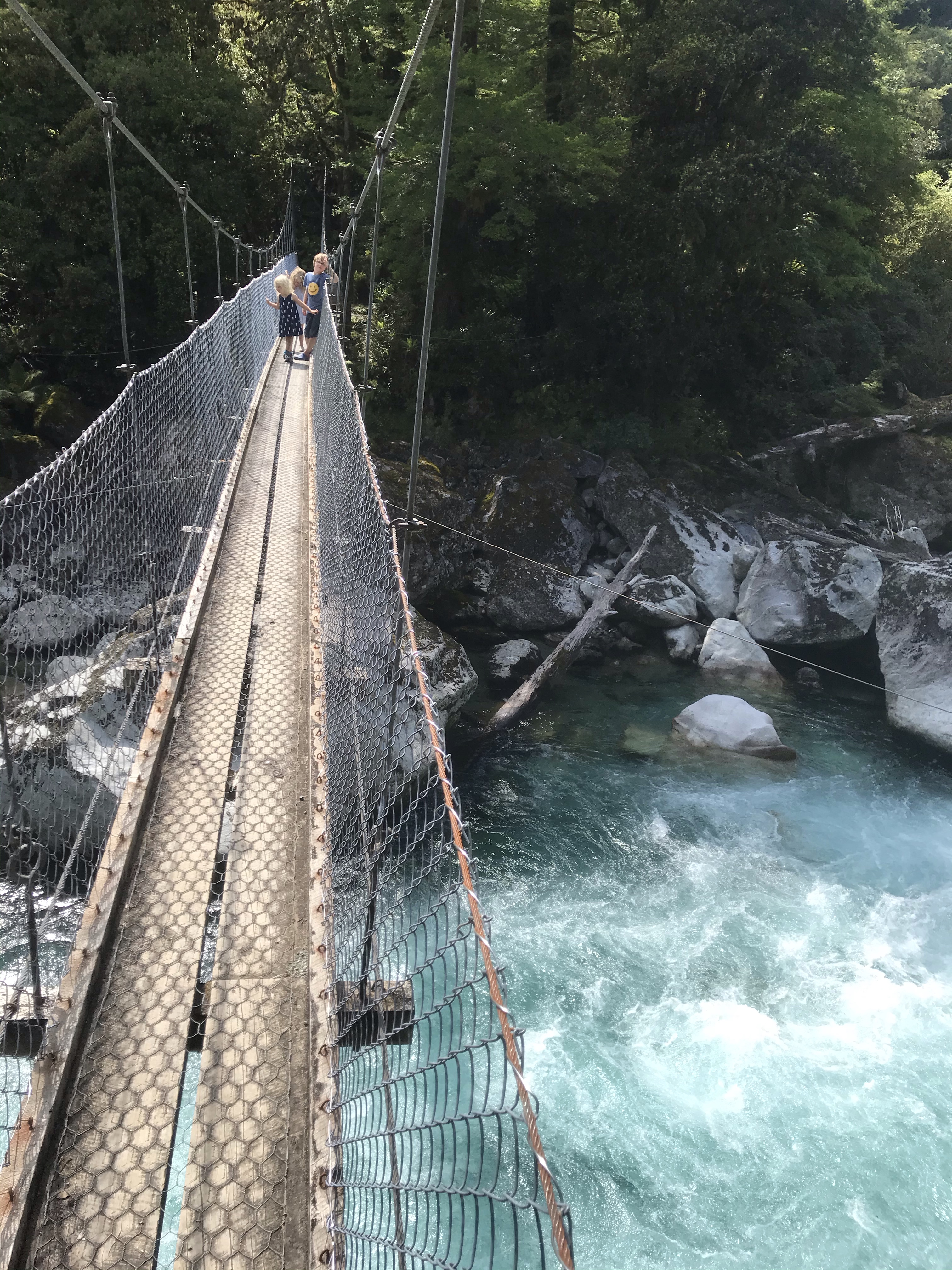 Final day in Fiordland was an epic daddy daycare (you’ve guessed it – probably the best one ever!) while Em went up to tackle the Routeburn++ route I did a couple of days earlier – only her version started in the Holyford Valley and required even more climb to join the Routeburn, she’s tough that girl! With so many choices of walks and sights in the valley I couldn’t decide what the mini team would like best so we just did them all to compare! First up after dropping Em off at the well named very steep Deadman’s Path, was the Hollyford Valley, which has a great swimming hole with rocks to jump off, two impressive suspension bridges and a waterfall.