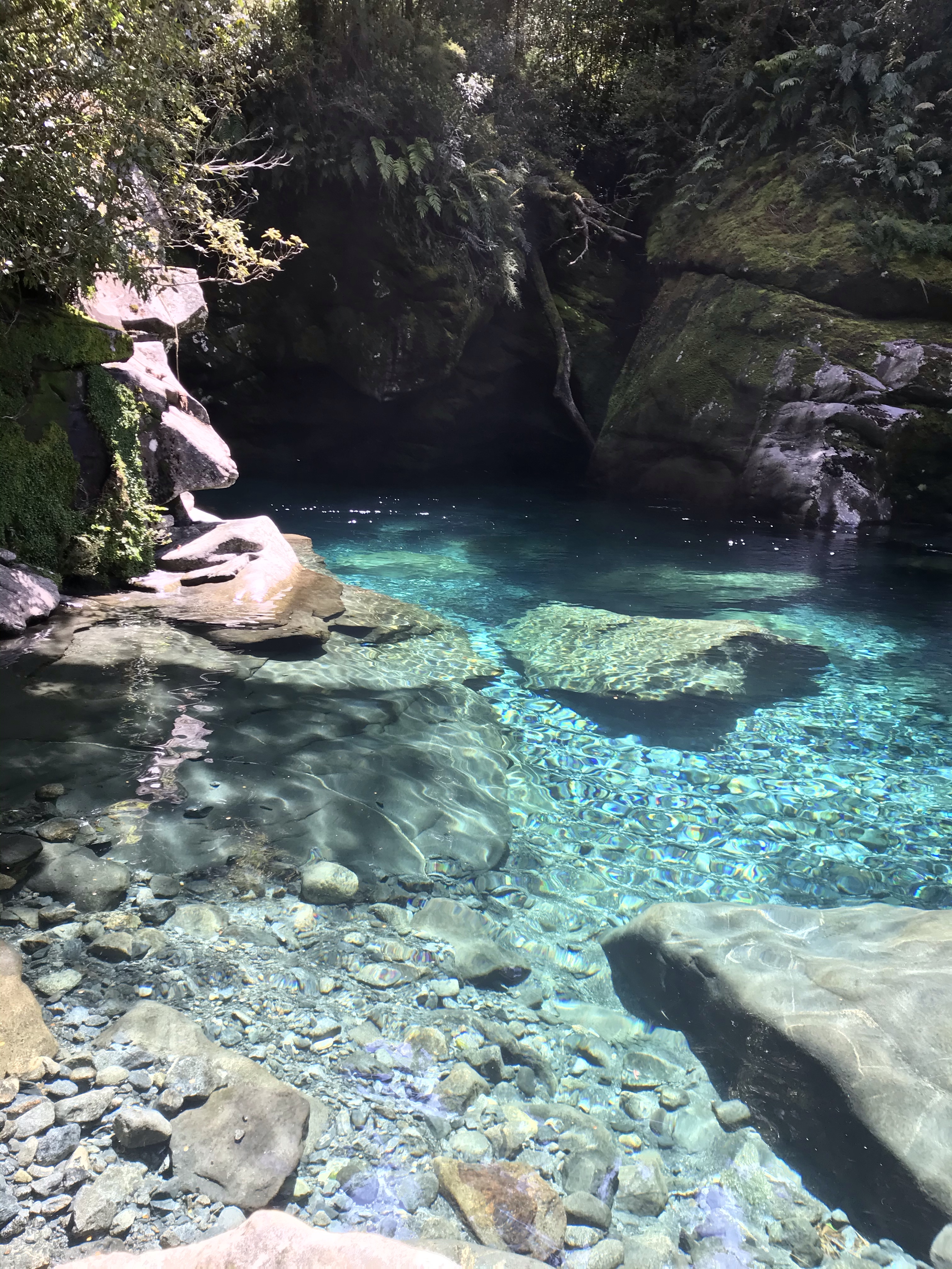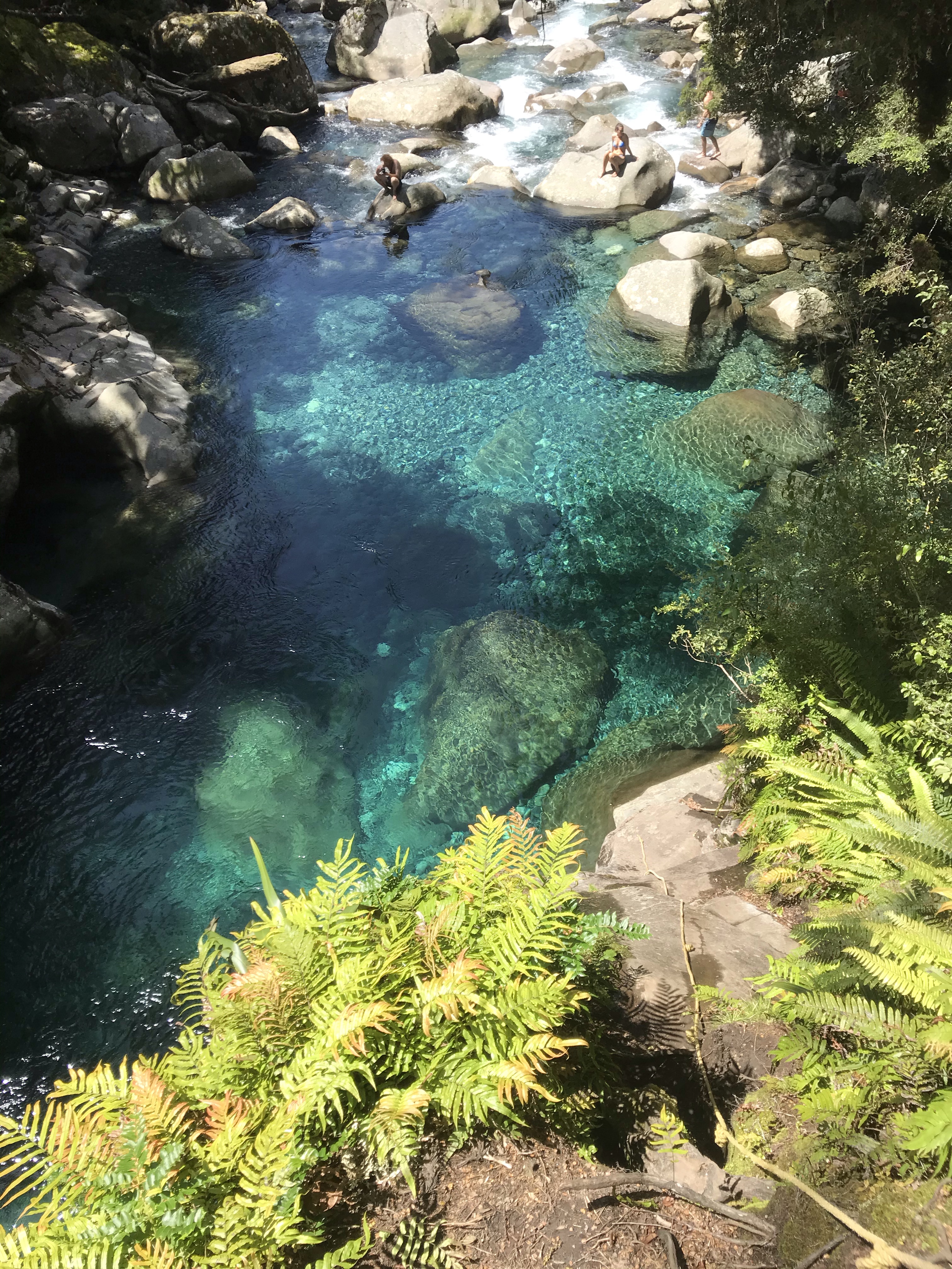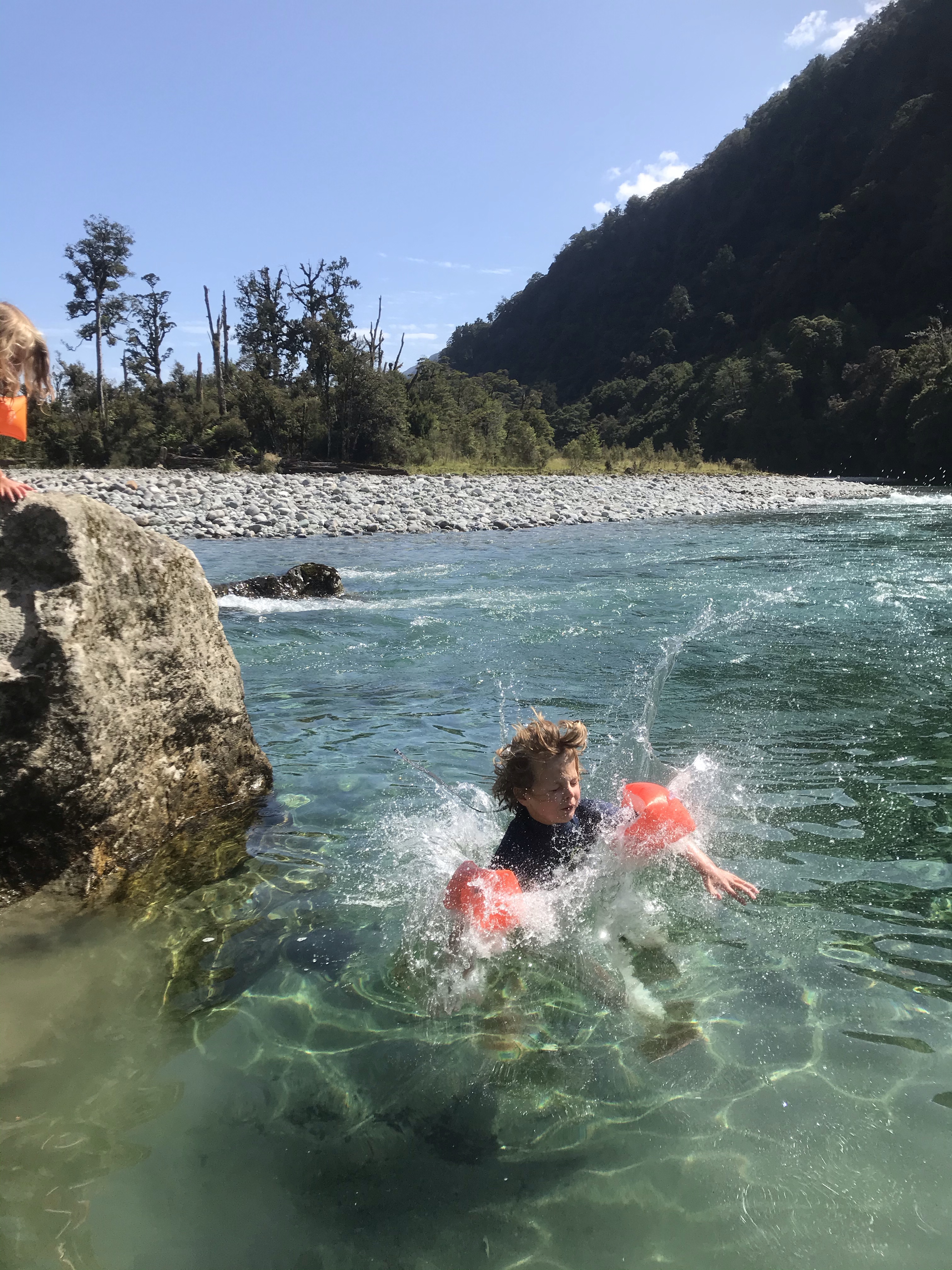 See what I mean about paying for stuff when it’s nature’s playground out there and all totally free. Next up was back through the Homer Tunnel which the kids love to the Chasm (should have done this yesterday with Milford but actually the views on the drive are good enough for a repeat) – this is a bit touristy and the path takes you over a mini gorge with a raging torrent under you, so so but not the usual epic scenery standard. We were walking out and noticed a track down to the river which we thought we’d investigate and were rewarded with a great swimming hole complete with deep blue pools and big jumps for daddy to do some acrobatics off the cliff. (Aka showing off)